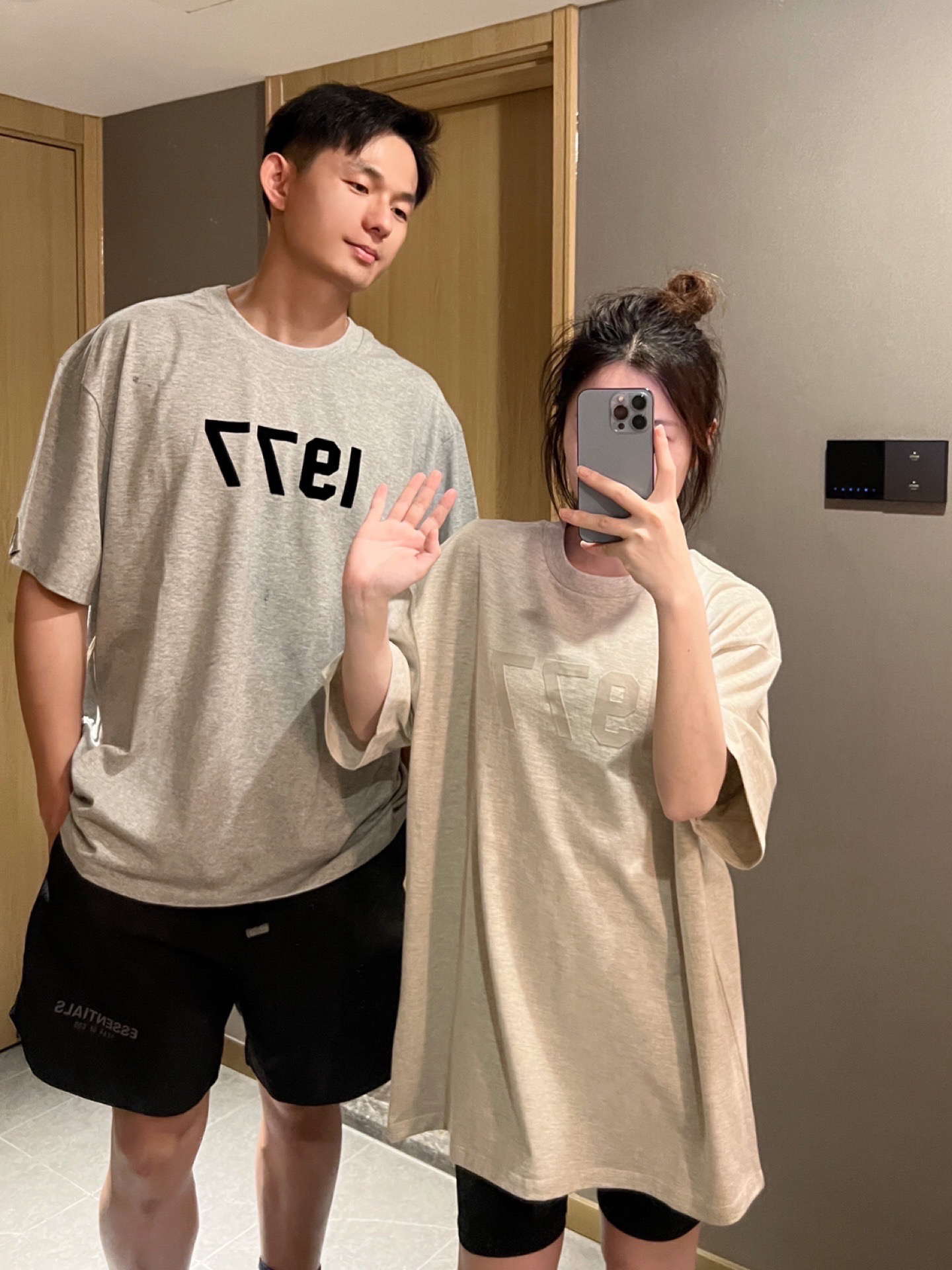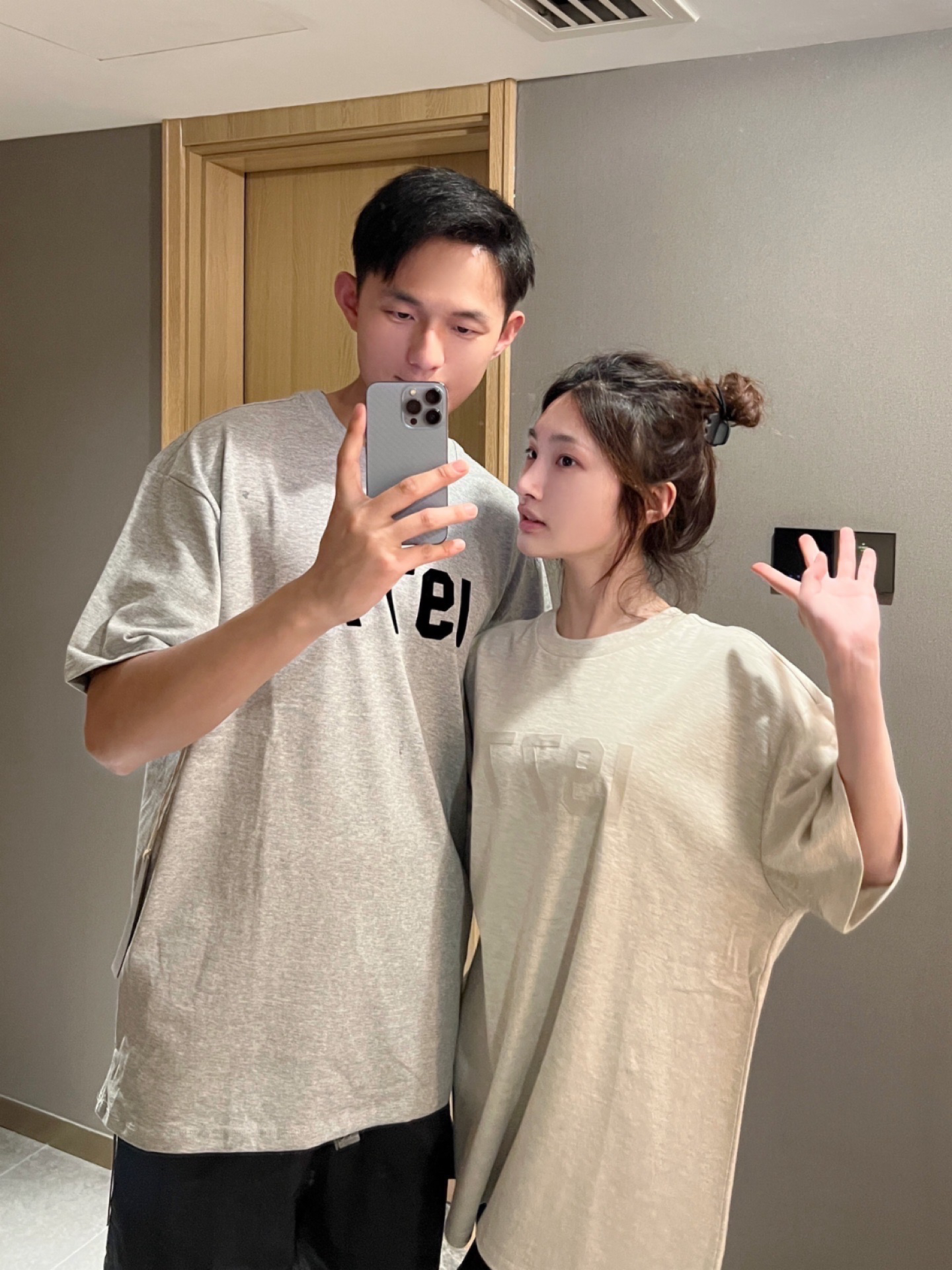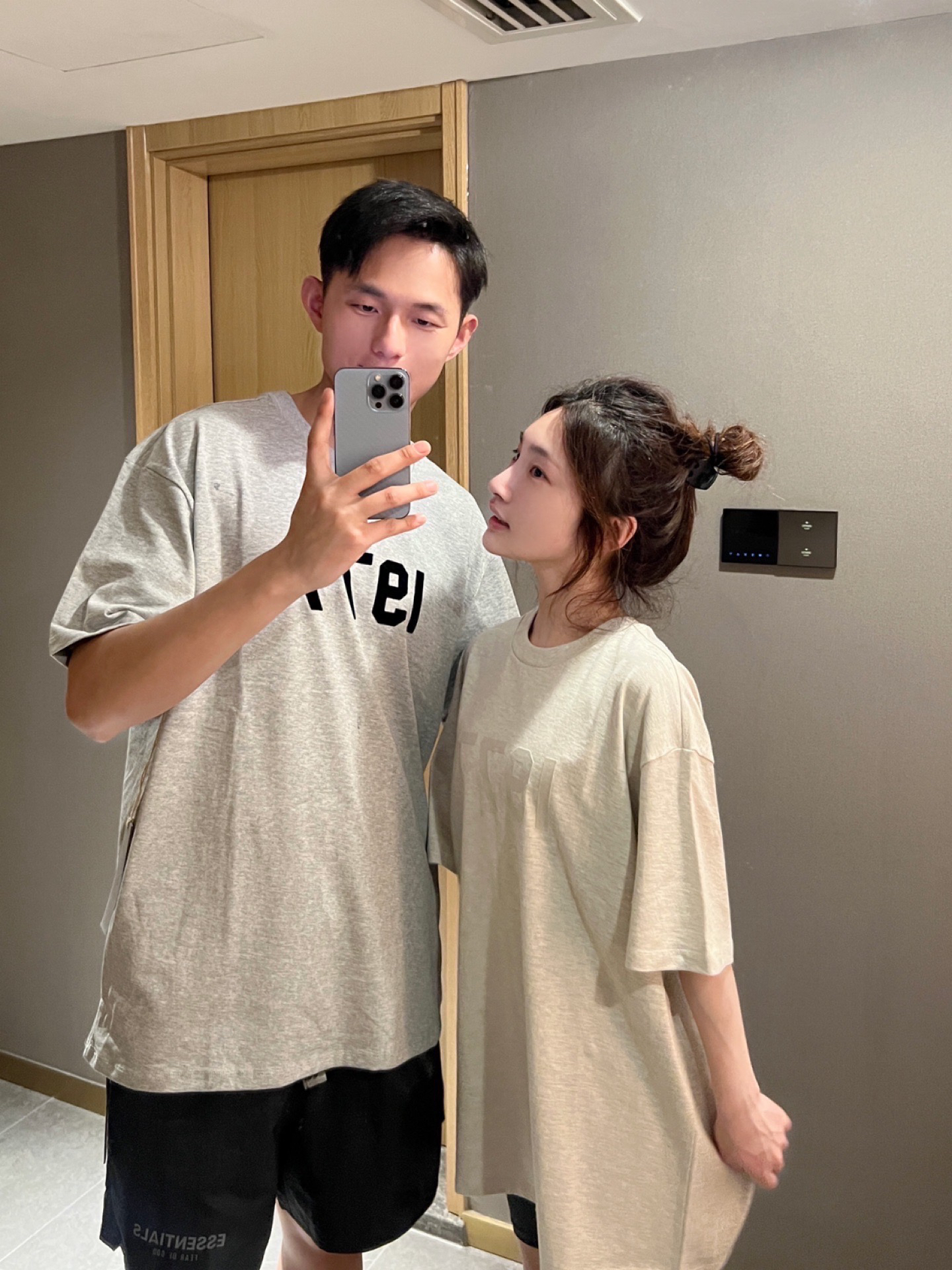 💑情侣短袖穿搭 今日份情侣装短袖T恤分享OOTD: 👔: #Fear of God Essentials - 1977植绒字母短袖 花灰色和花杏色搭配很清爽~ 简洁舒适的款式和版型
