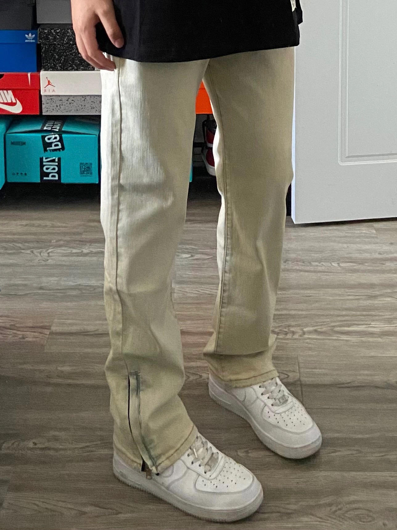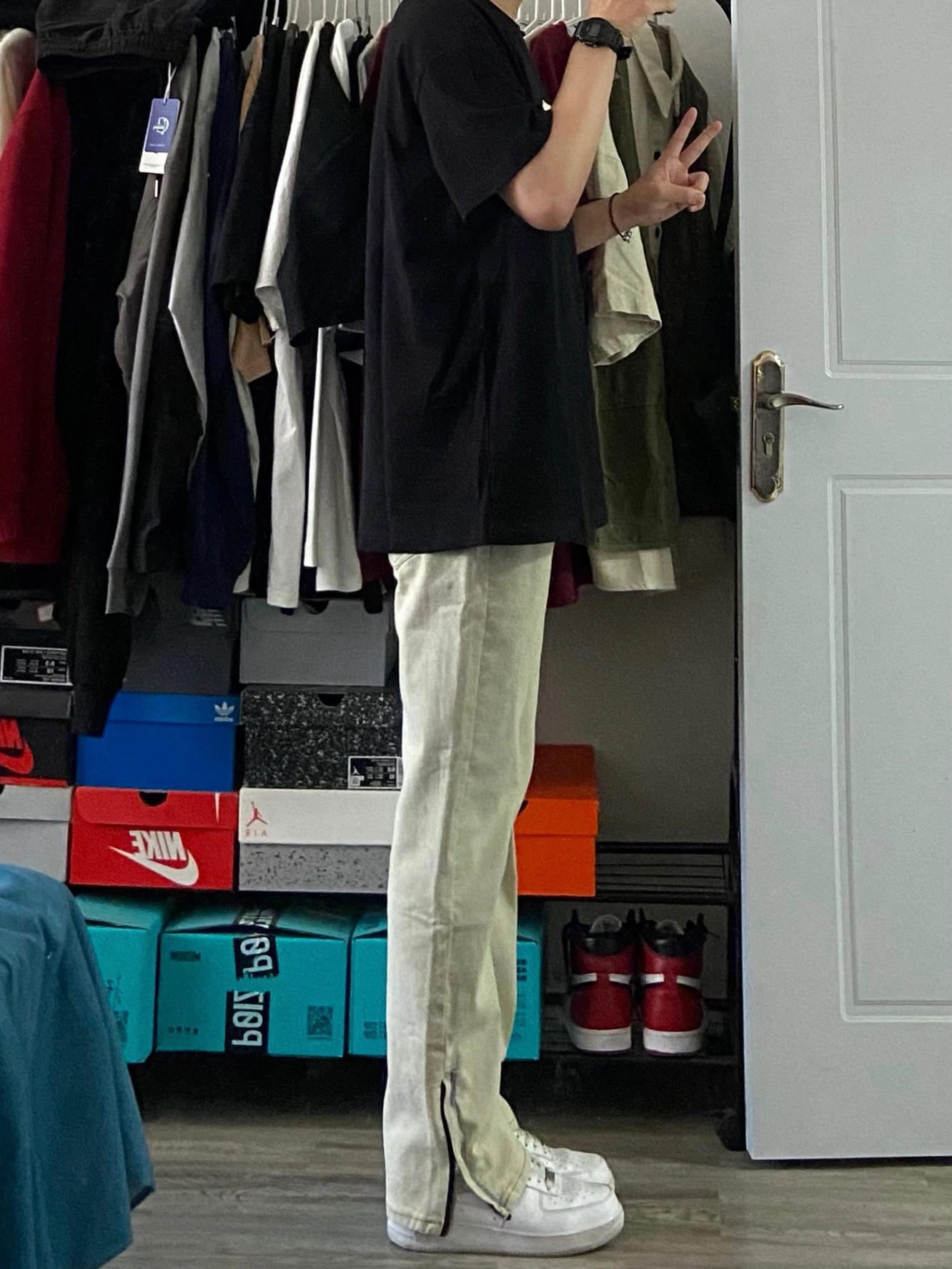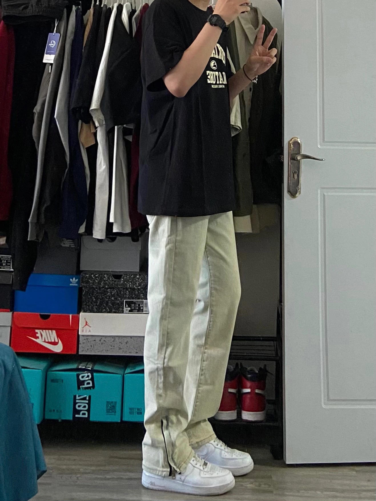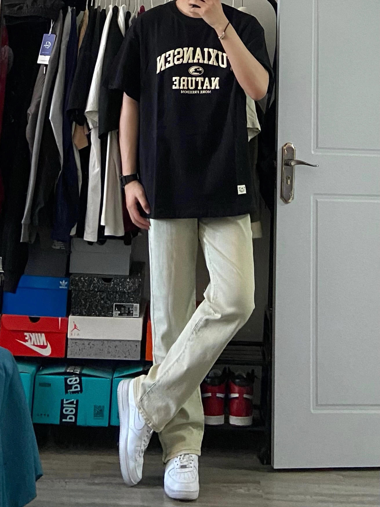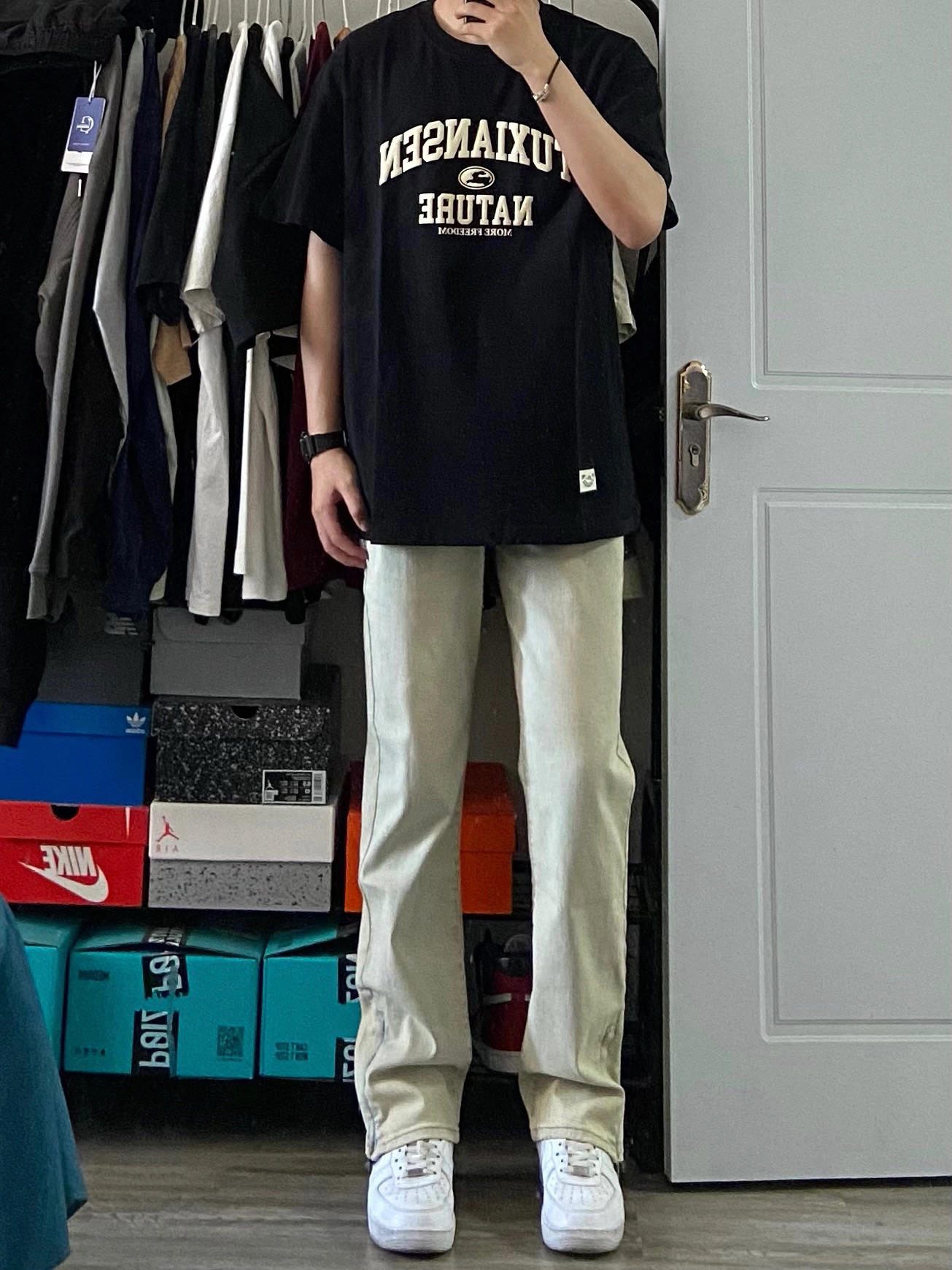 身高|体重:180cm68kg 🧍♂️ 穿搭风格:夏季穿搭 👔 上衣:美式黑色短袖 👖 下装:微喇黄泥色牛仔裤 👟 鞋子:空军一号纯白 🎒配饰:卡西欧小方块