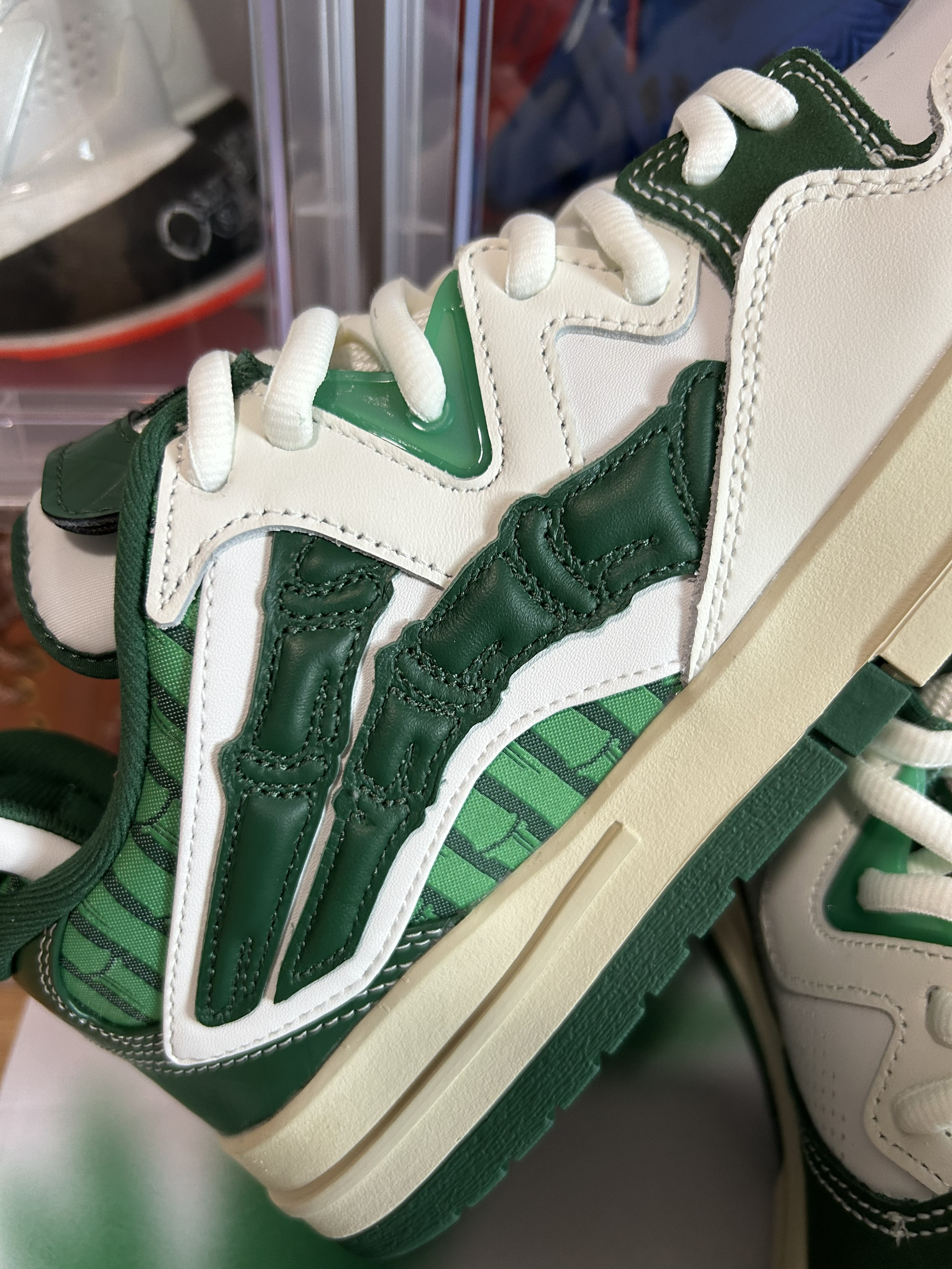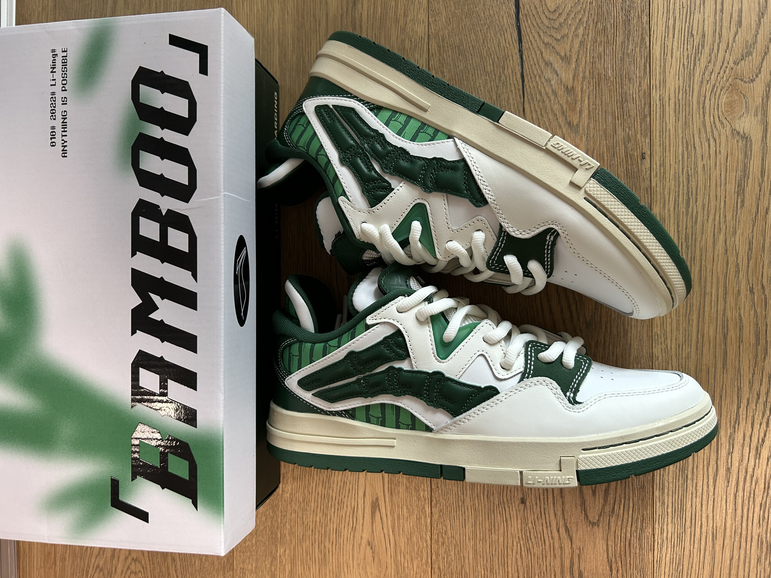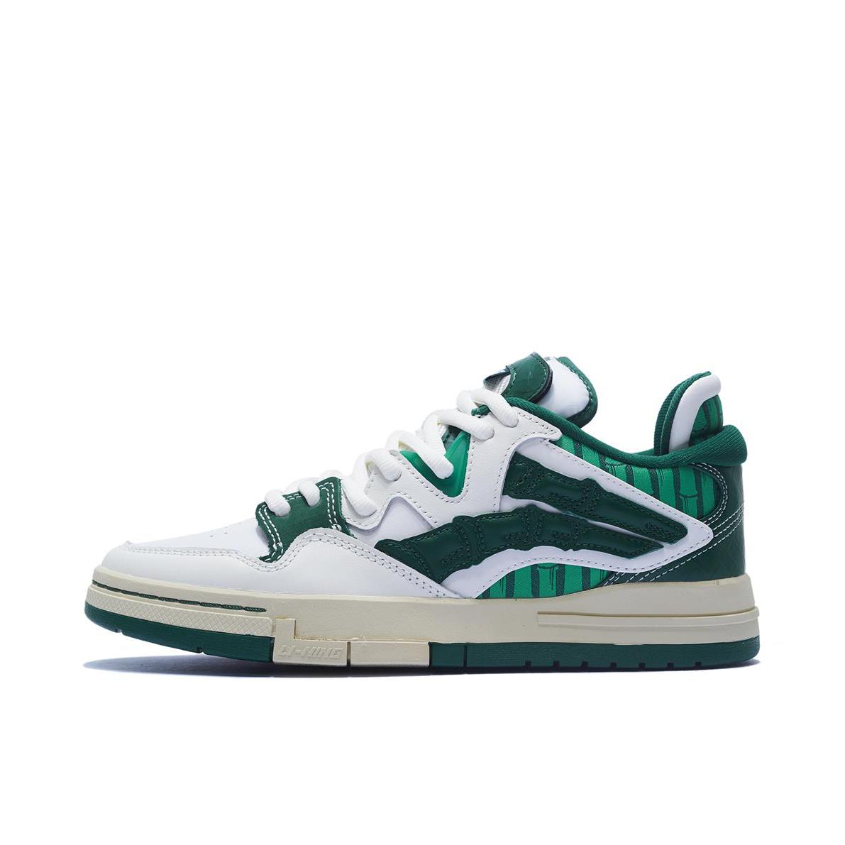球鞋名称:惟吾pro 幸运竹 这双仿竹子形态设计,鞋面采用不同革料拼接设计,鞋身LOGO采用仿竹子形态设计,搭配整体绿色系色调
