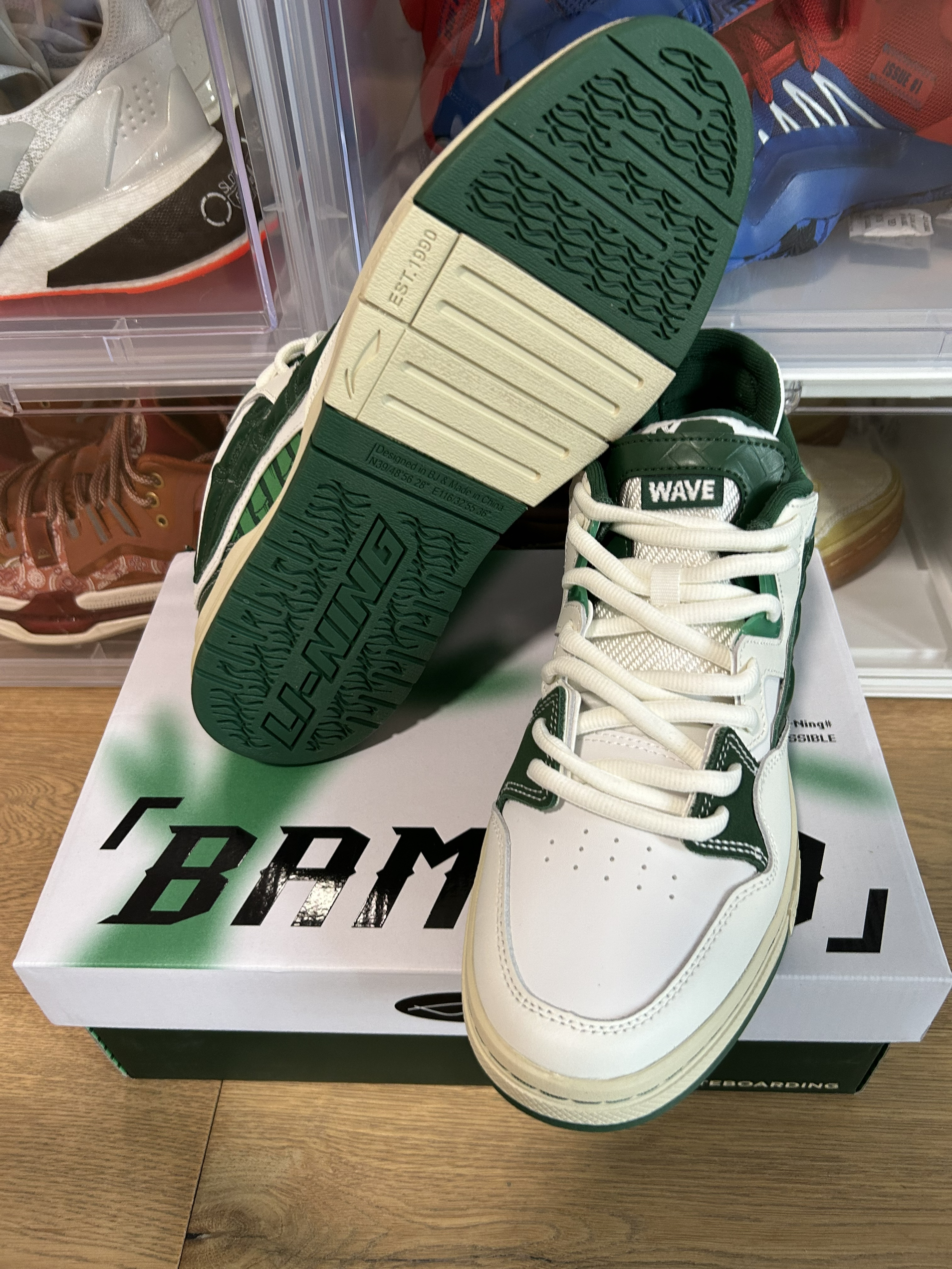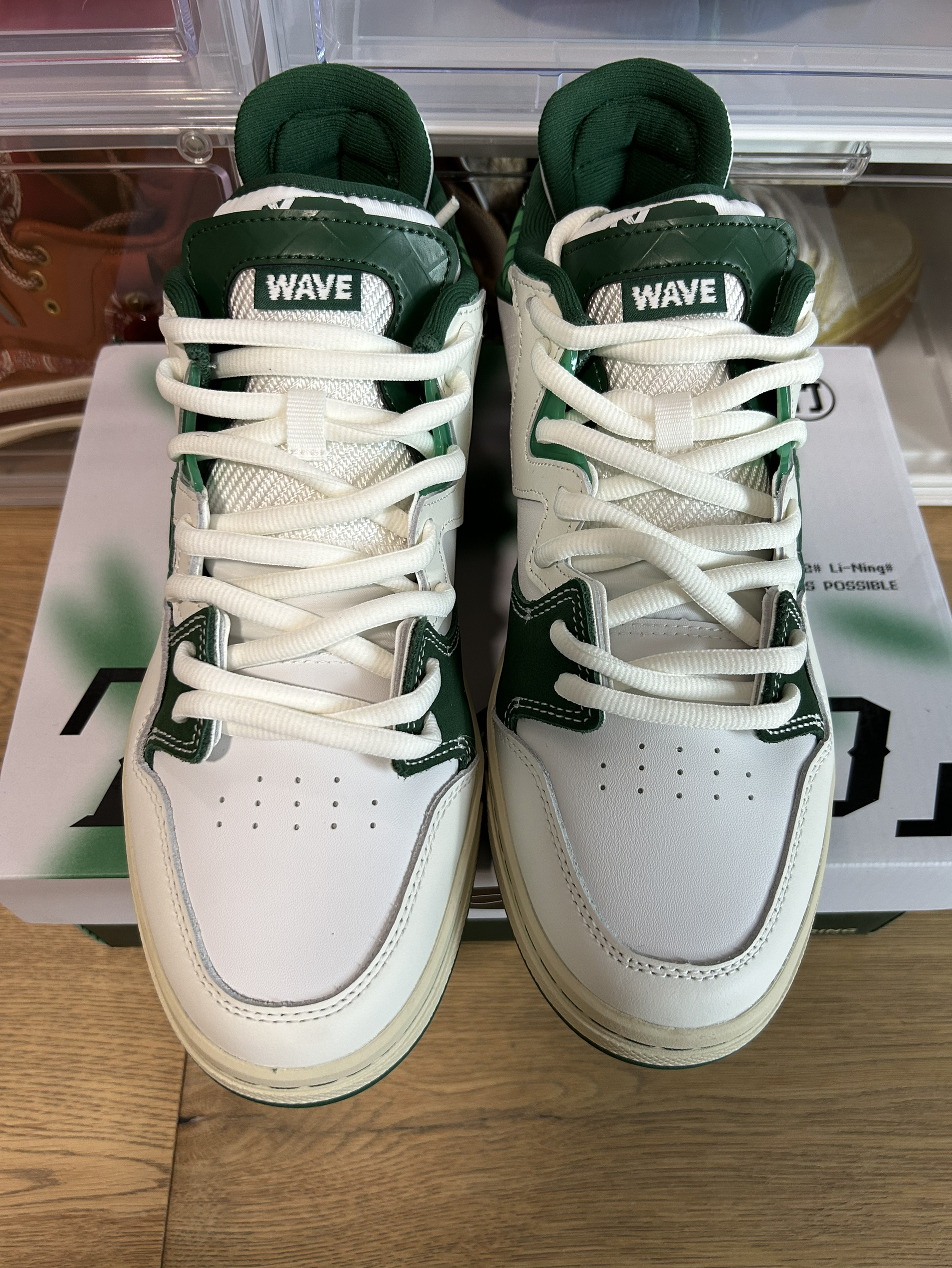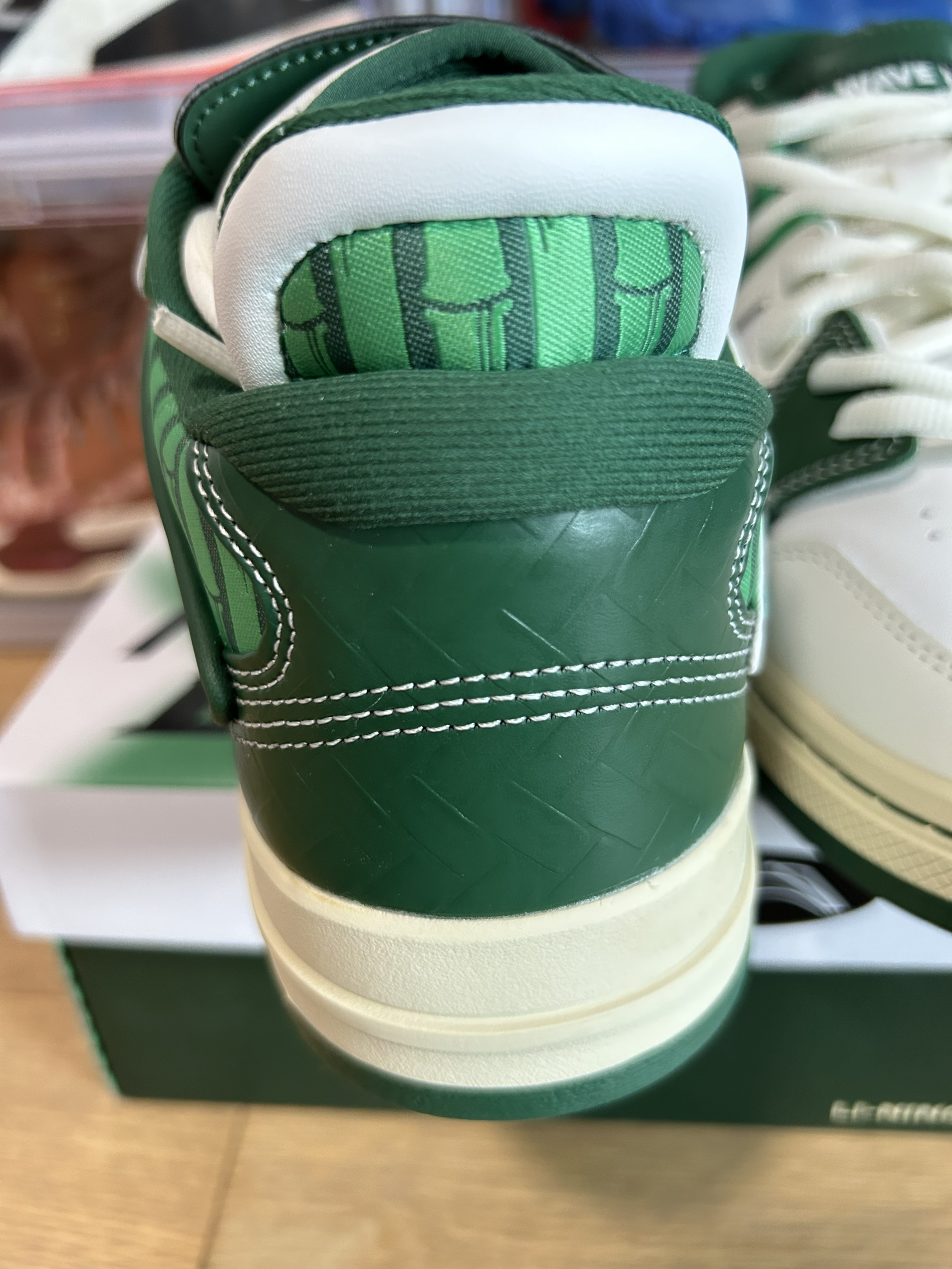 球鞋名称:惟吾pro 幸运竹 这双仿竹子形态设计,鞋面采用不同革料拼接设计,鞋身LOGO采用仿竹子形态设计,搭配整体绿色系色调
