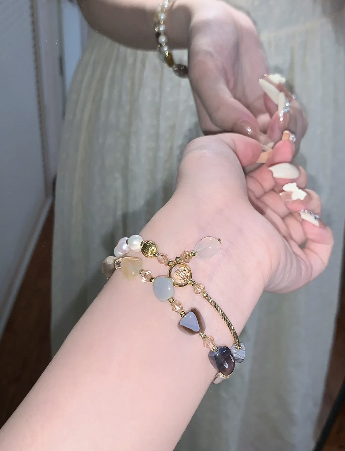 近期收到最喜欢的手链~超有质感 手链可以缠绕两圈,简约又百搭 上面的水晶和玛瑙有独特的花纹 好适合夏天~带上显白,透露着清冷感 这款手链送人也是一个不错的选择,包装盒很完整,也有礼品袋,防尘袋,超有档次的!