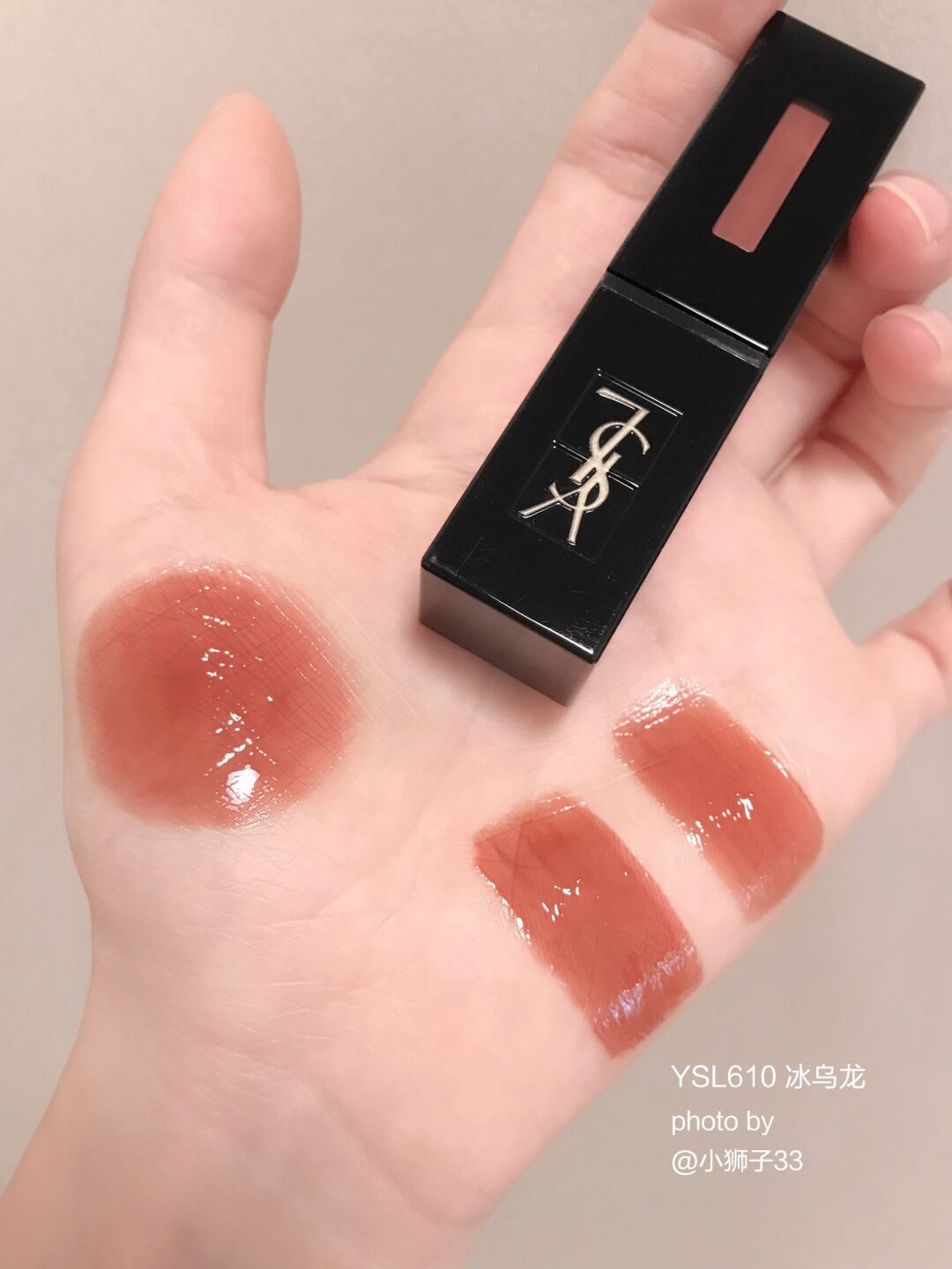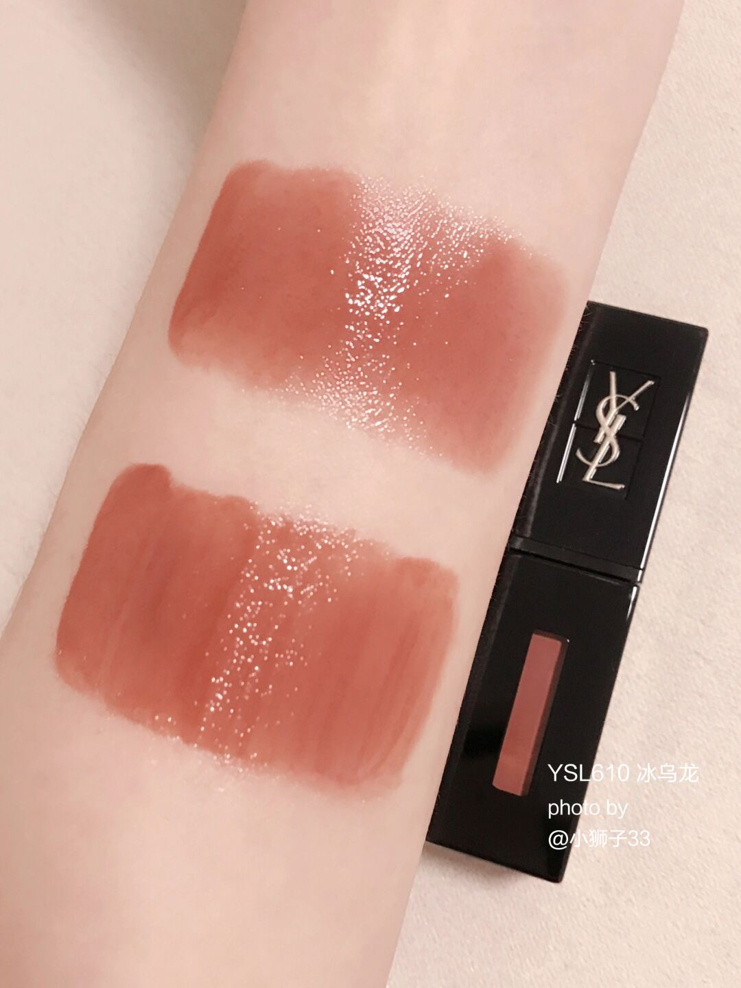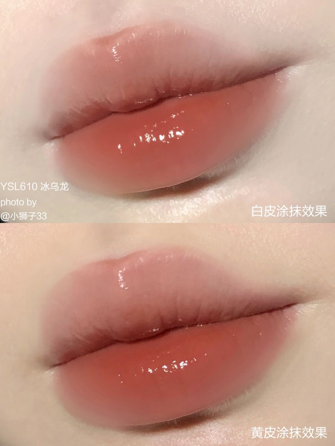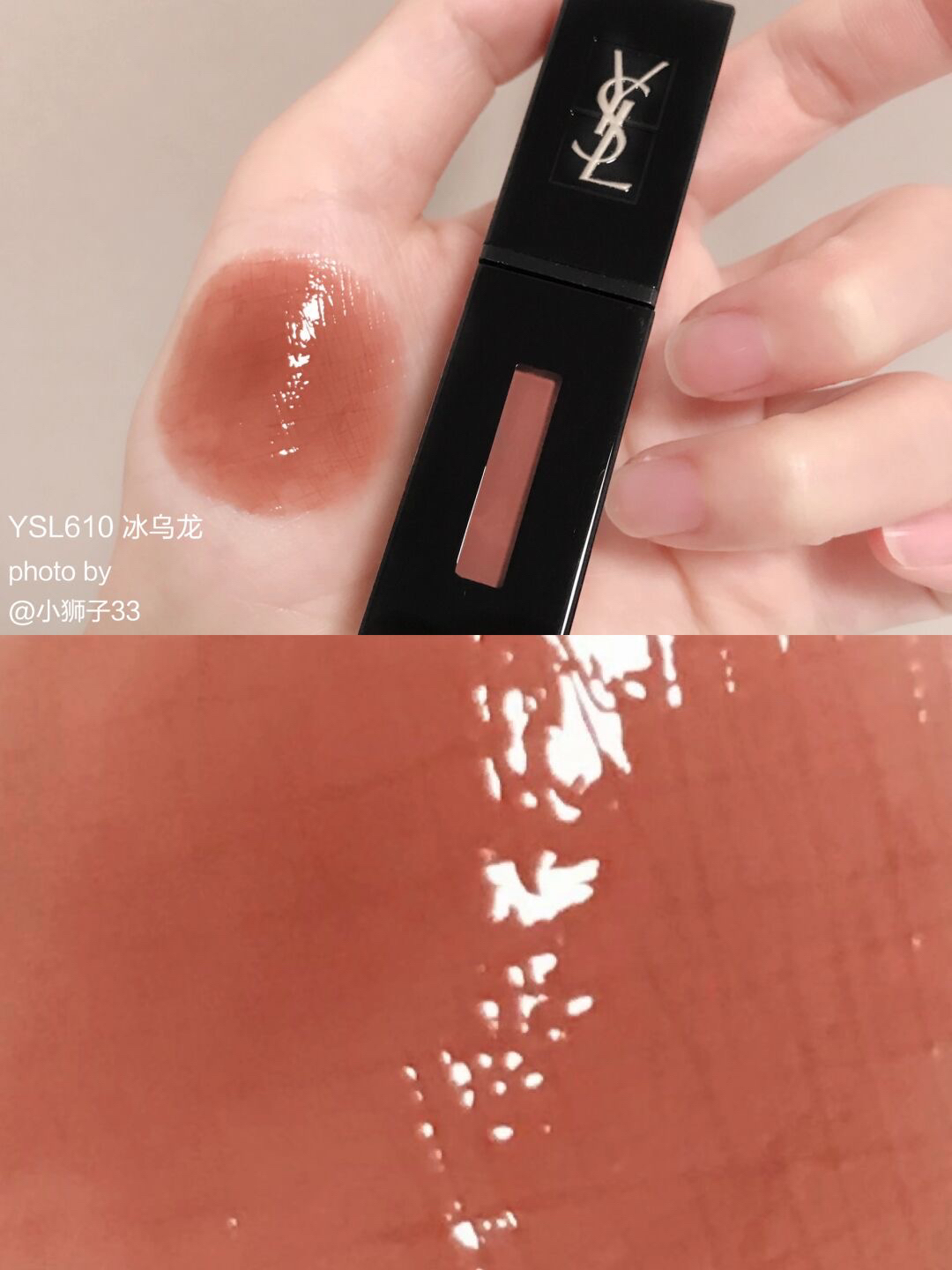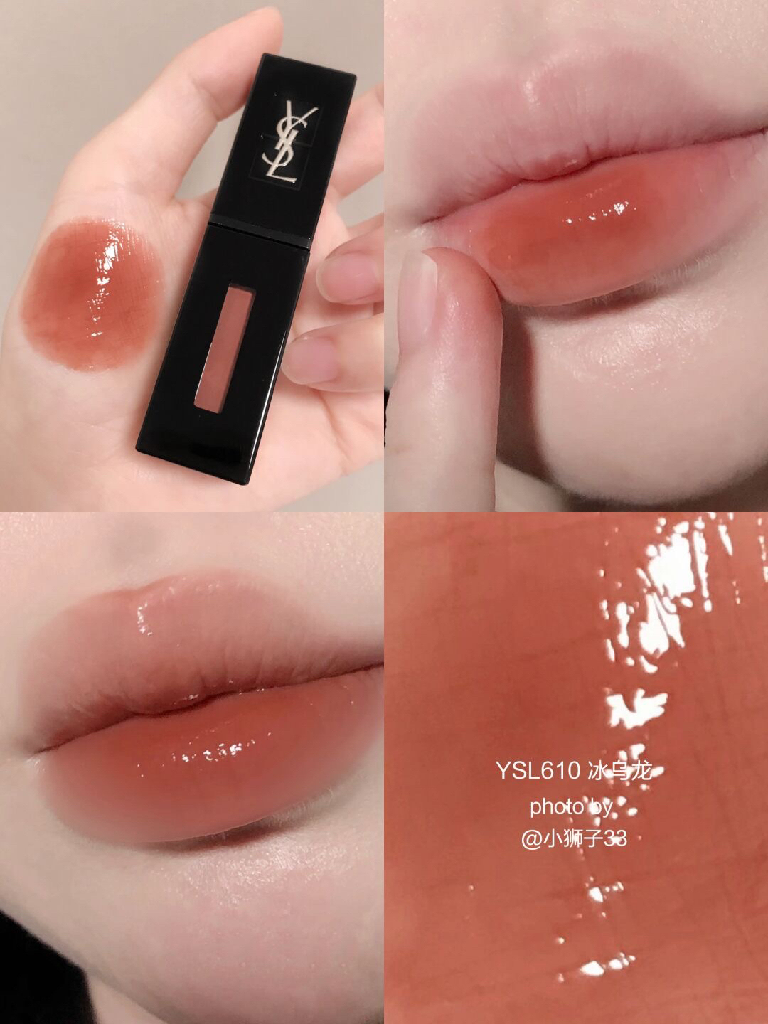 夏天都给我冲~YSL610 真的无平替! 就是爱死这种透亮水光感! 上唇是很透很干净的乌龙茶冻🧋很提气色! 白皮涂就妥妥的伪素颜白月光✨黄皮深唇也能覆盖得很好,温柔又显气质! ▪️黑管质地真的很顶,成膜很快的玻璃糖纸感🧊透亮透亮的谁涂谁嫩~