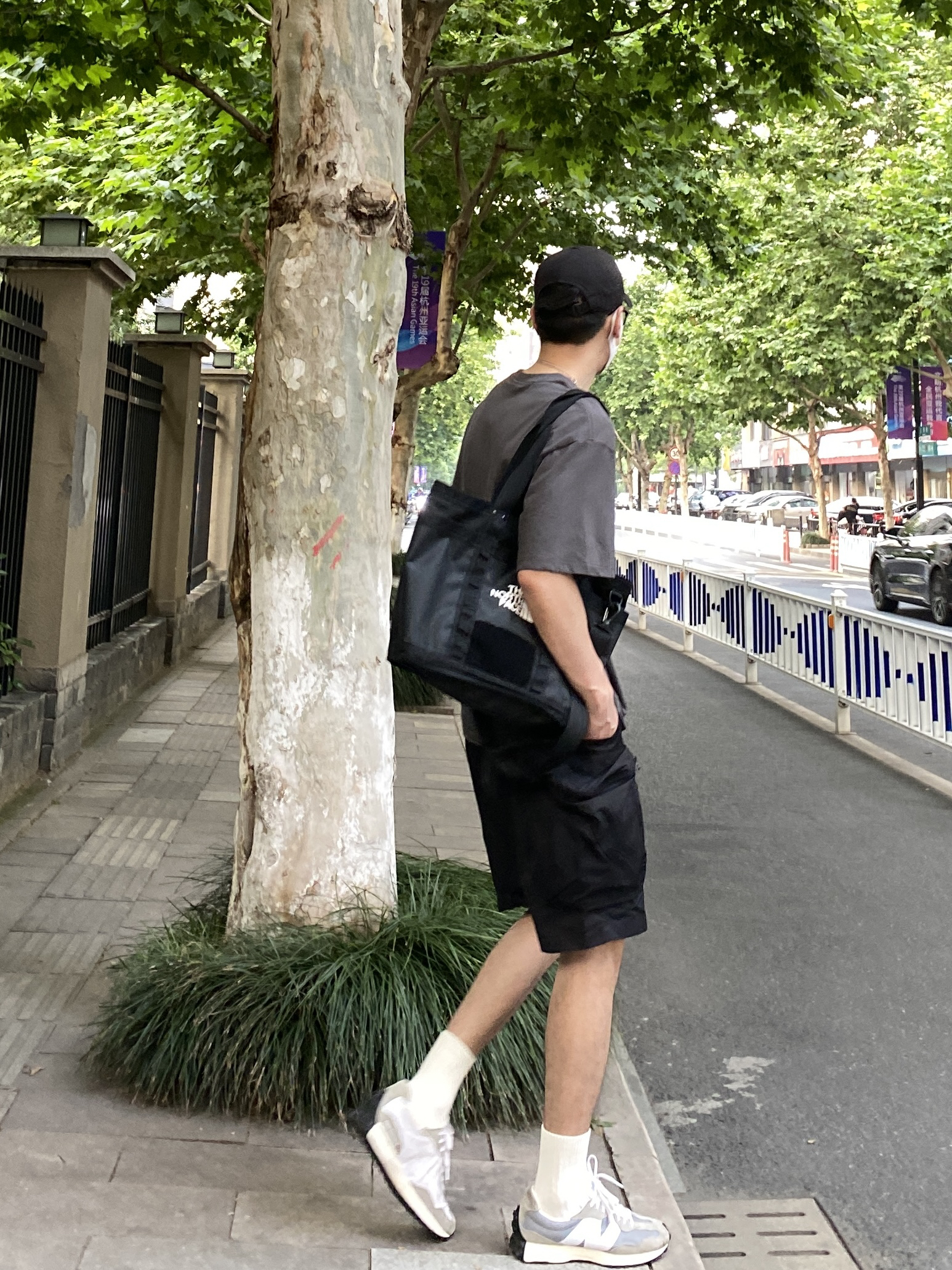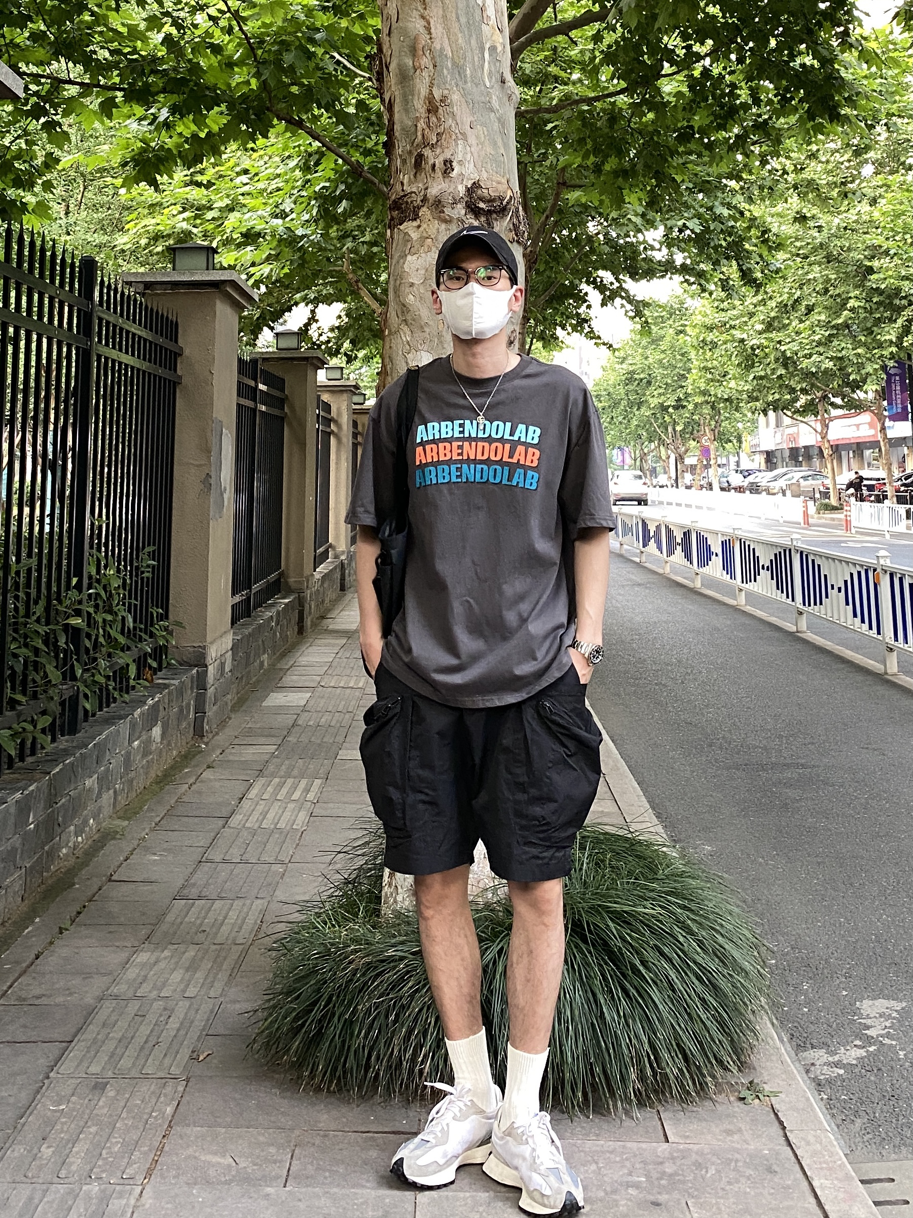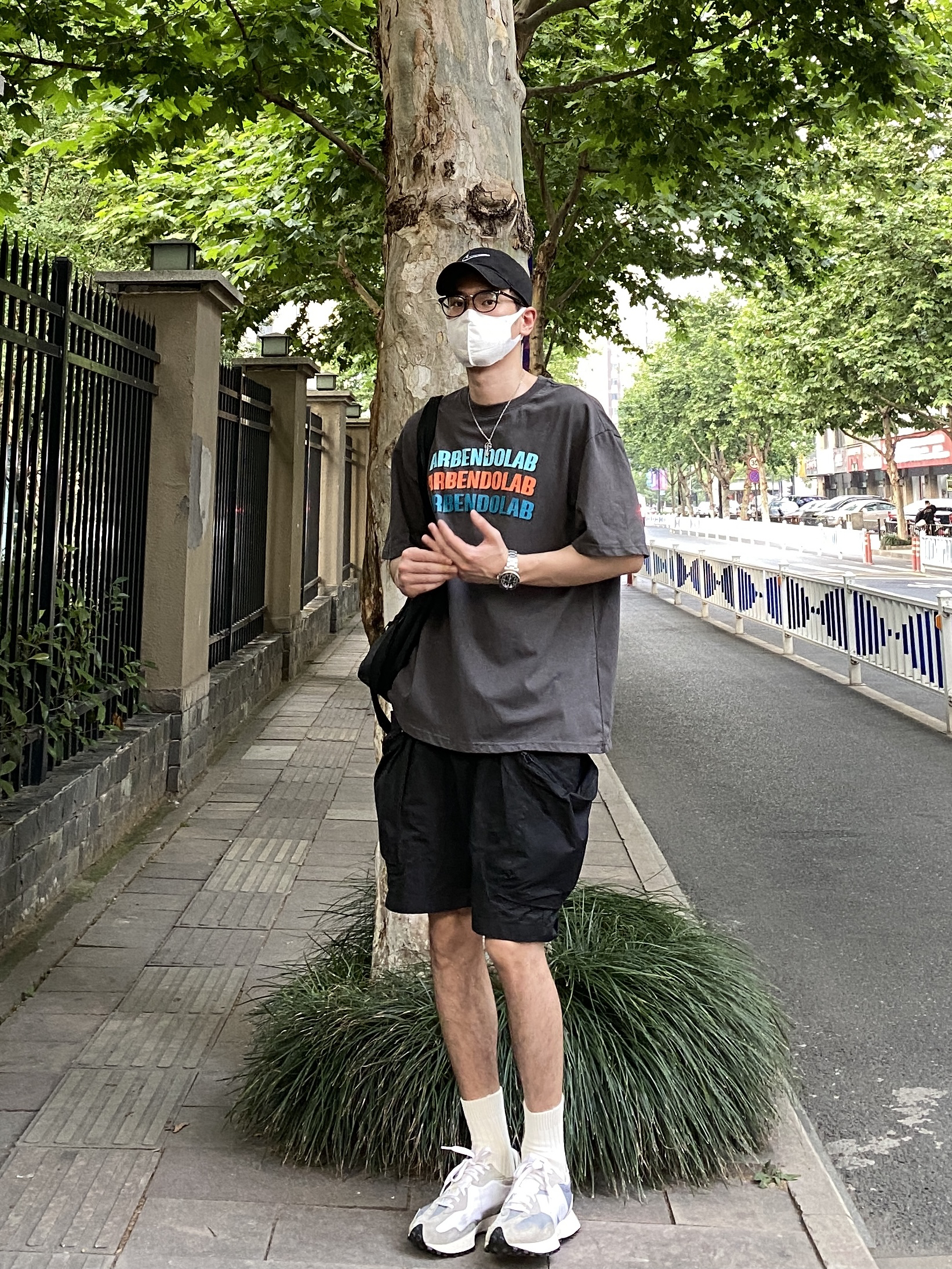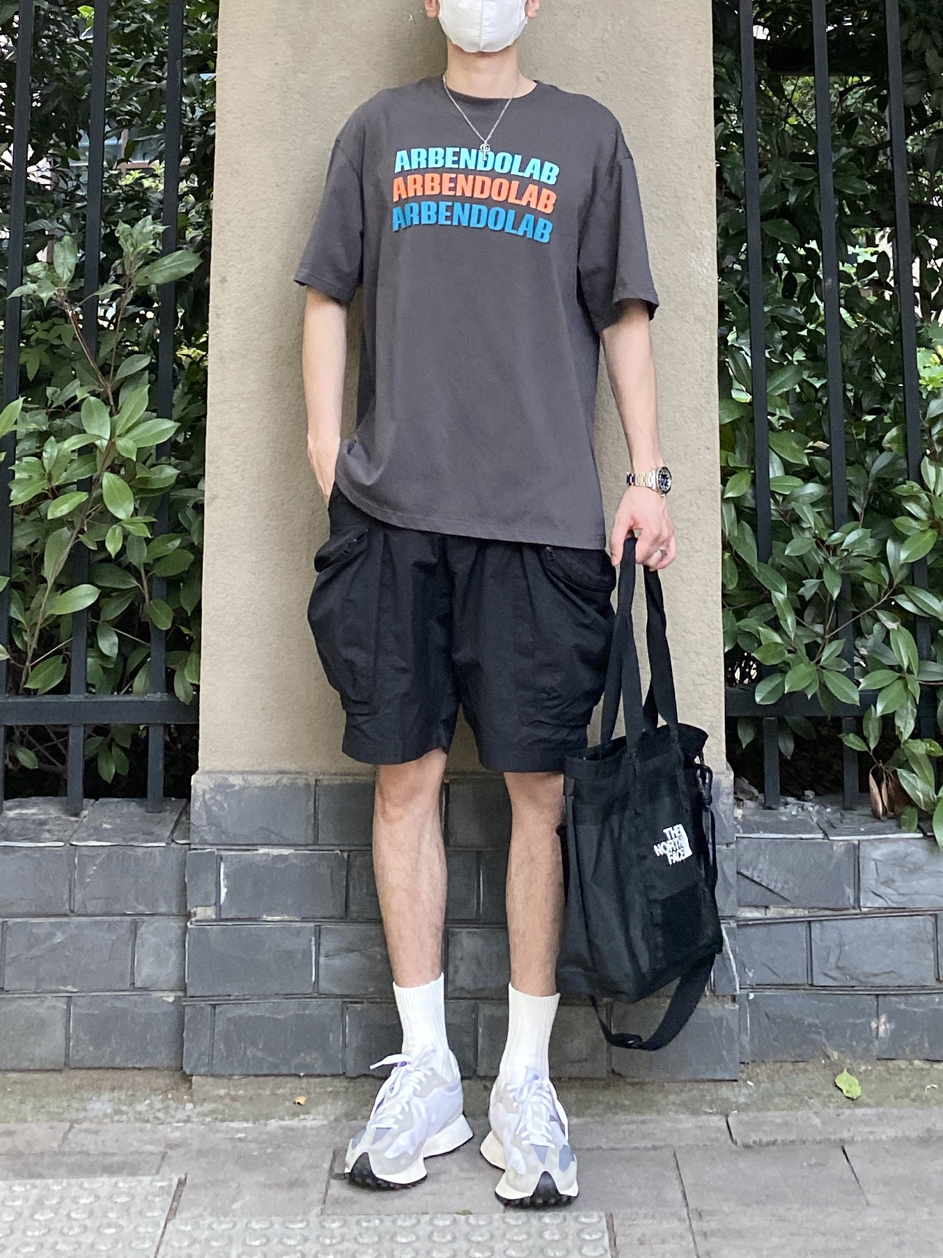 今天这套上衣穿了一件深灰色彩虹字母印花T恤,裤子选择不挑腿型的大口袋户外机能工装短裤,鞋子上脚百搭又增高的nb327元祖灰,接着戴一顶黑色棒球帽呼应下裤子的颜色,最后背上北面防水托特包,OK,出门看看搭配效果吧! - 今日穿搭 衣服裤子:NICE LILI 鞋子:NB327元祖灰