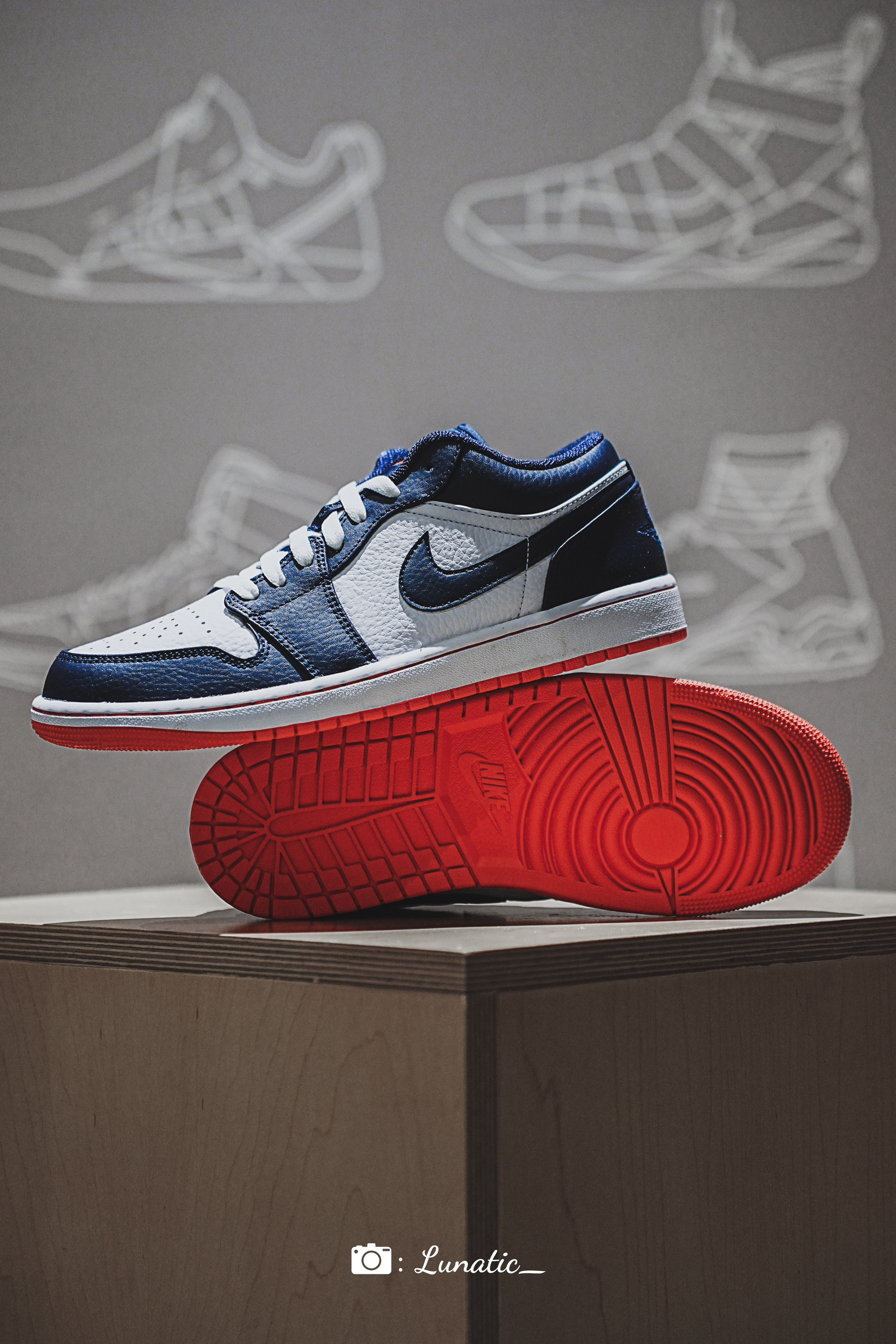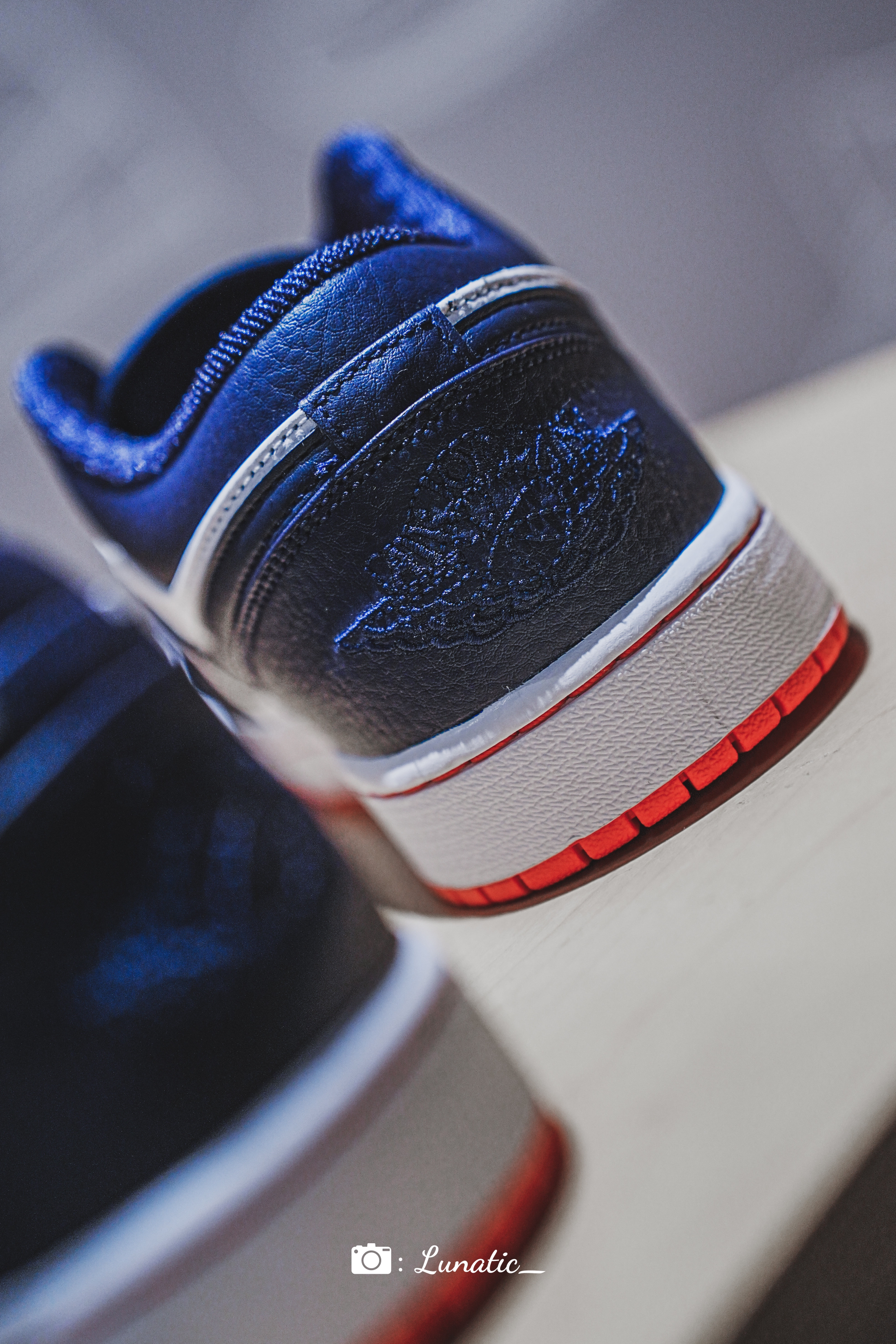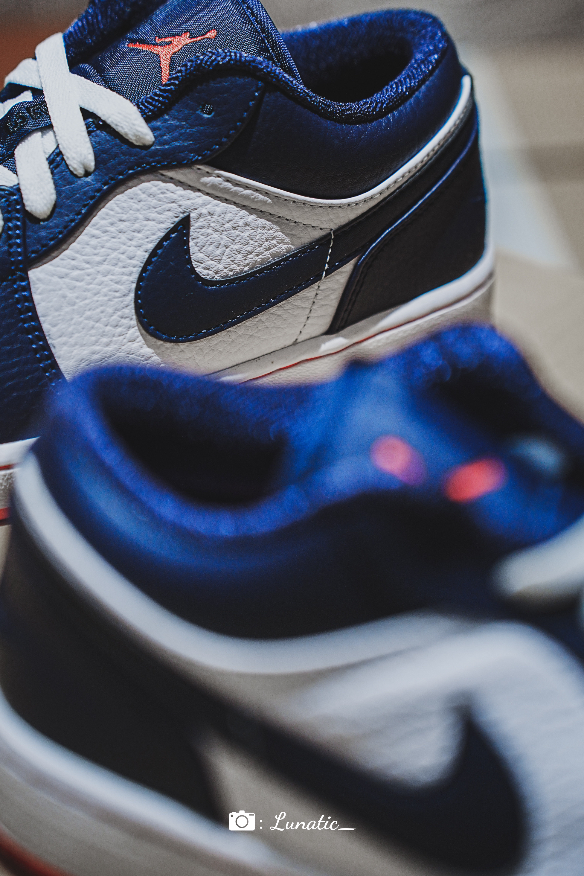 该双Air Jordan1 Low Retro Ember Glow 午夜蓝,采用了对比度和辨识度高的深蓝和白色色调皮革做鞋面,反差色强烈的红色橡胶大底,最为亮眼的是红色的鞋底,让整个鞋子看起来非常的抢眼,在低调得展现着独特的魅力。