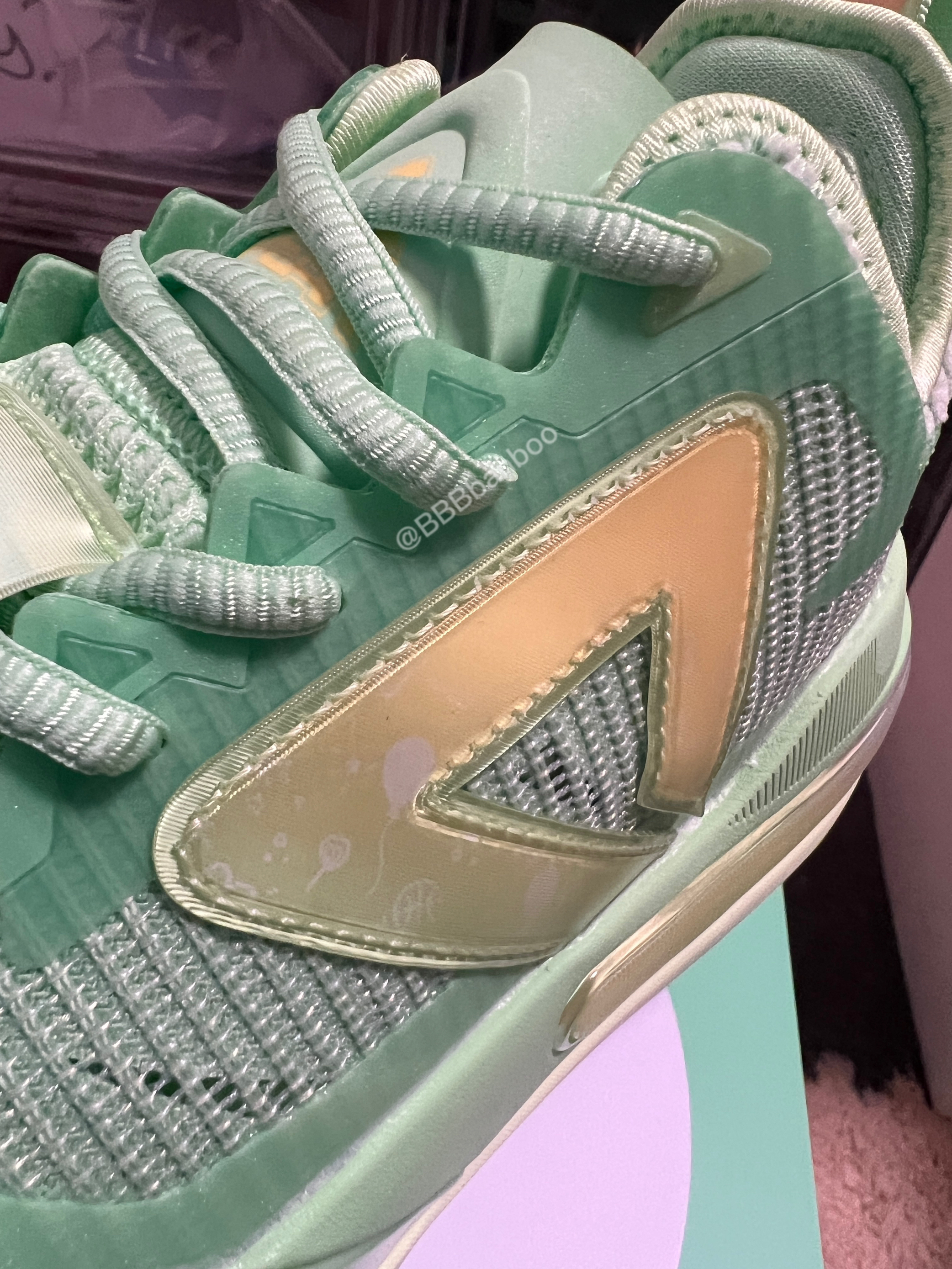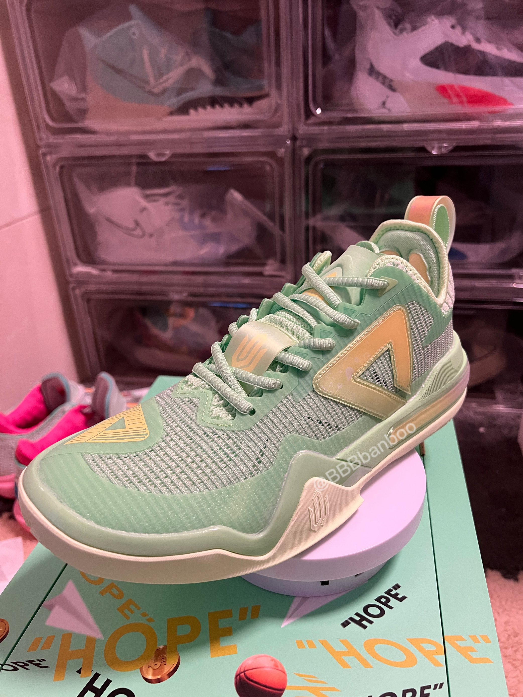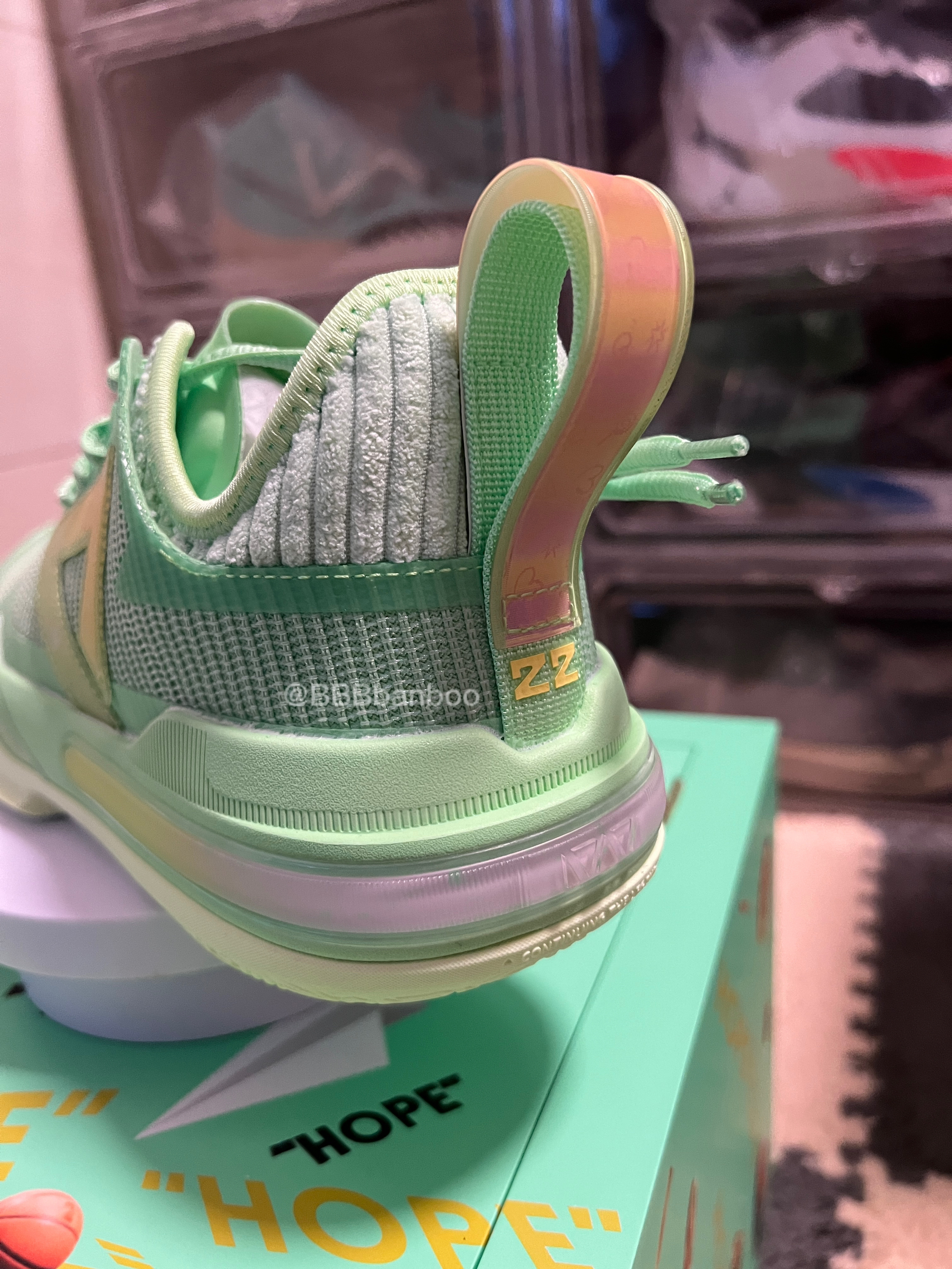 维金斯一代AW1–hope配色 匹克推出的双系统中底可切换的AW维金斯一代做的真挺不错的。手里的这双是匹克在618期间新市售的Hope配色,灵感来自嘴哥的慈善承诺—在NBA每得一分将捐出22美元,这点嘴哥没得黑! 鞋子整体以青绿色为主色调,非常清新的配色。侧墙的黄色logo类似闪卡的材质,上面还有印有气球🎈的图案。后跟环绕的黄紫渐变tpu点缀。这个配色的颜值是非常🉑️ 鞋面强度不错,该有的压脚补强...