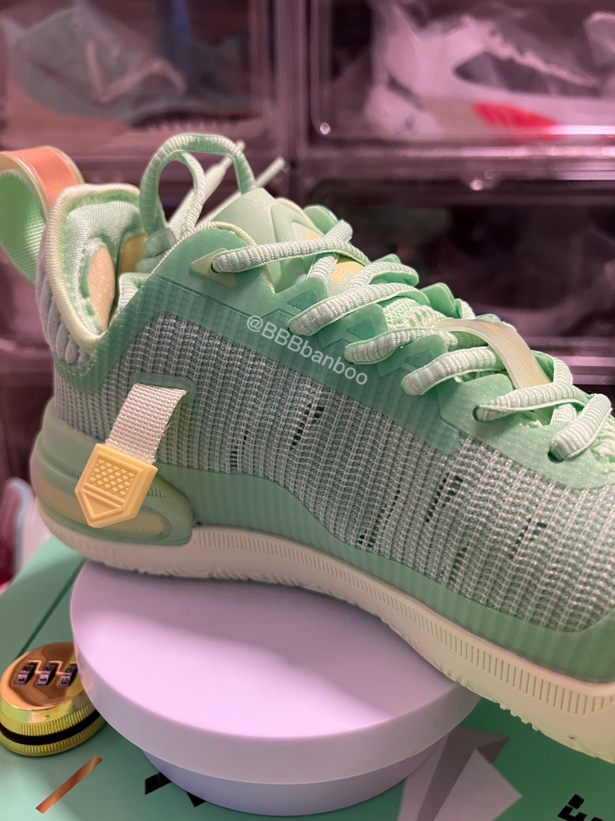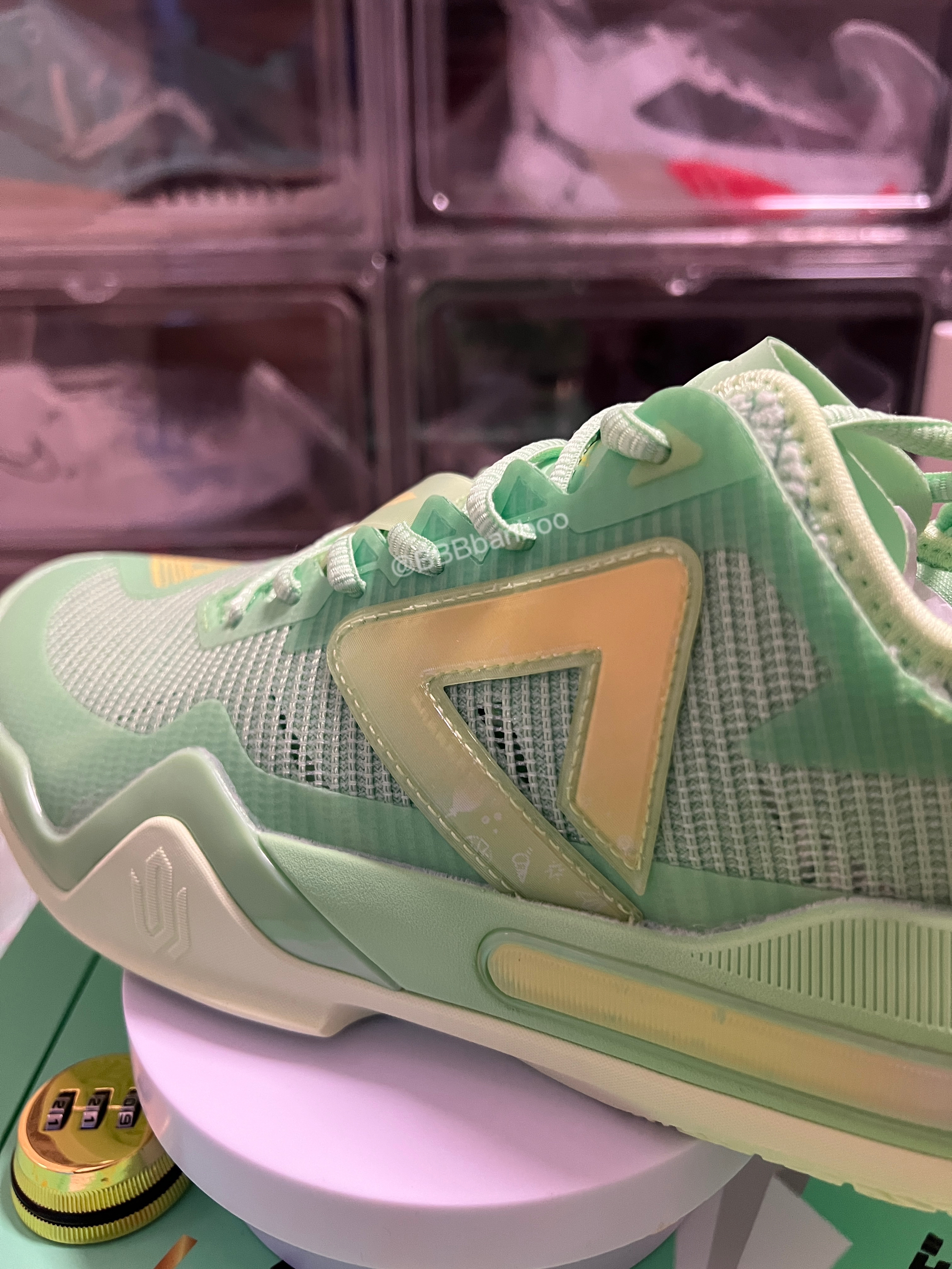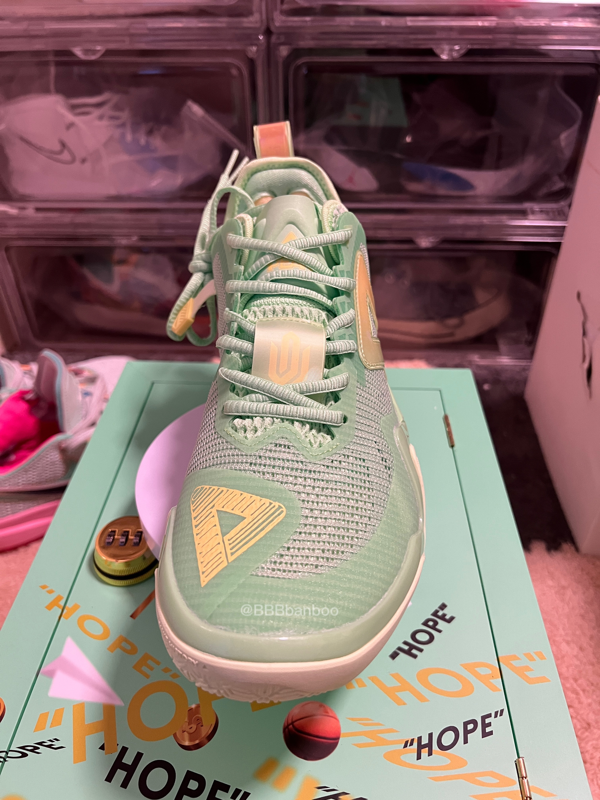 维金斯一代AW1–hope配色 匹克推出的双系统中底可切换的AW维金斯一代做的真挺不错的。手里的这双是匹克在618期间新市售的Hope配色,灵感来自嘴哥的慈善承诺—在NBA每得一分将捐出22美元,这点嘴哥没得黑! 鞋子整体以青绿色为主色调,非常清新的配色。侧墙的黄色logo类似闪卡的材质,上面还有印有气球🎈的图案。后跟环绕的黄紫渐变tpu点缀。这个配色的颜值是非常🉑️ 鞋面强度不错,该有的压脚补强...