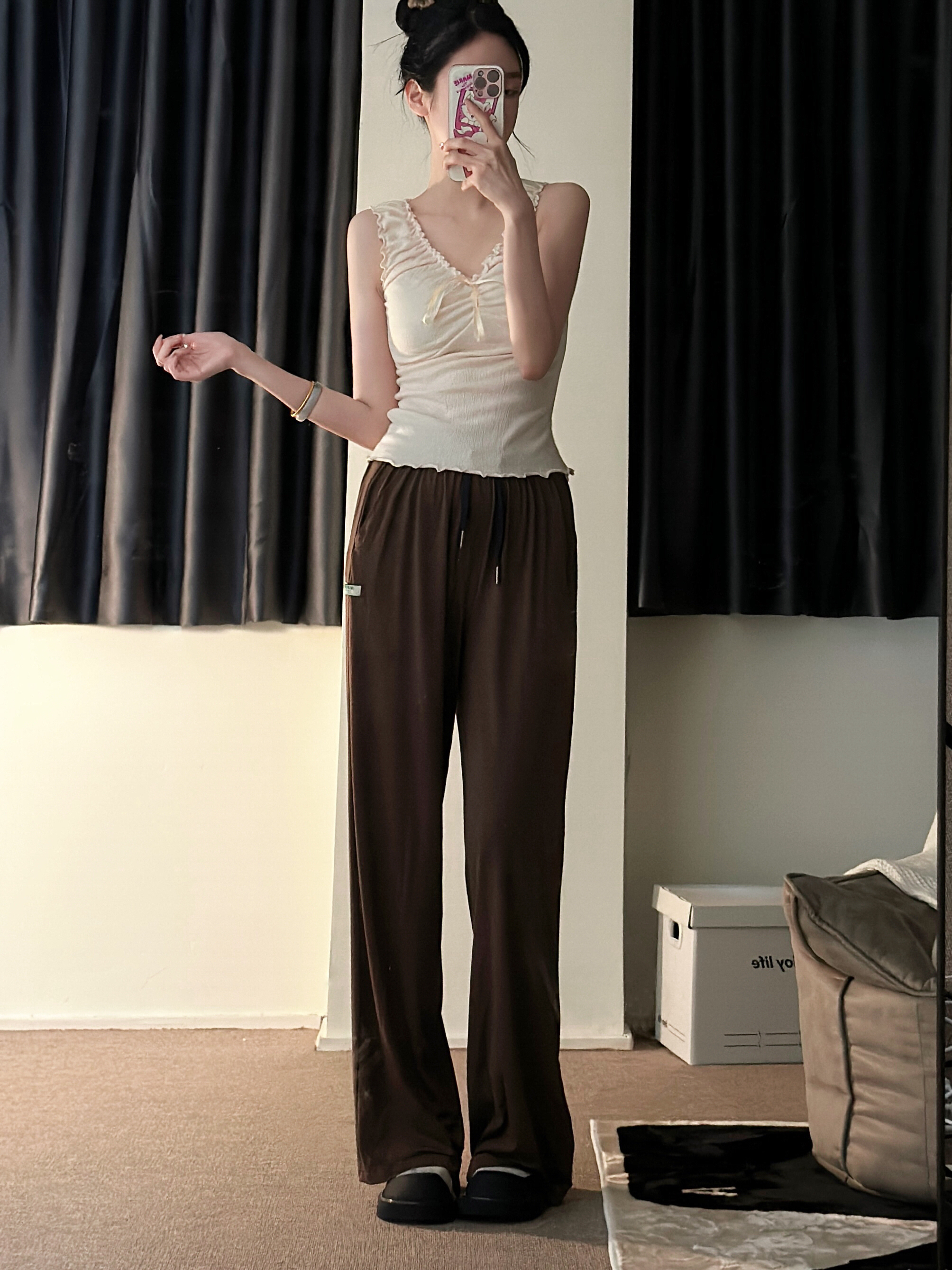 这个夏天太爱这种清冷感配色穿搭啦! 咖色阔腿裤今年敲火呀! 我也终于买到我敲喜欢的阔腿裤啦~~! 裤子的版型垂感很好 敲级修饰腿型 松紧腰+抽绳设计 时髦简练! 宽松版型遮胯显瘦 咖色的颜色高级感满满呀 慵懒随意穿搭 简单时髦感 不费力的穿搭 早八女孩的真爱穿搭呀😍 赶紧get起来同款~~ 🔺品牌 👖:完型wearx