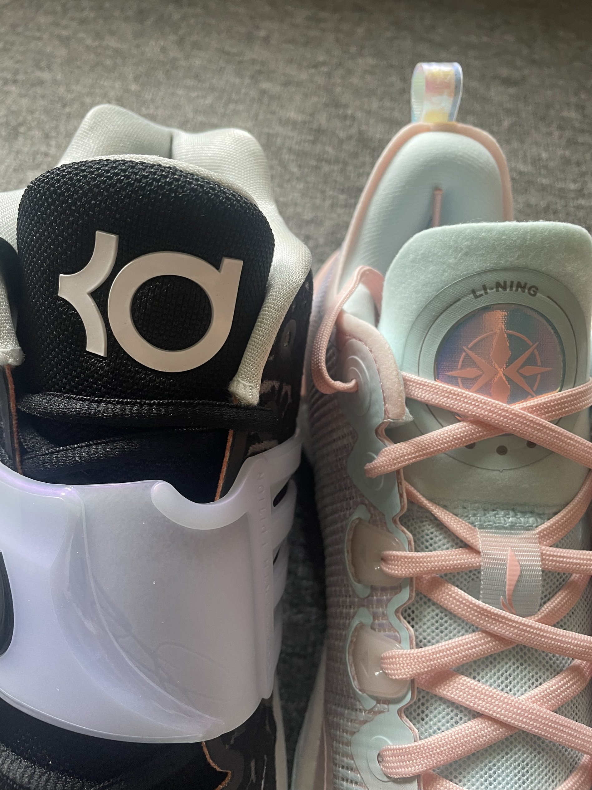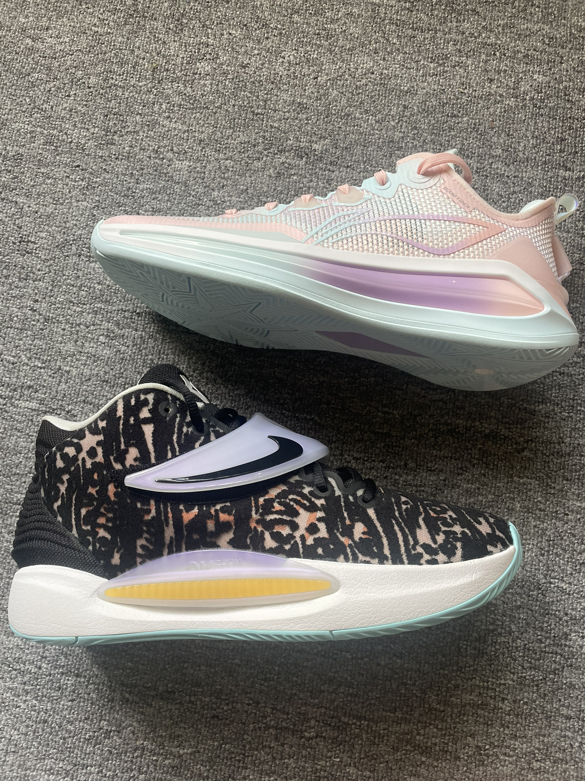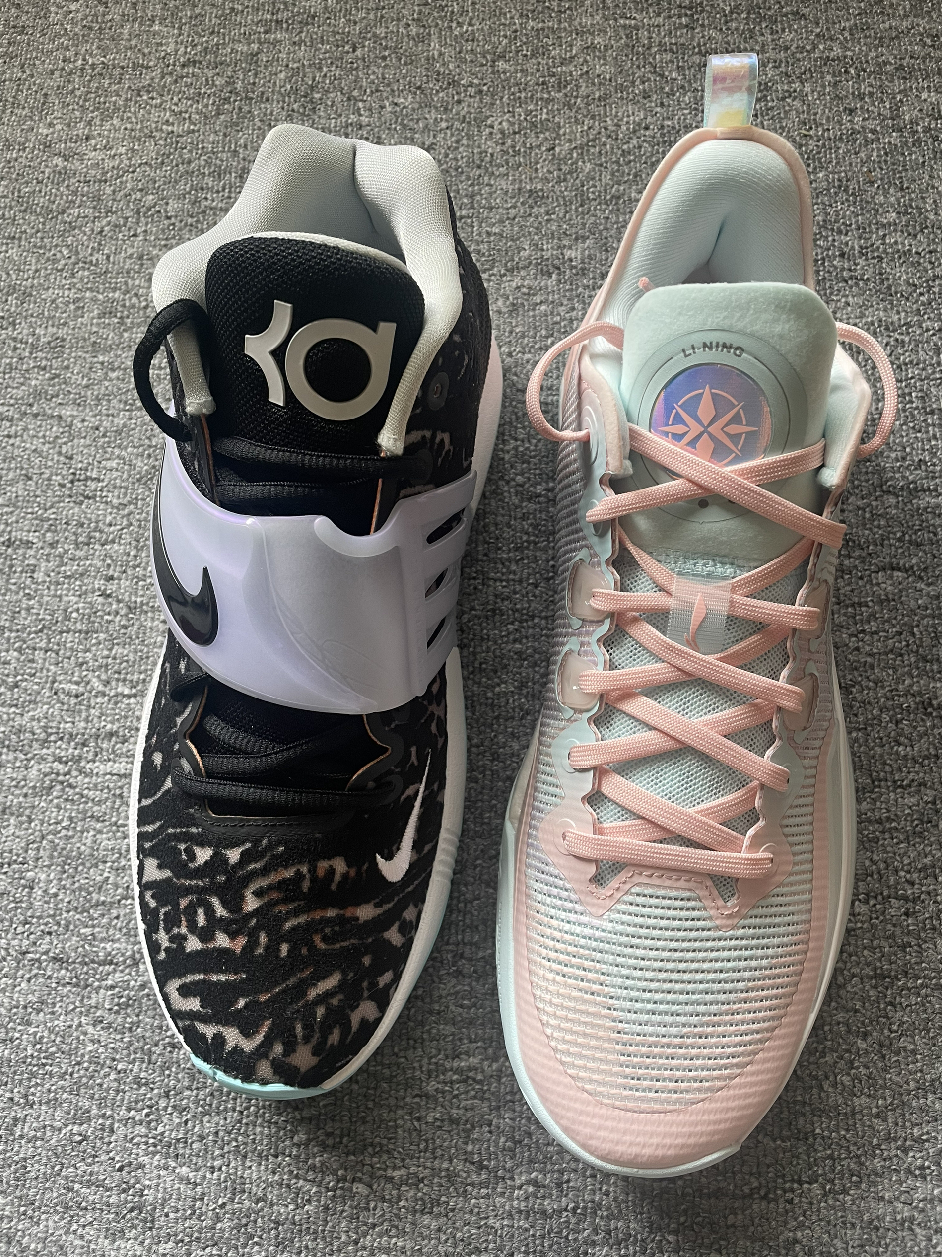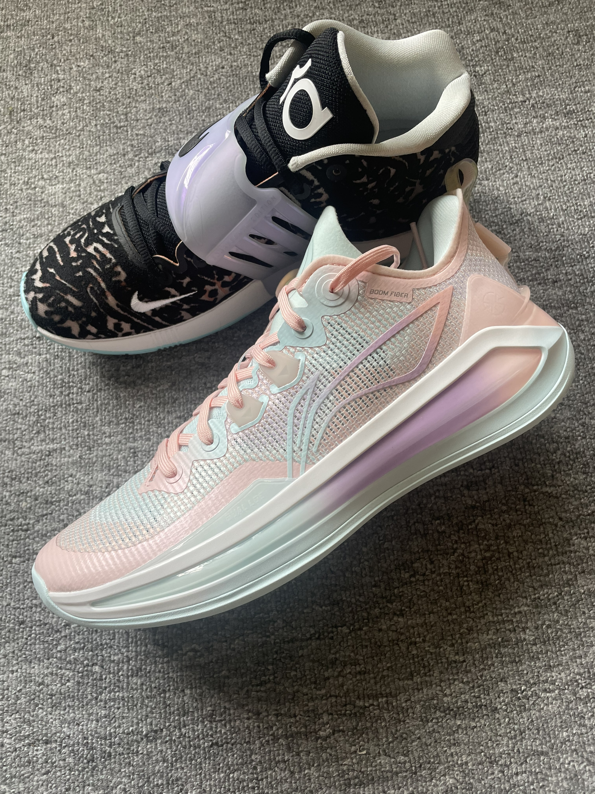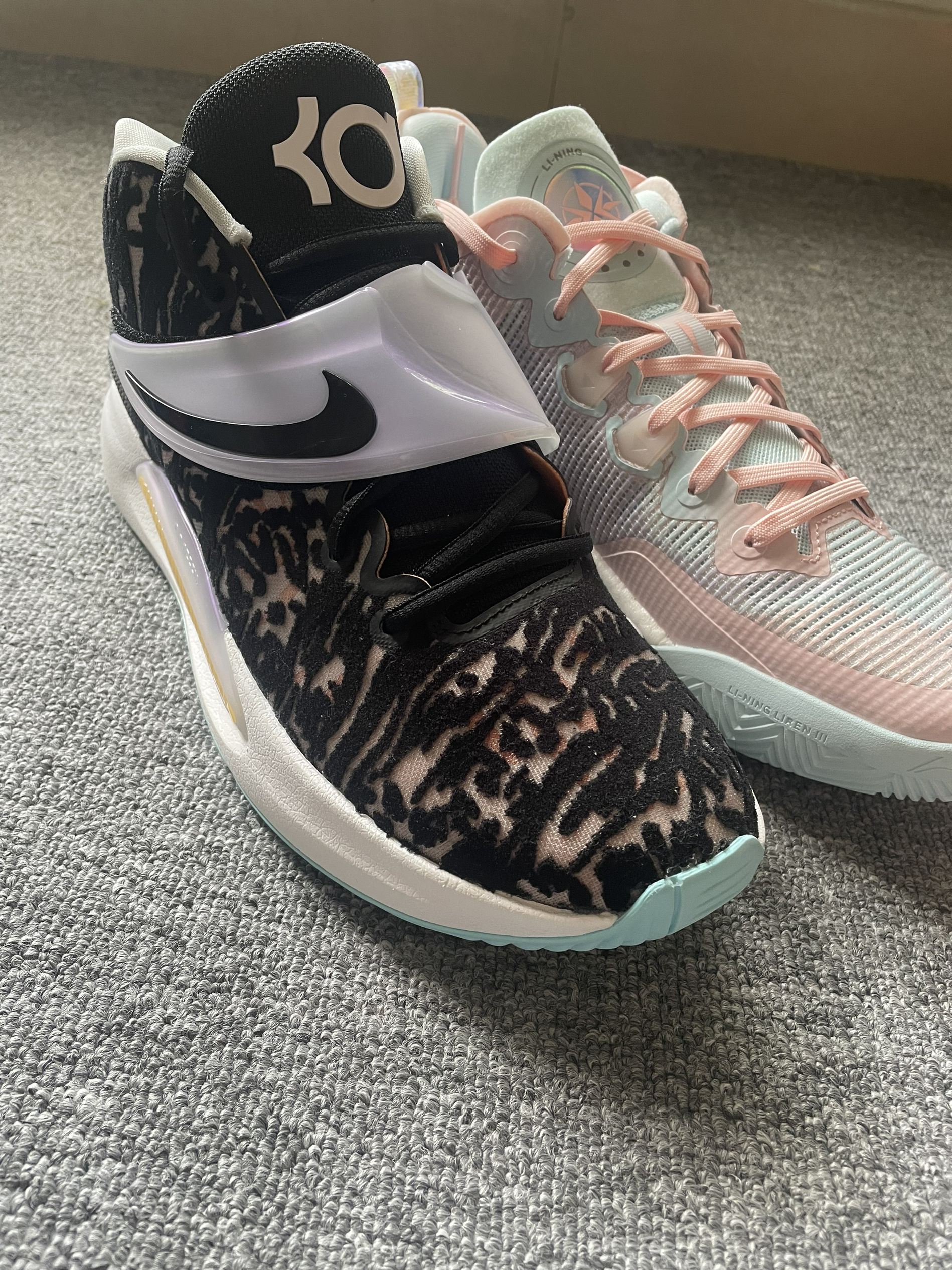 Nike KD 14 EP 黑白 全新Zoom气垫脚感非常澎湃植绒鞋面强度不错但透气性比较差,橡胶大底抓地耐磨都很稳,全掌防侧翻稍弱一些更适合打全场。 LiNing李宁 利刃3 v2 low 天空之境 全掌䨻科技,脚感软弹,大小体重兼备。䨻丝鞋面包裹支撑更好透气性也不错!Tuff RB 橡胶大底抓地耐磨都很不错,1-4号位都可以穿着