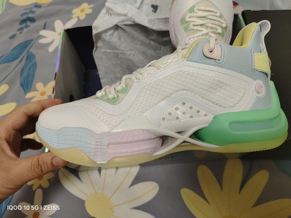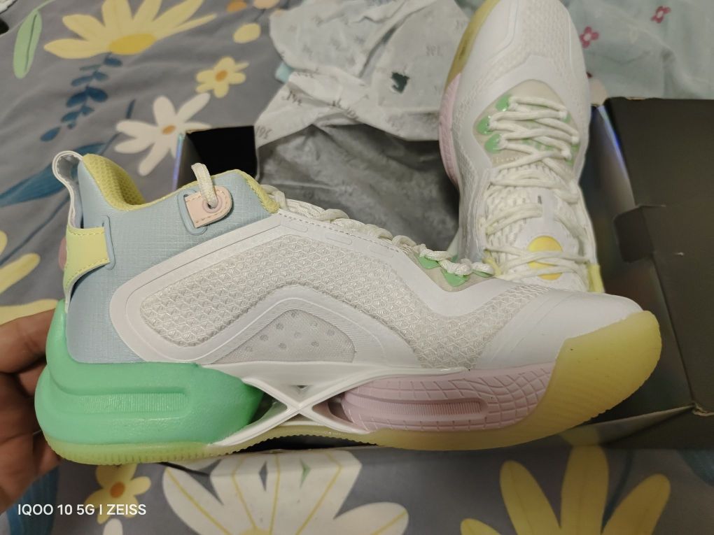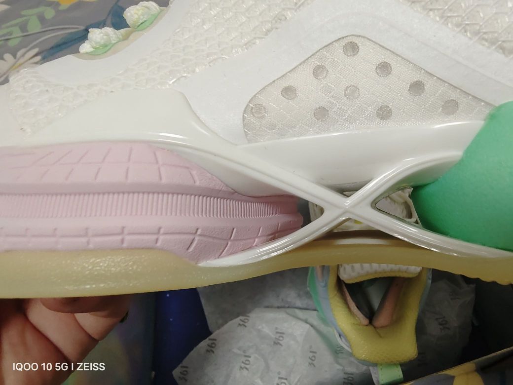 上脚感受不错,前掌E韧后掌Q弹超,中间X形抗扭片,很有意思的设计,实际上脚重心略微高,比较适合内线,小体重外线穿启动估计不行。