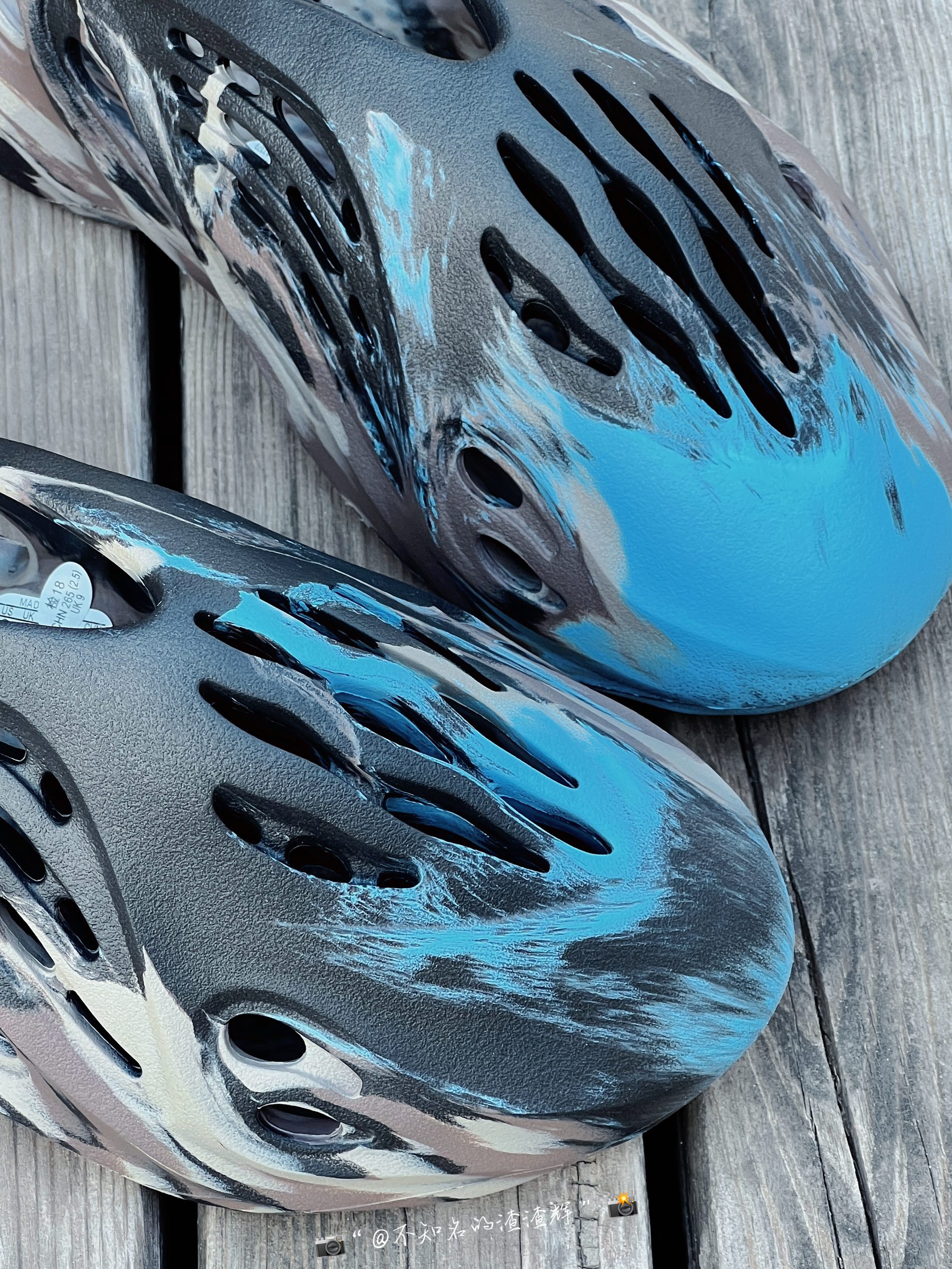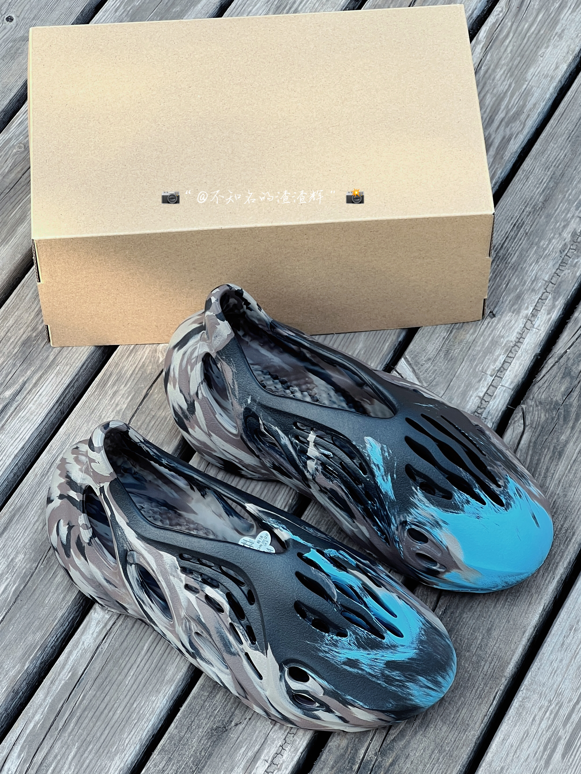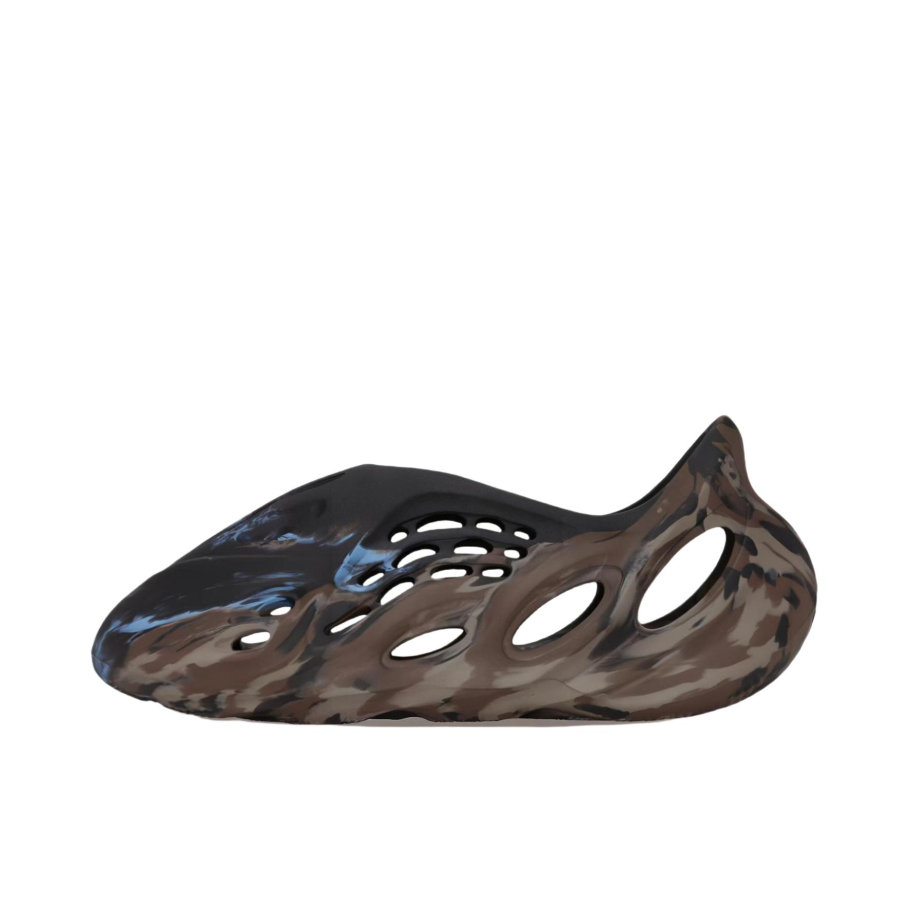 😍:adlidas originals Yeezy Foam Runner 黑炫彩“MX Cinder”潮流休闲 运动凉鞋 😍:这双鞋子整体以黑棕色为主色调,蓝色点缀,鞋身洞洞设计很有个性,很有个性的设计风格 😍:鞋身采用轻质 EVA 材质和可回收来的特殊藻类材质组成而成,质感舒适,上脚很轻盈的鞋子,脚感也很不错 😍:尺码推荐:建议买大两码