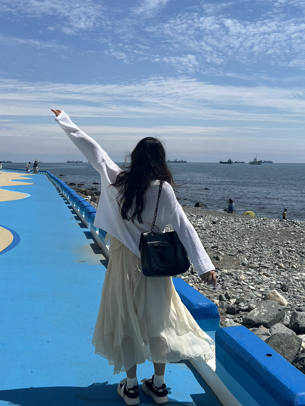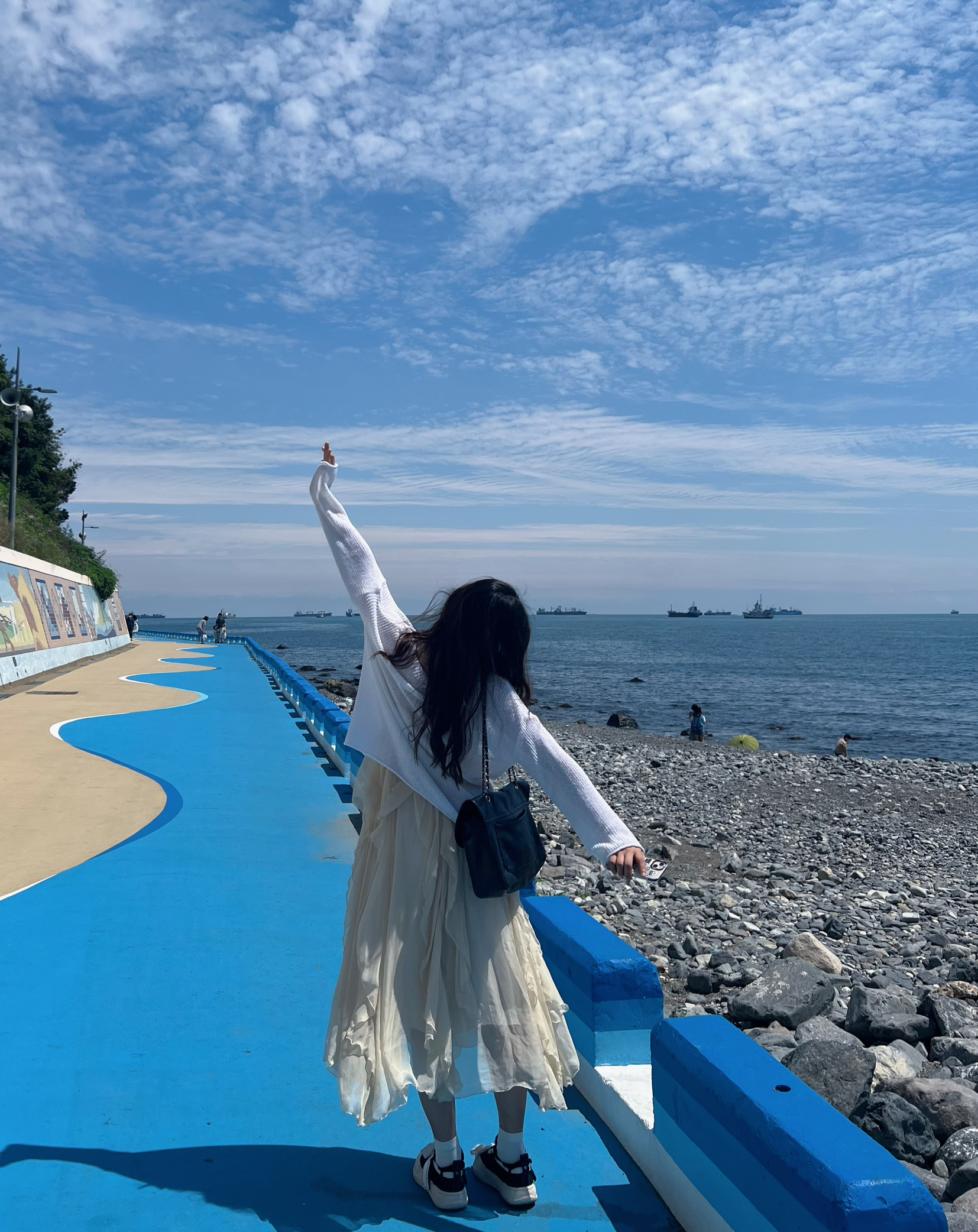 在海边拍照的时候穿上浅色系的裙子 真的和蓝天大海适配度很高! 飘逸的裙子在海风的吹拂下会显得照片很灵动 很推荐给准备去海边拍照的姐妹们🥂🥂🥰 海边的太阳还是很毒辣的 搭配上墨镜🕶️既可以保护我们的眼睛被强光照射 又能增添一点时尚感! 方形的墨镜🕶️形状还能很好得修饰我们的脸型🥳 身高|体重:172cm 58kg 🧍♂️ 穿搭风格:韩系 👗裙子:Tongse彤色