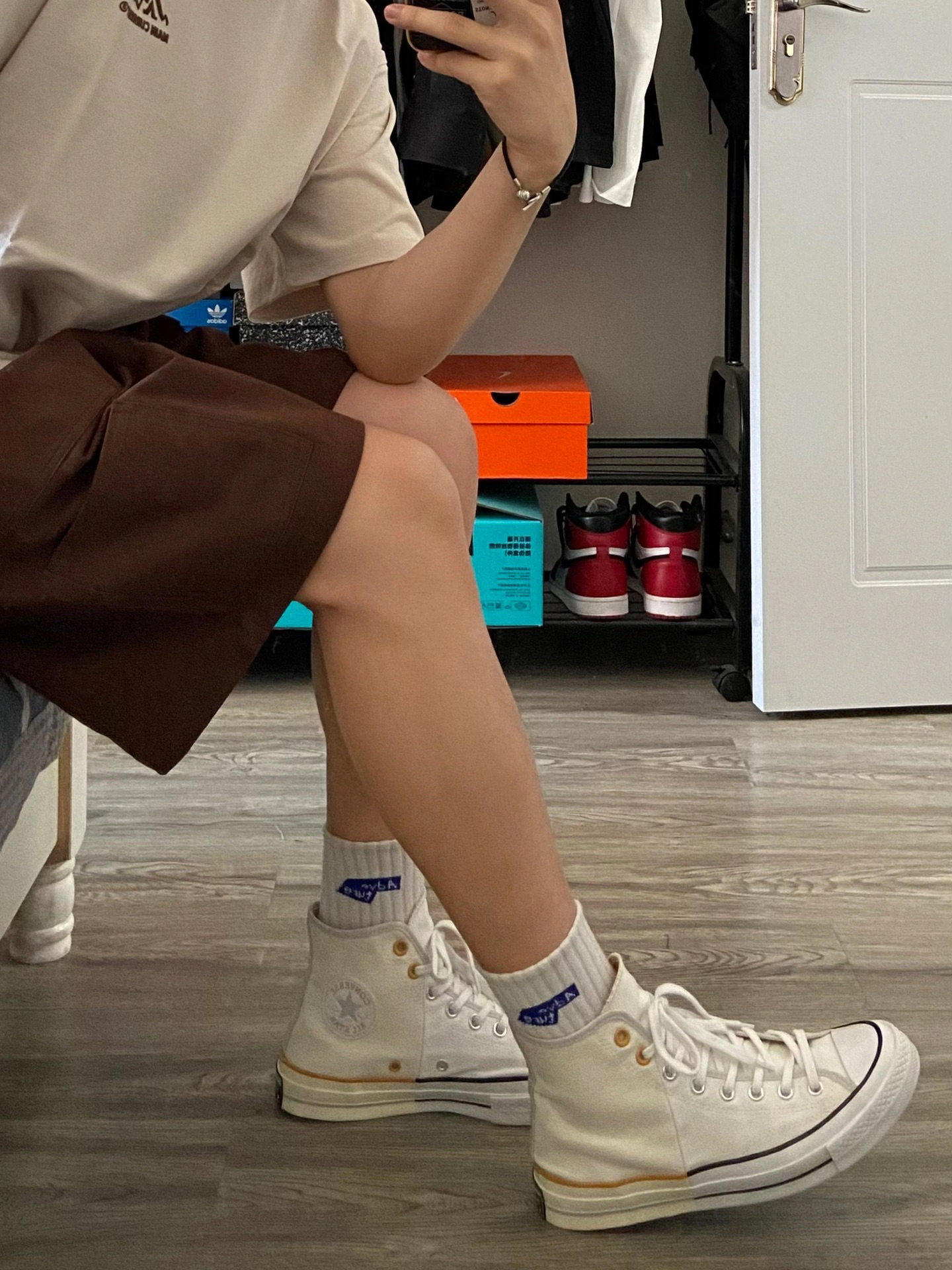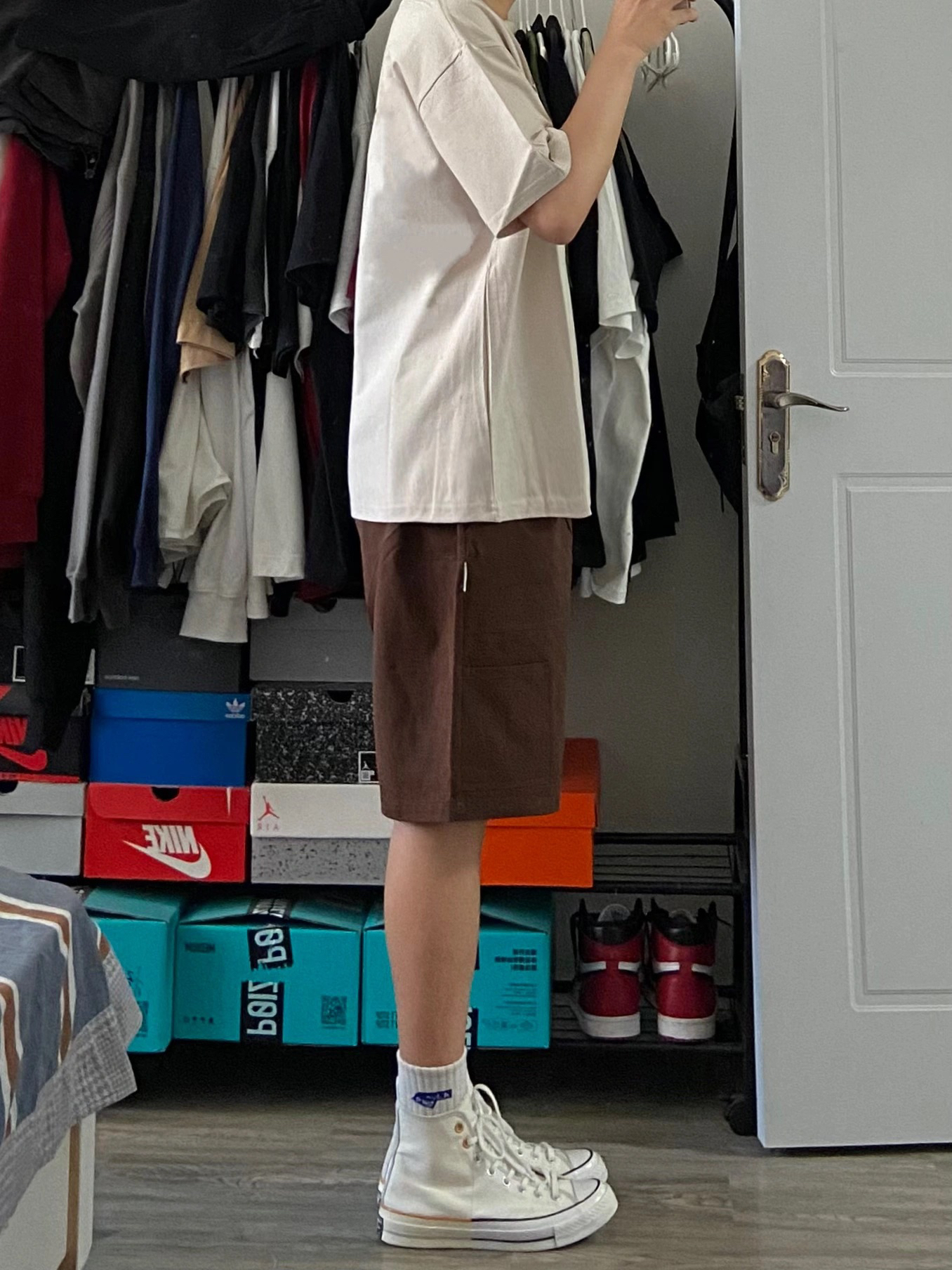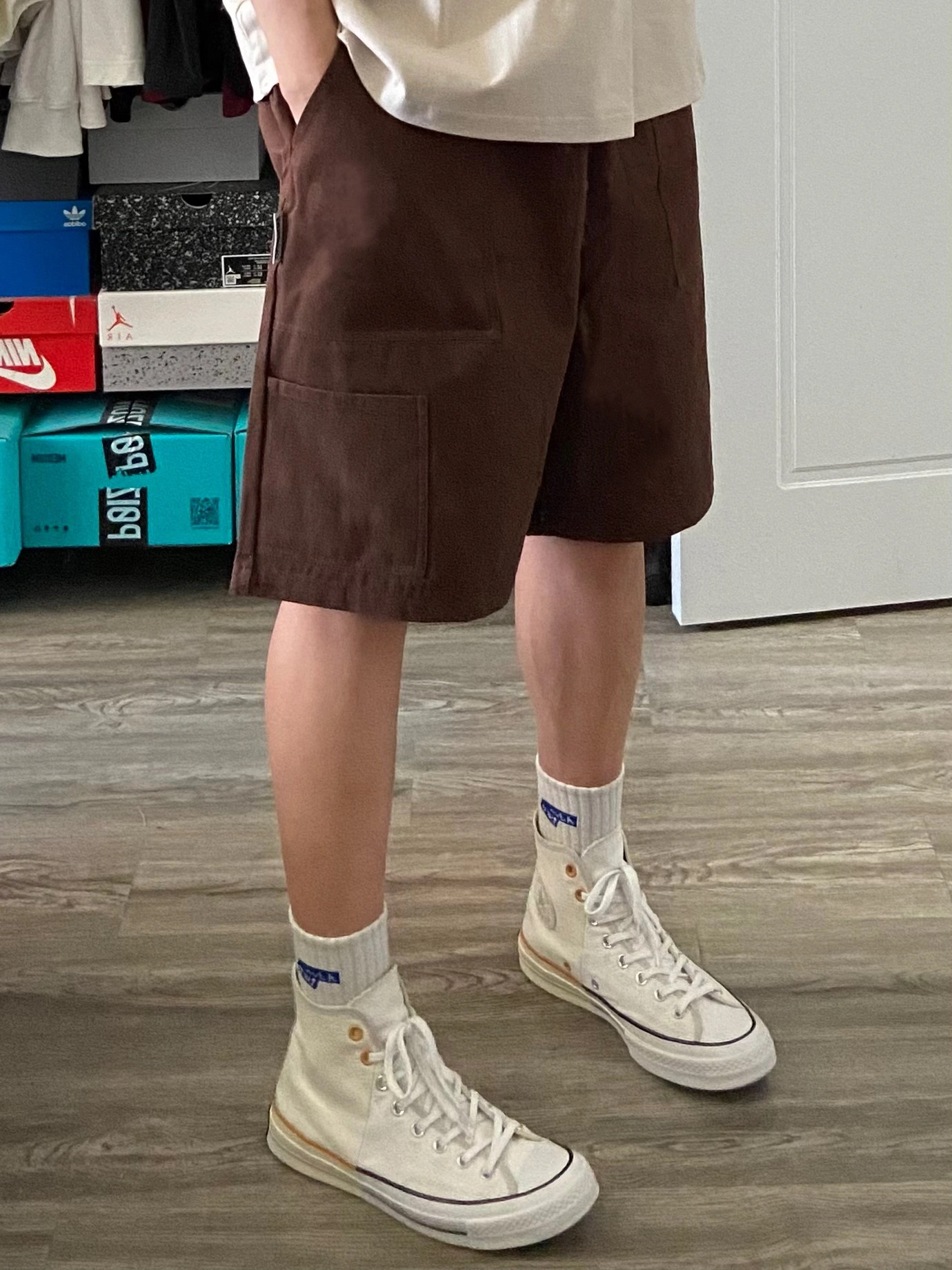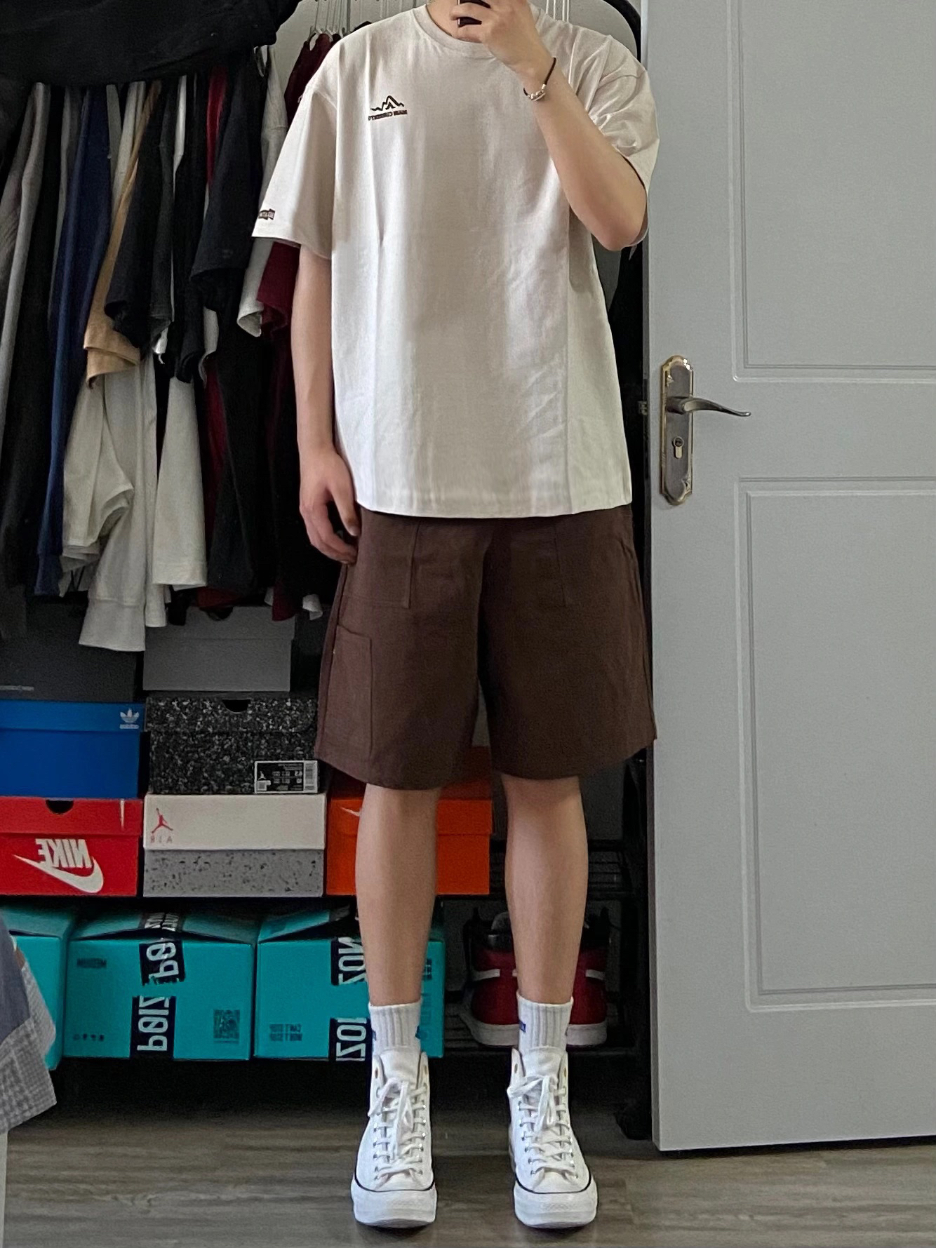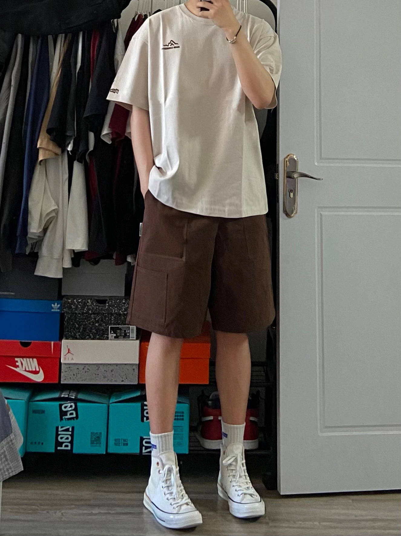 身高|体重:180cm68kg 🧍♂️ 穿搭风格:休闲 👔 上衣:卡其色短袖 👖 下装:咖啡色短裤 👟 鞋子:匡威1970s 🎒配饰:小手链