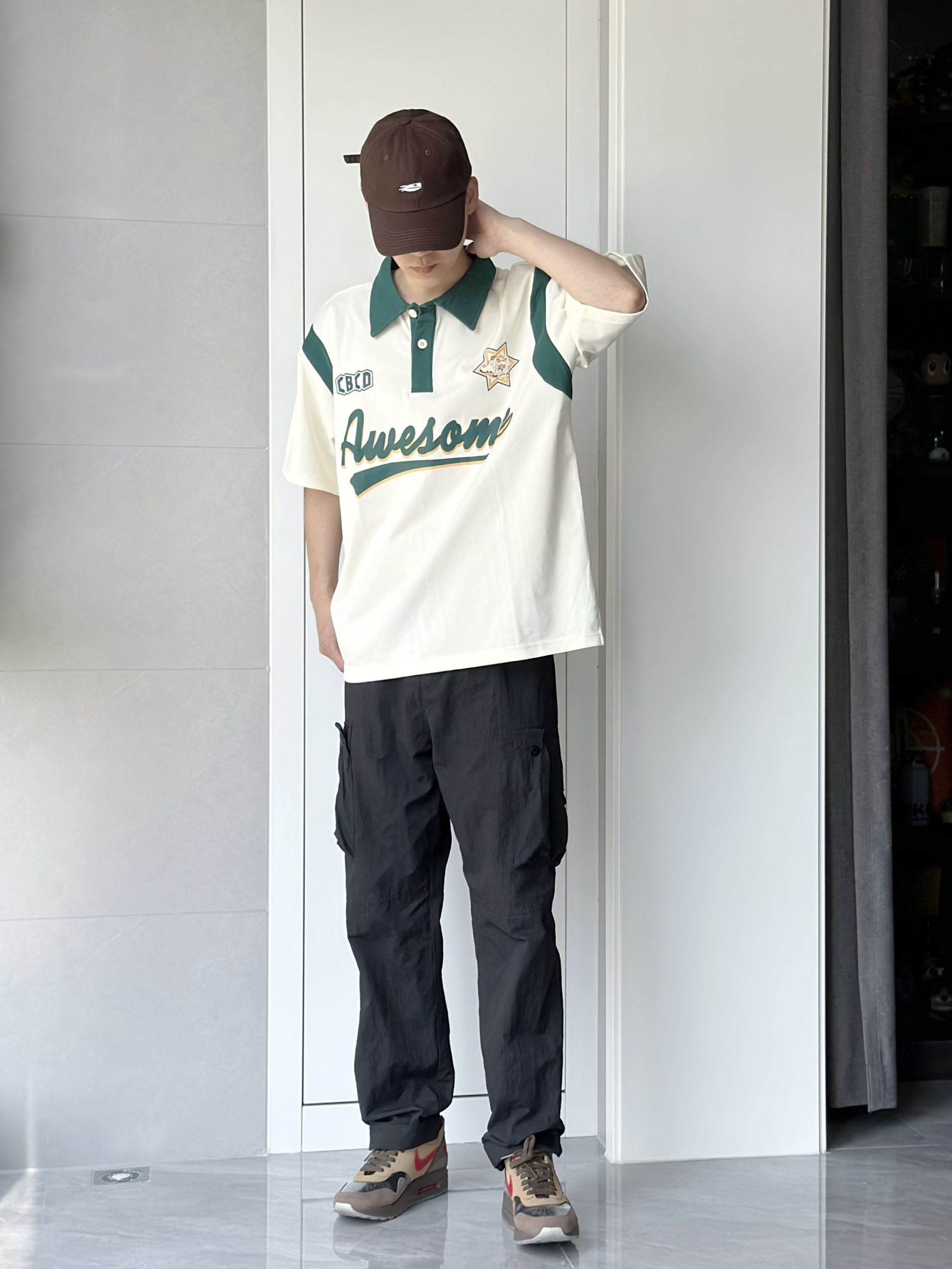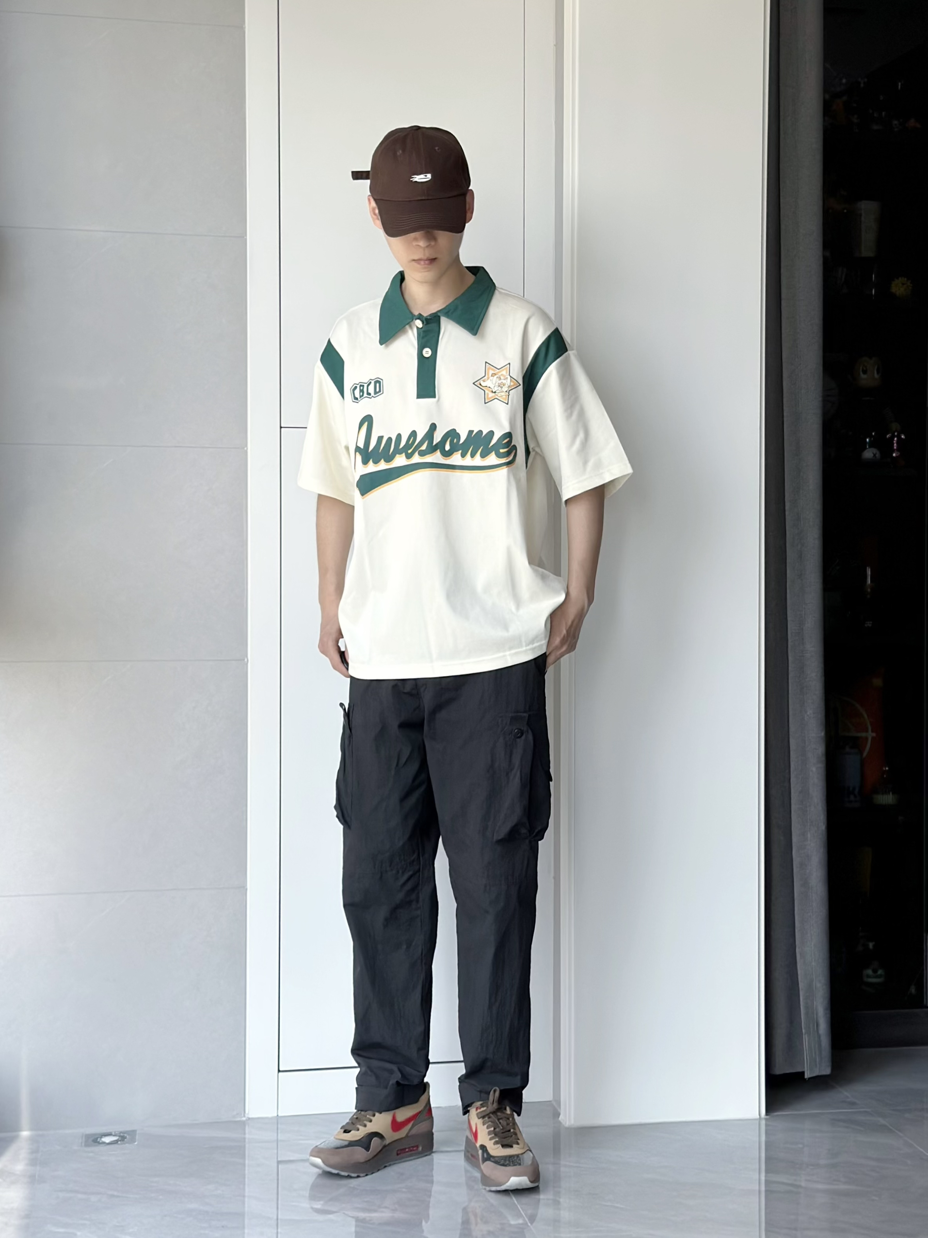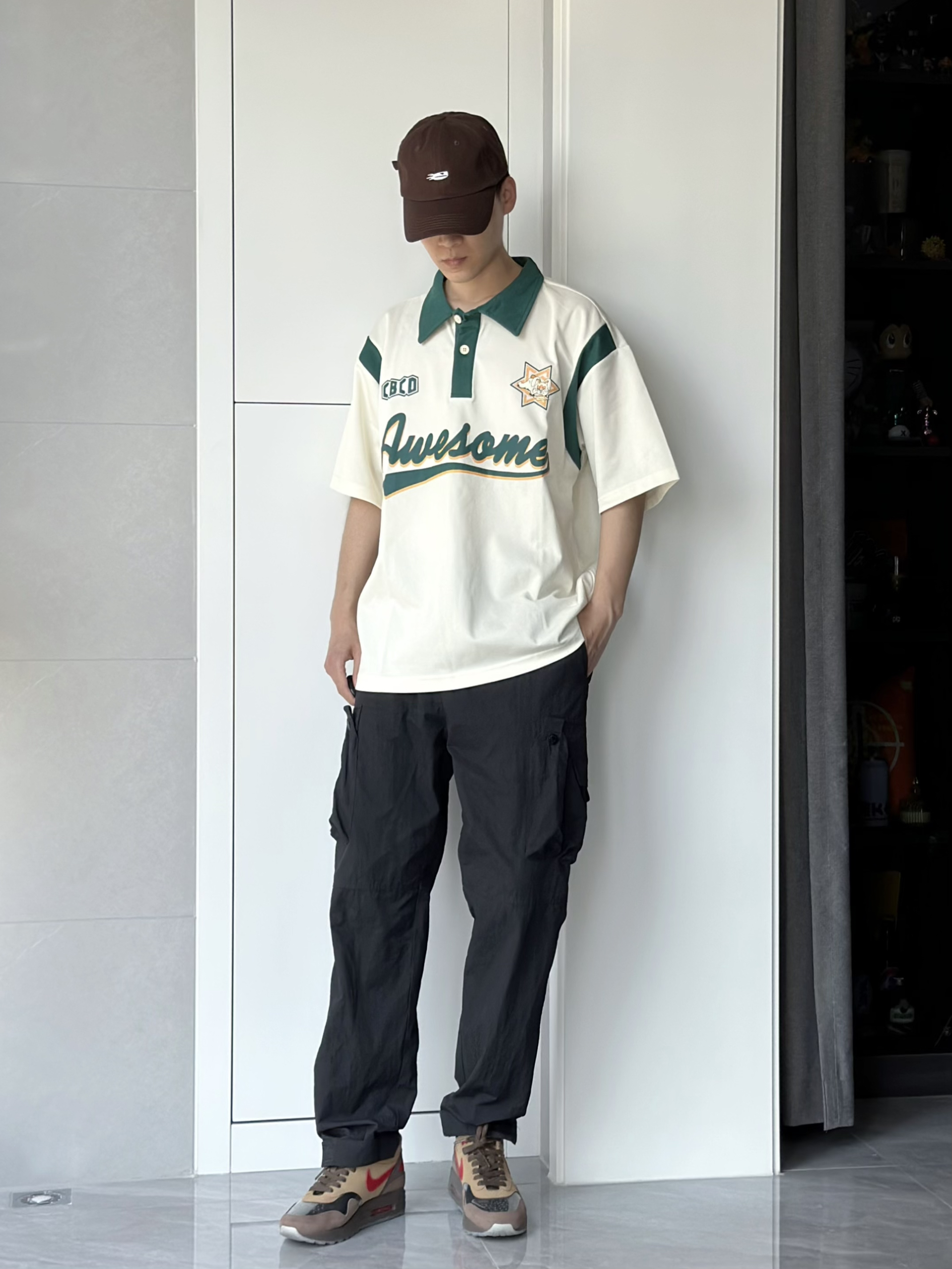 今天小小的混搭一下 休闲的Polo衫搭配工装裤 这么可爱的衣服我只能用俏皮来形容了 米白拼绿的配色和图案的组合 很美式街头风 在夏天穿感觉还是很干净清爽的 在帽子和鞋子的选择上 选用了咖色 有点撞色的感觉 但是又毫无无违和感 感觉就很不错 👔 175 120 穿xl就还蛮宽松的 CBCD