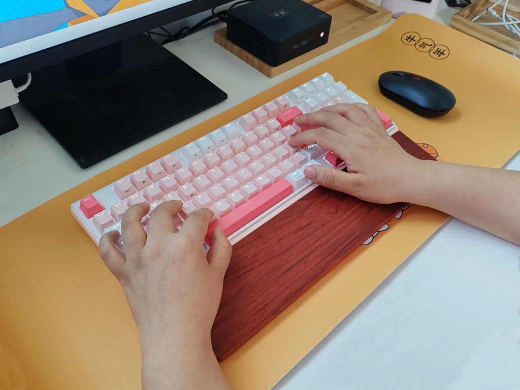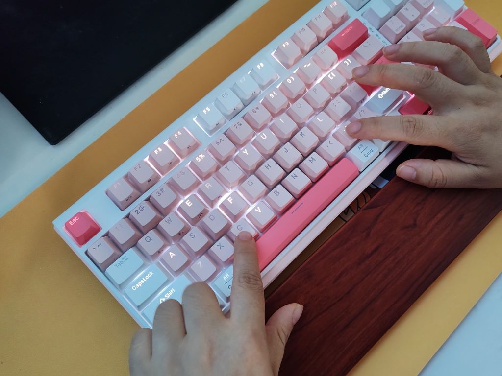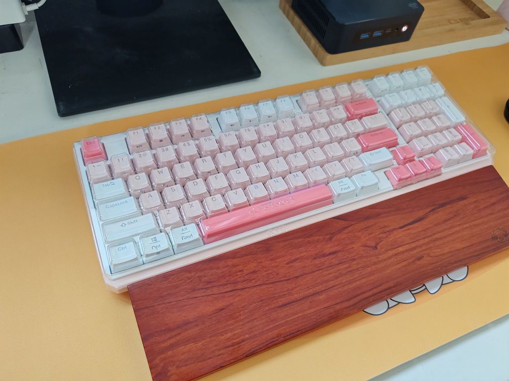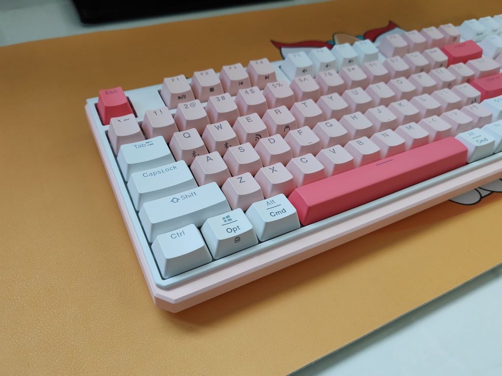 女孩子对粉色是真的没抵抗力,媳妇买了粉色发卡、粉色运动鞋、粉色耳机,现在去又买了个粉色键盘。 媳妇一开始说是给我买的键盘,结果我在家只能用我的笔记本,台式机都是她在用,键盘理所当然也是她用了。 杜伽K615轻粉这款配色是真的好看,果然斩男色不是浪得虚名,它支持热拔插,不仅可热拔插键帽,还支持拔插轴体,并且支持Windows、安卓、MAC多平台连接,可一键切换使用,真的太方便了。