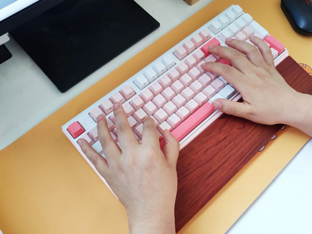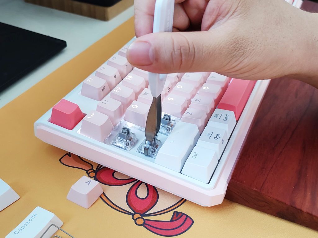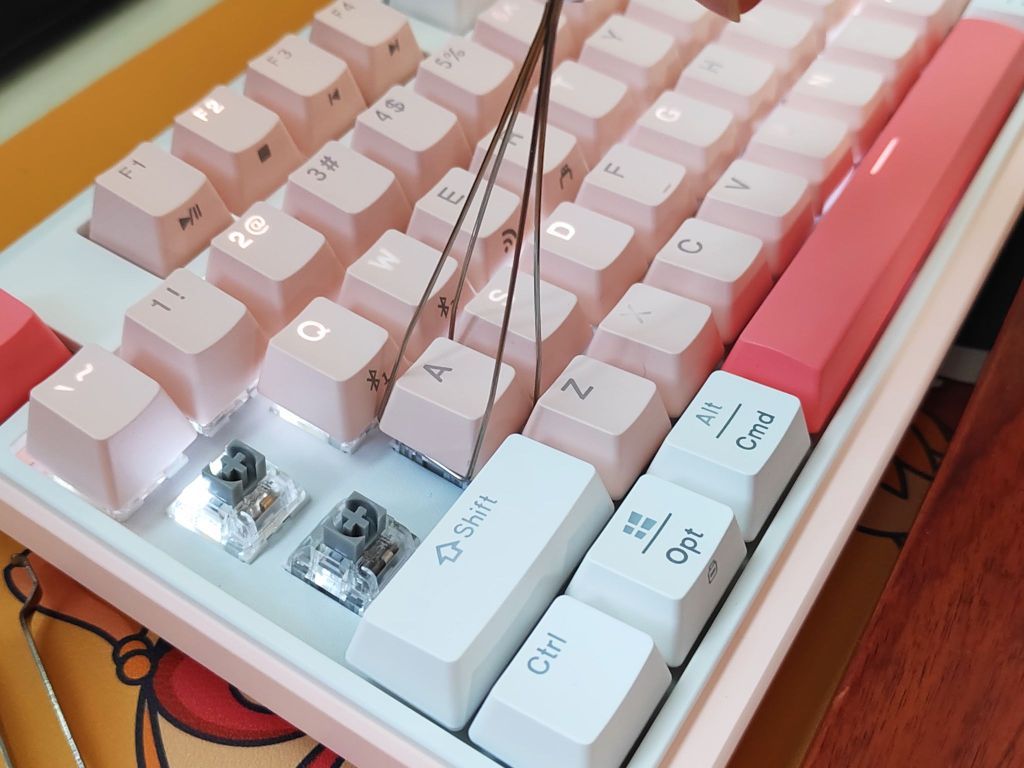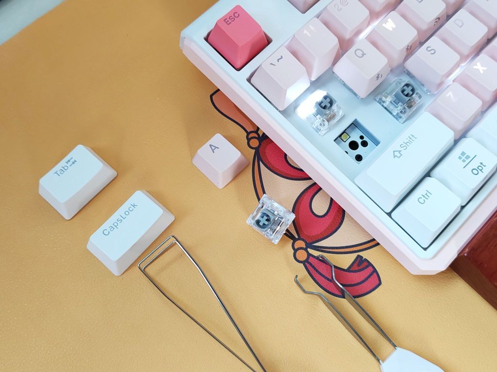 女孩子对粉色是真的没抵抗力,媳妇买了粉色发卡、粉色运动鞋、粉色耳机,现在去又买了个粉色键盘。 媳妇一开始说是给我买的键盘,结果我在家只能用我的笔记本,台式机都是她在用,键盘理所当然也是她用了。 杜伽K615轻粉这款配色是真的好看,果然斩男色不是浪得虚名,它支持热拔插,不仅可热拔插键帽,还支持拔插轴体,并且支持Windows、安卓、MAC多平台连接,可一键切换使用,真的太方便了。