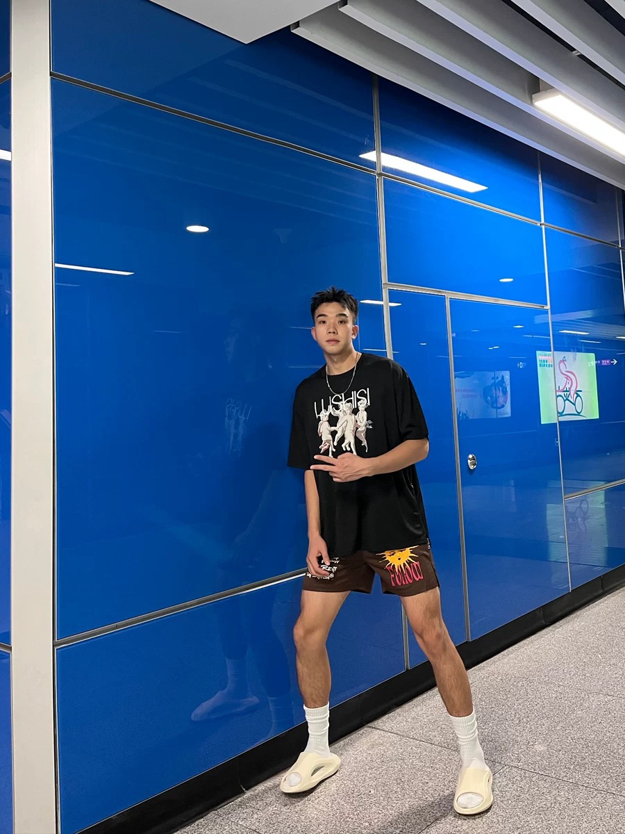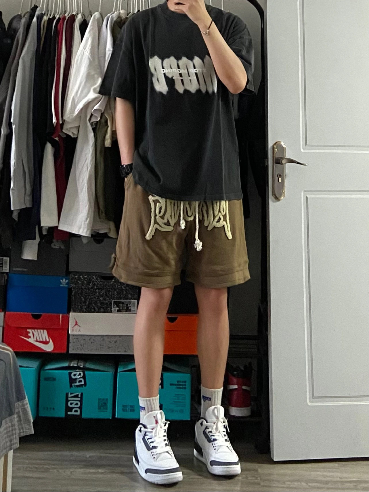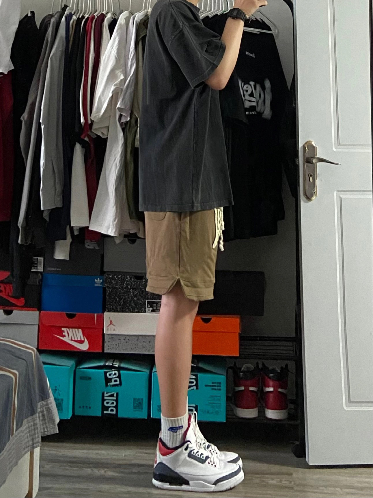身高|体重:180cm68kg 🧍♂️ 穿搭风格:休闲 👔 上衣:烟灰宽松短袖 👖 下装:美式休闲短裤 👟 鞋子:aj3火焰红 🎒配饰:小手链