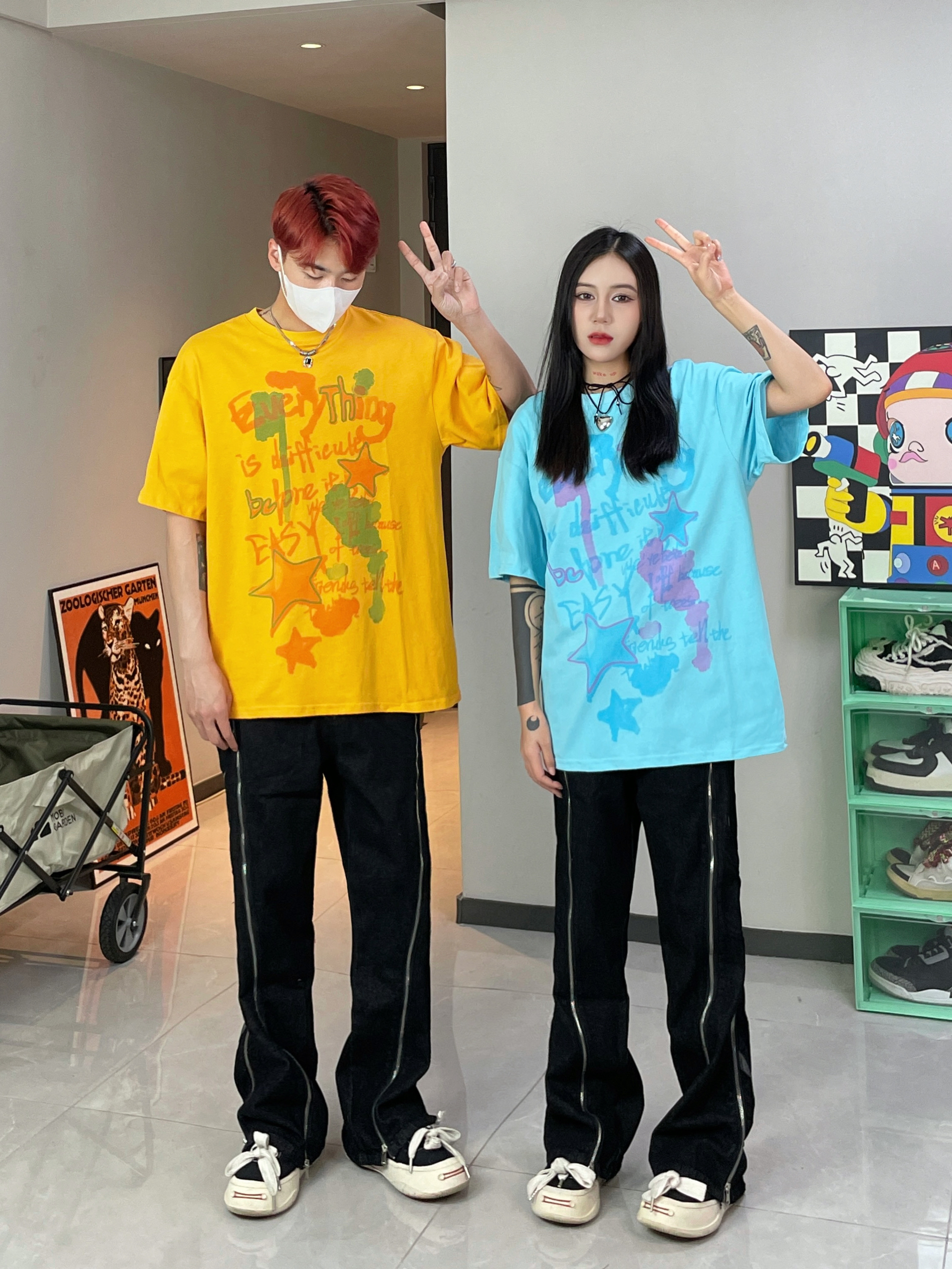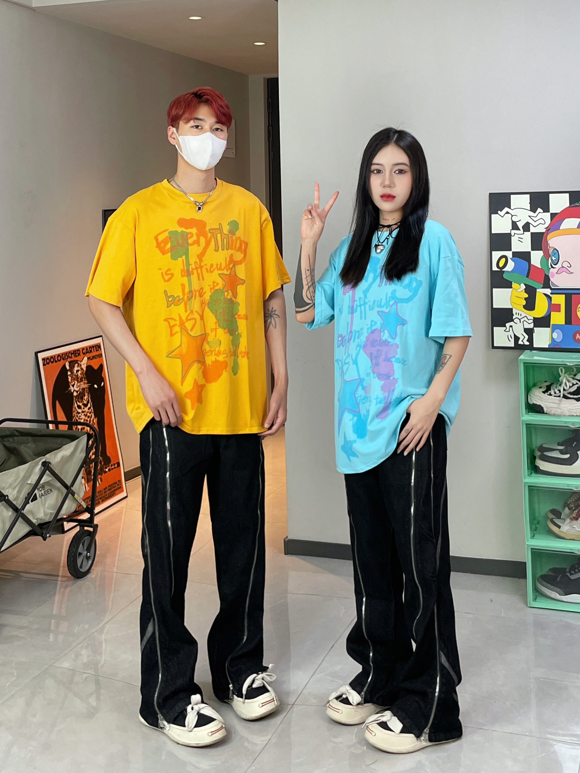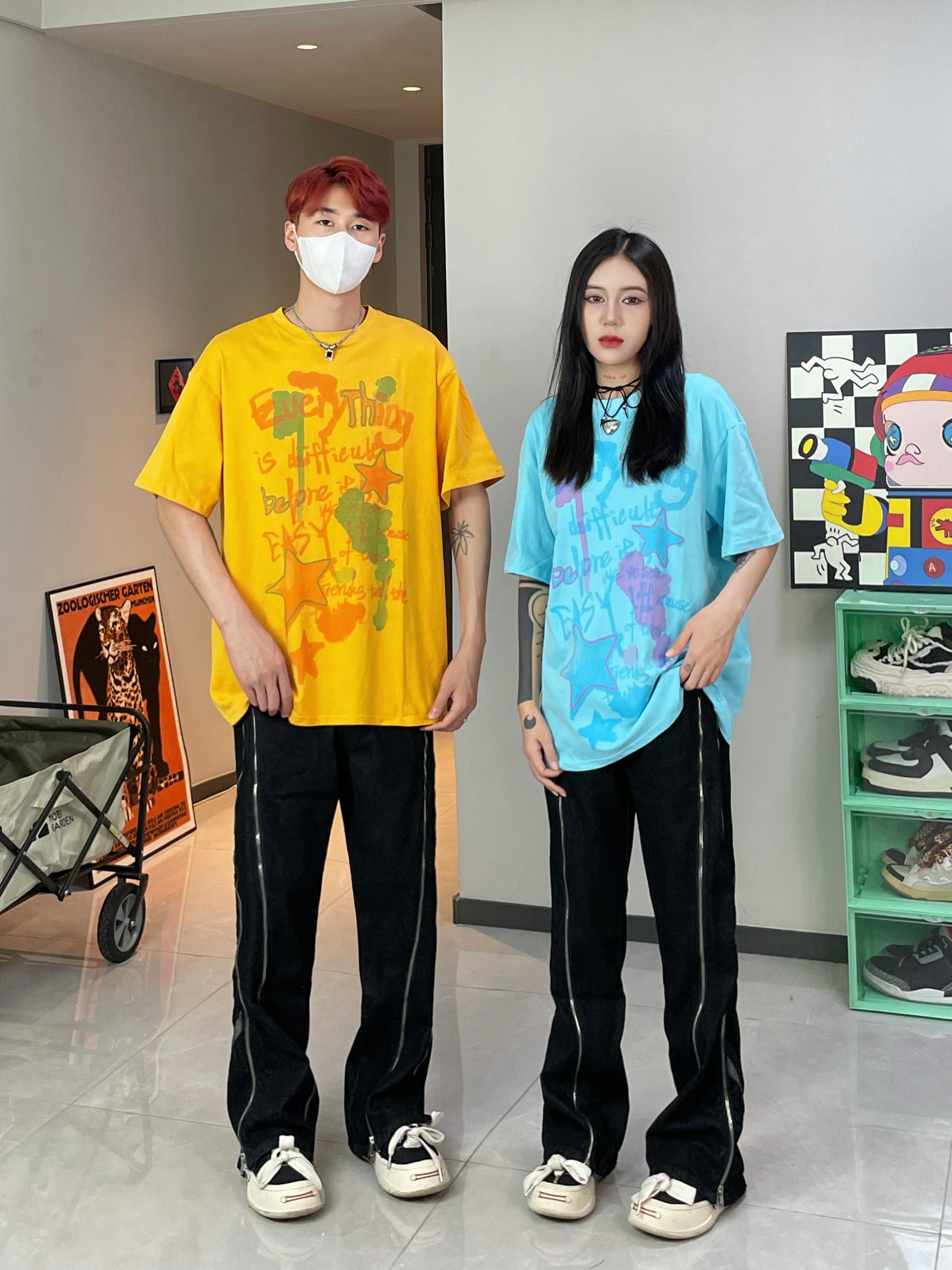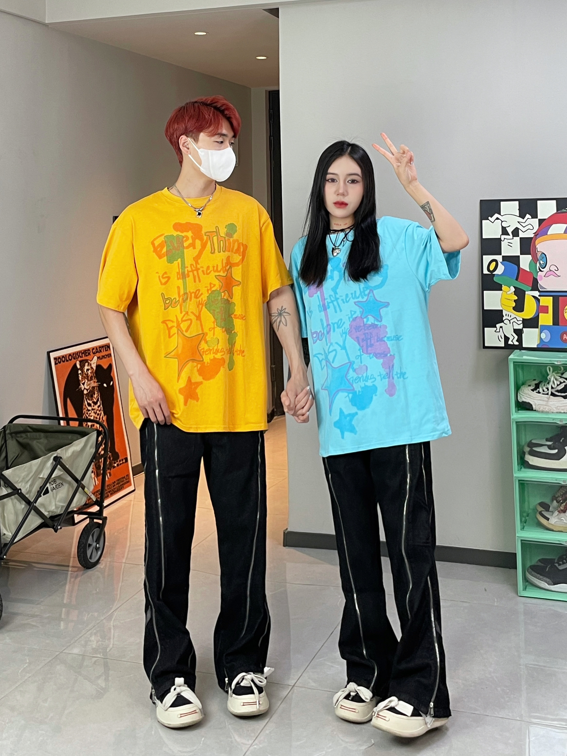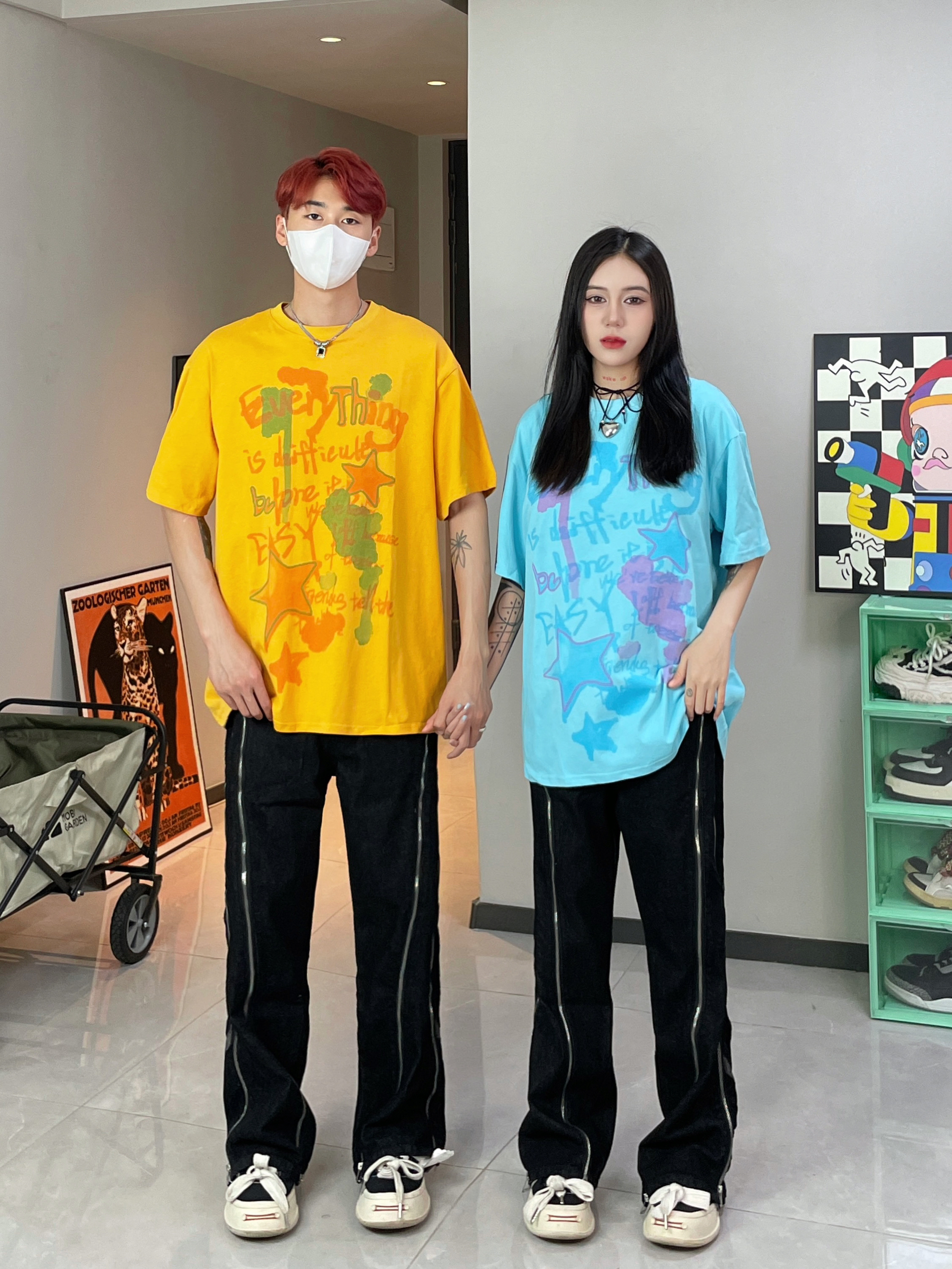 多巴胺色彩穿搭太适合夏季啦 撞色情侣穿搭 一整个帅气一夏 搭配上重工拉链设计牛仔裤 太酷啦 👔👖:XXXANBUUZU