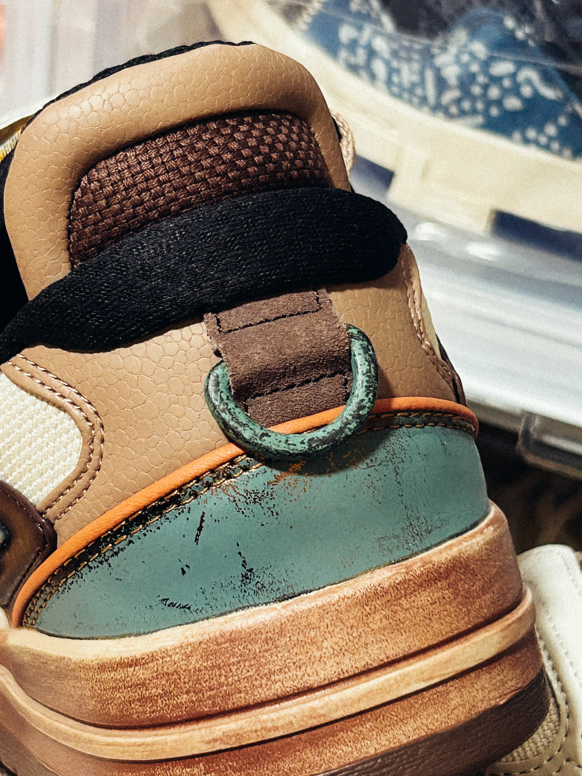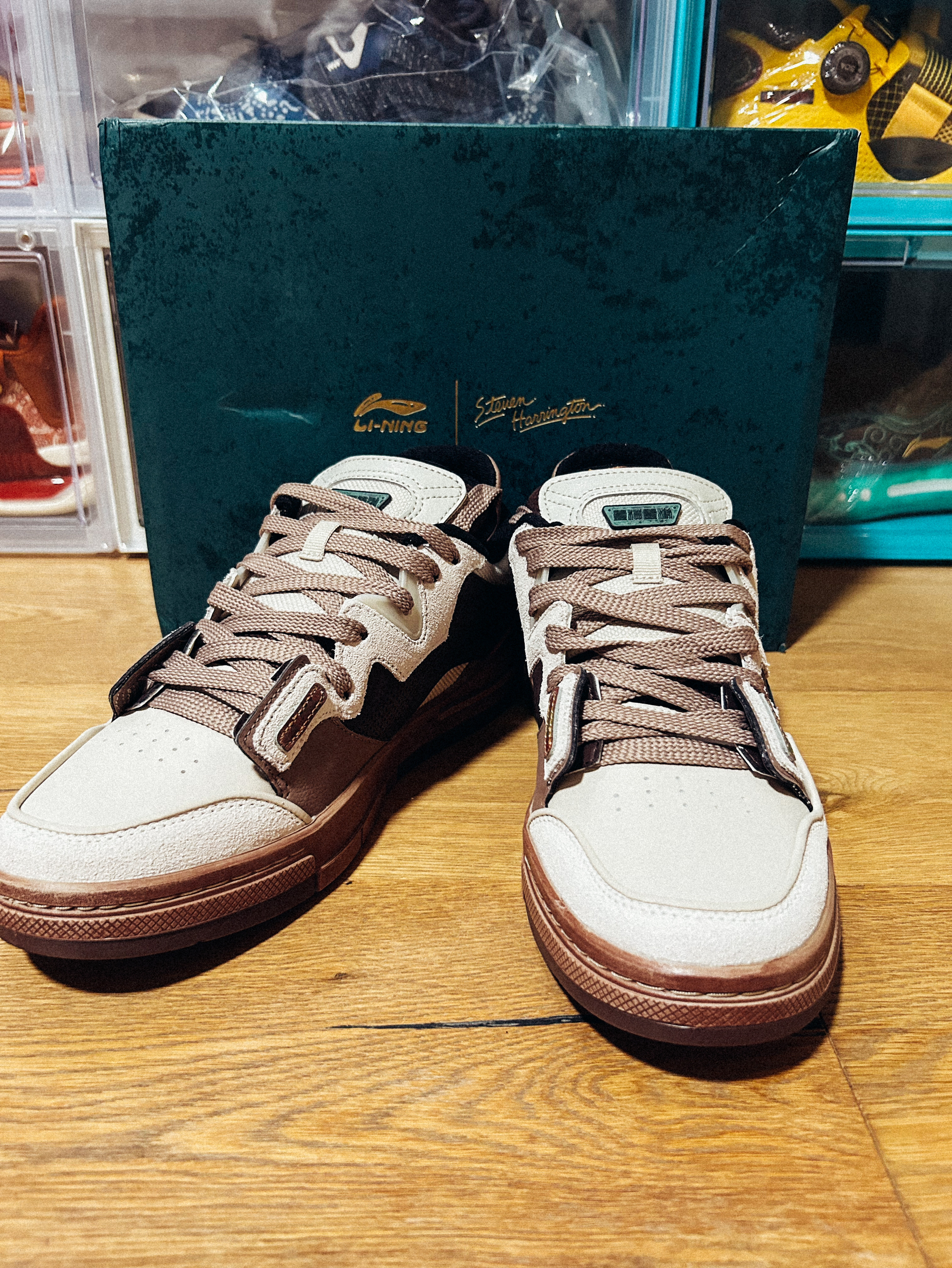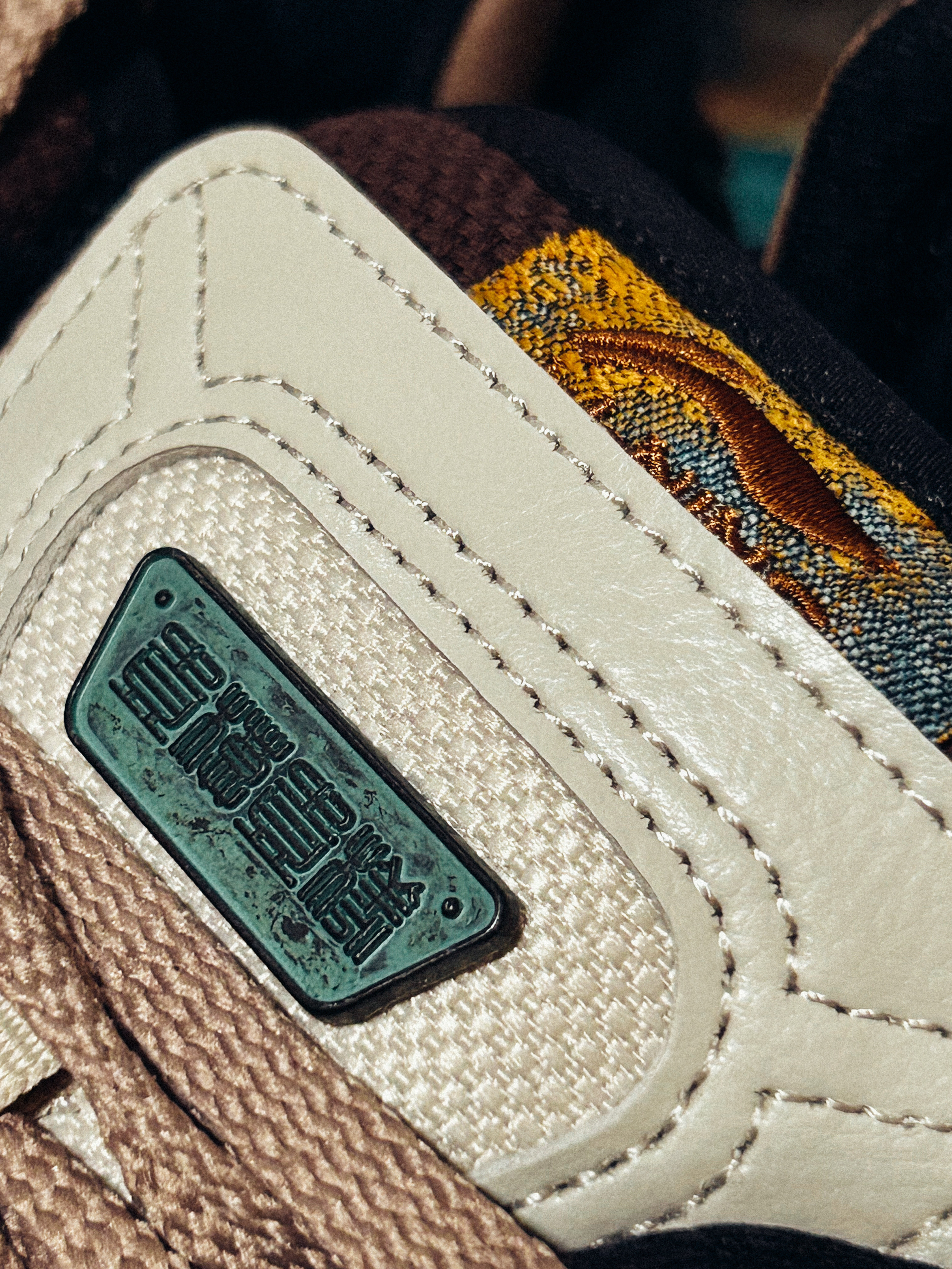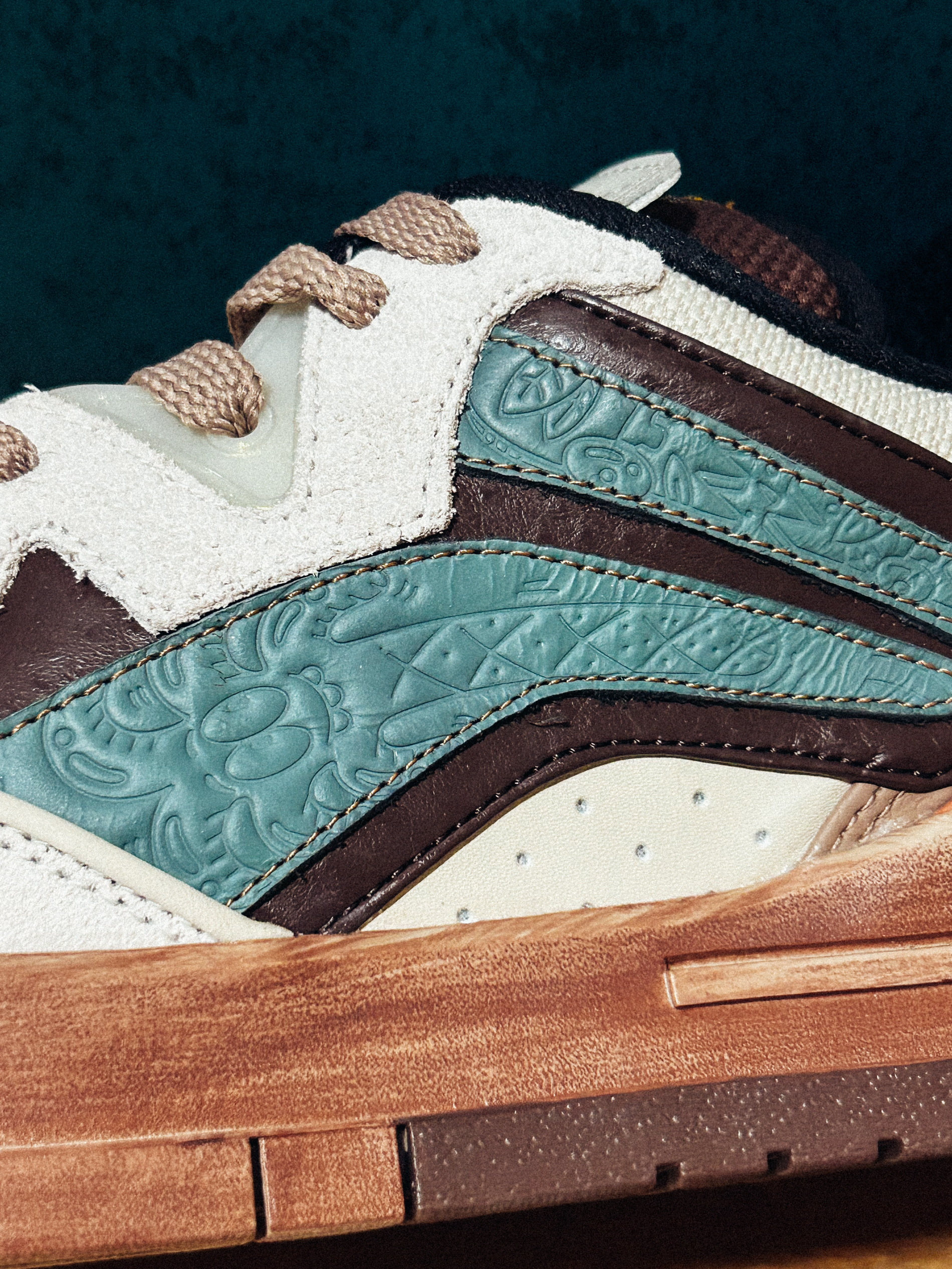 今天给大分享一双特殊配色联名惟吾PRO Steven Harrington联名 青铜器 外观展示 整双鞋充满历史厚重感的棕色为基础配色为主调,材质为合成革,牛剖层革,牛皮革 设计灵感,正是来源于中华民族的瑰宝——青铜器 而青铜器所代表性的青绿色则主要出现在这双板鞋鞋身正面的品牌logo模块上,另外logo模块上加入了撕撕乐设计,也算是增添了这双板鞋的趣味性。Steven Harrington经典...