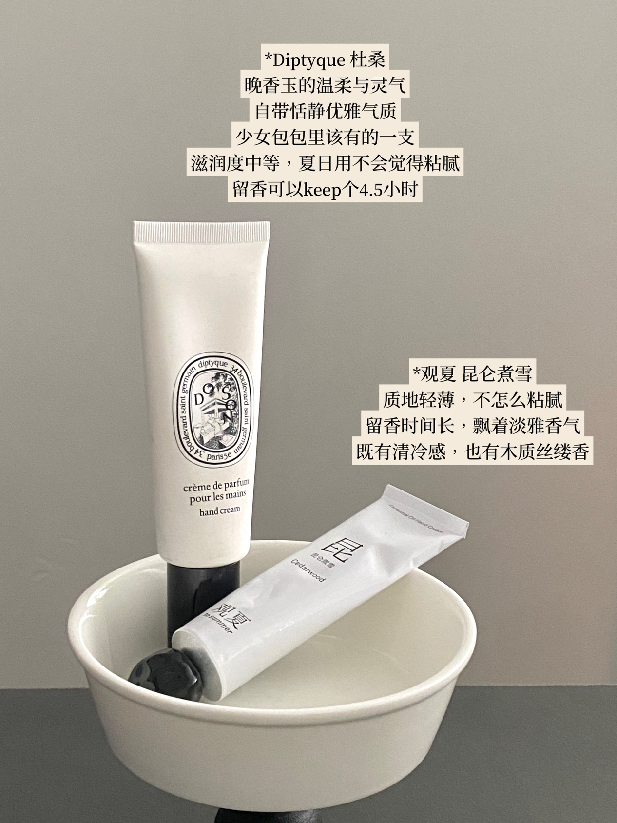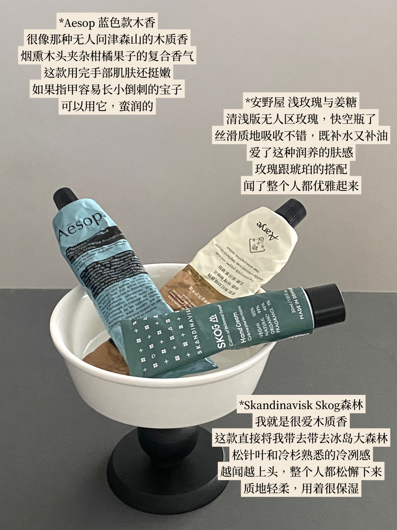 手霜是我回购率很高的一个品类 包包、梳妆台、车上随处都要备一支 今天分享一下小众香薰护手霜的选手~ 🧾list请收下! *祖马龙维E护手霜 *祖马龙牡丹与胭红麂绒护手霜 *安野屋浅玫瑰与姜糖护手霜 *skandinavisk森林护手霜 *diptyque杜桑 *aesop蓝色款木香护手霜 *观夏昆仑煮雪 #香薰护手霜 #小众香薰 #护手霜