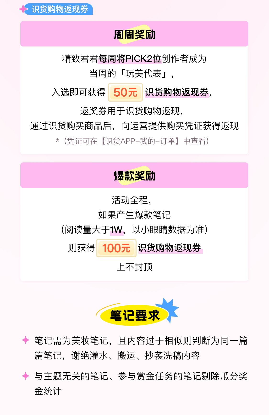 发布以下内容方向,既有机会赢购物返现金! 活动奖励 1、瓜分奖励 在本话题下分享符合主题的美妆笔记数≥5,即可参与现金奖励瓜分 活动符合条件的笔记数达1000,则瓜分1000元 活动符合条件的笔记数达2000,则瓜分2000元 2、识货购物返现券 【周周奖励】精致君君每周将PICK 2位创作者成为当周的「玩美代表」,入选即可获得「50元识货购物返现券」,返奖券用于识货购物返现,通过识货购买商...