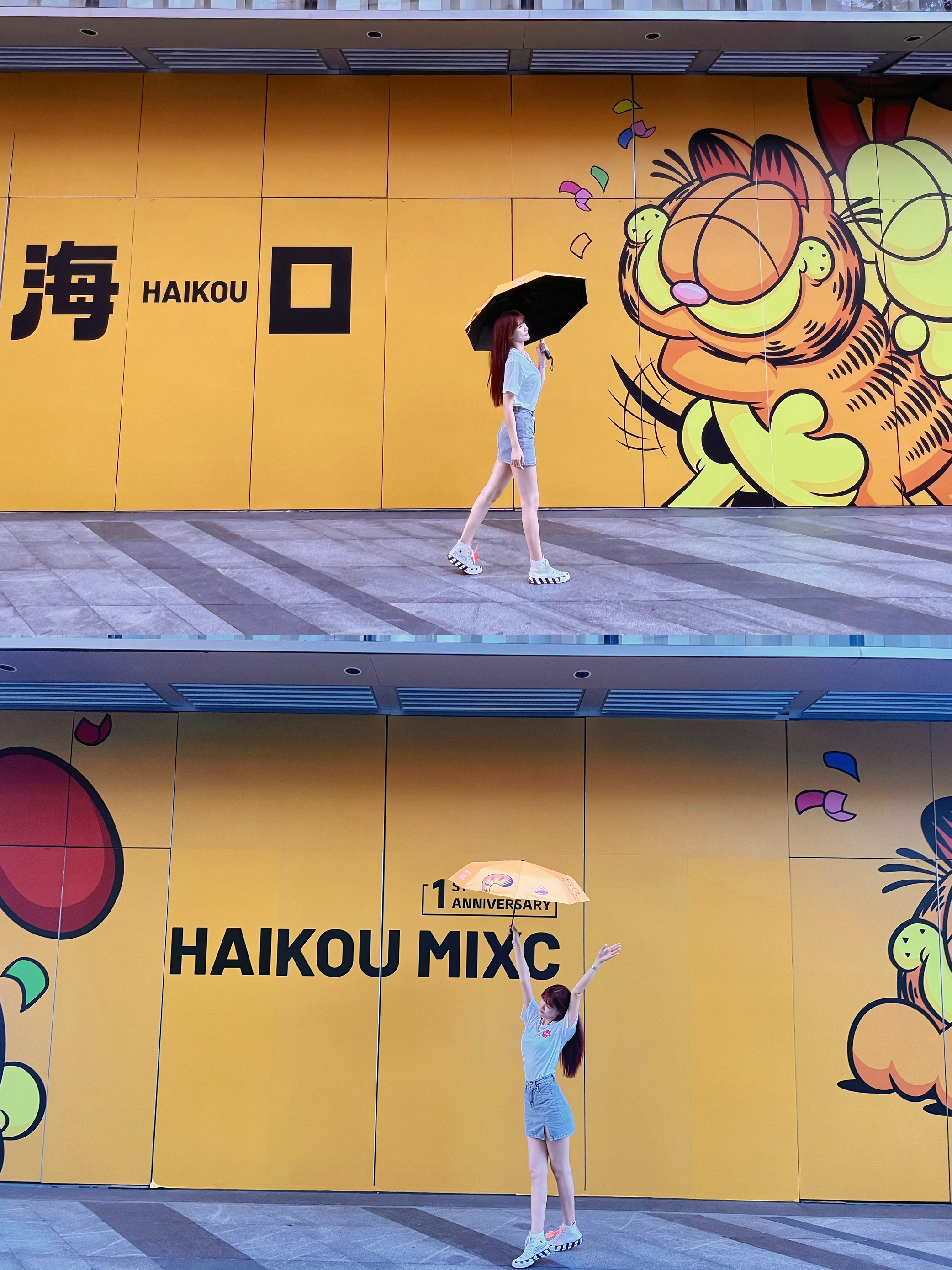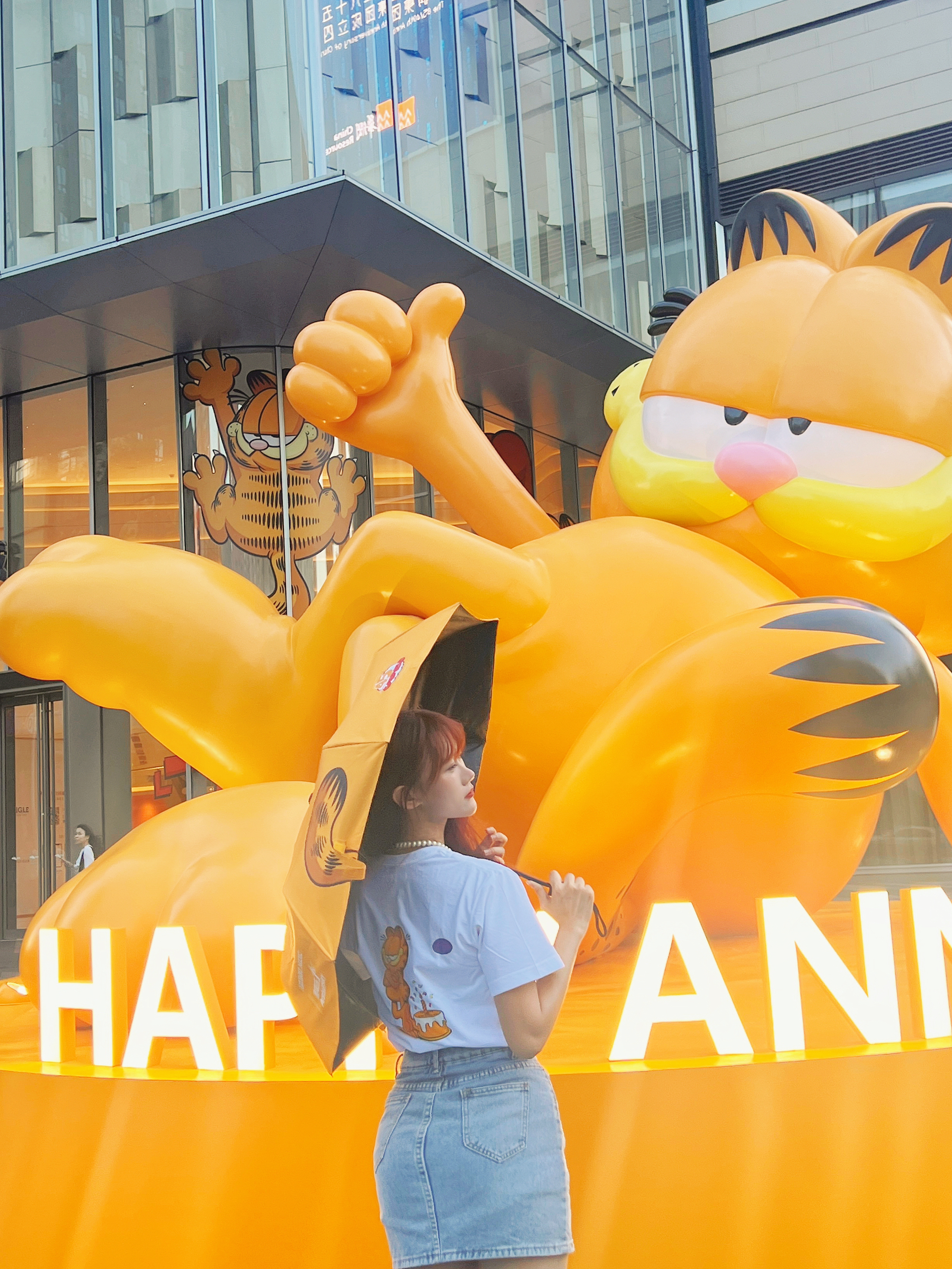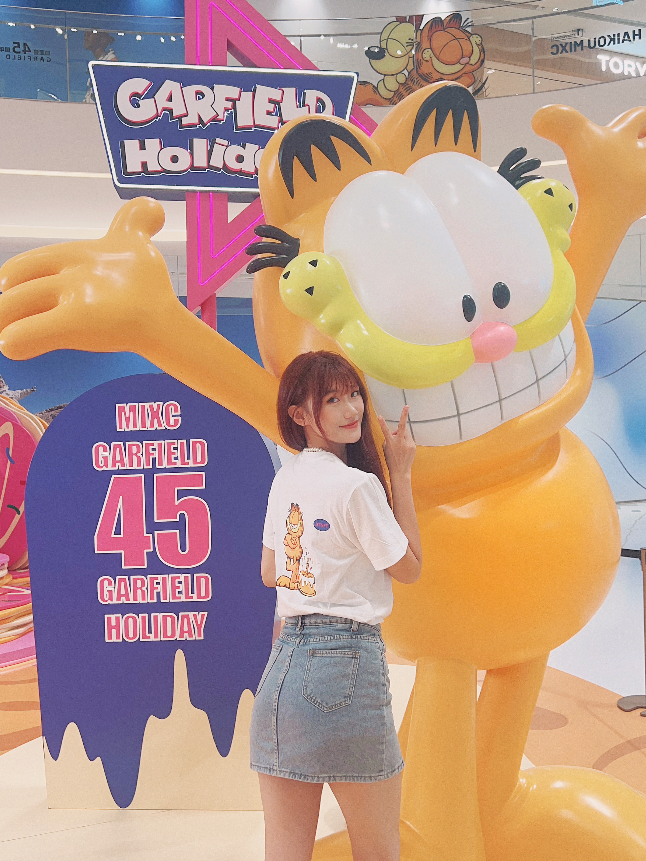 海口万象城1周年加菲猫降临咯 简直就是童年回忆,卡通版加菲猫好可爱哦 来这儿还有好多加菲猫主题打卡拍照地方 - 今天穿了加菲猫主题周边上衣 下身搭配百搭牛仔短裙 增加了学生风格俏皮感