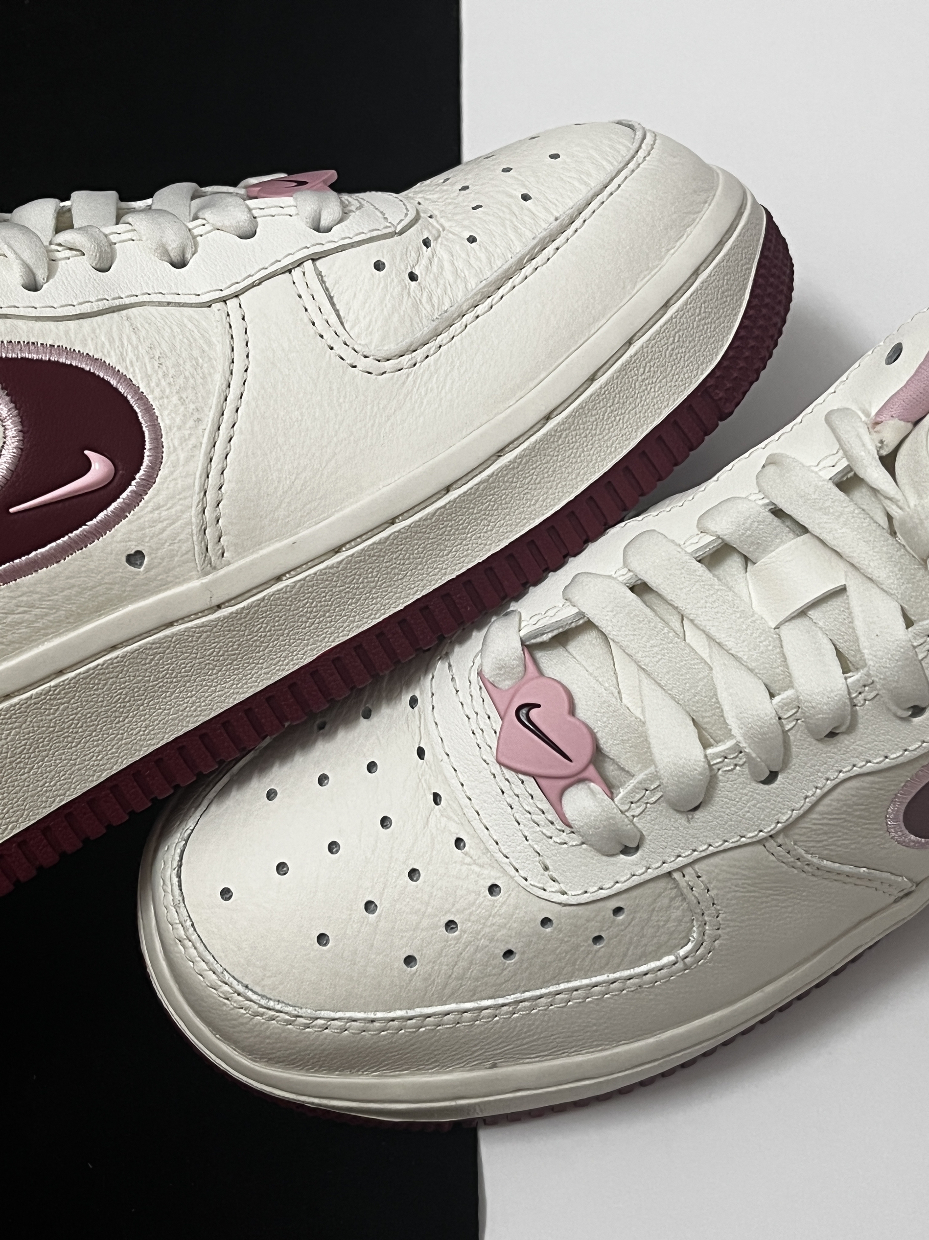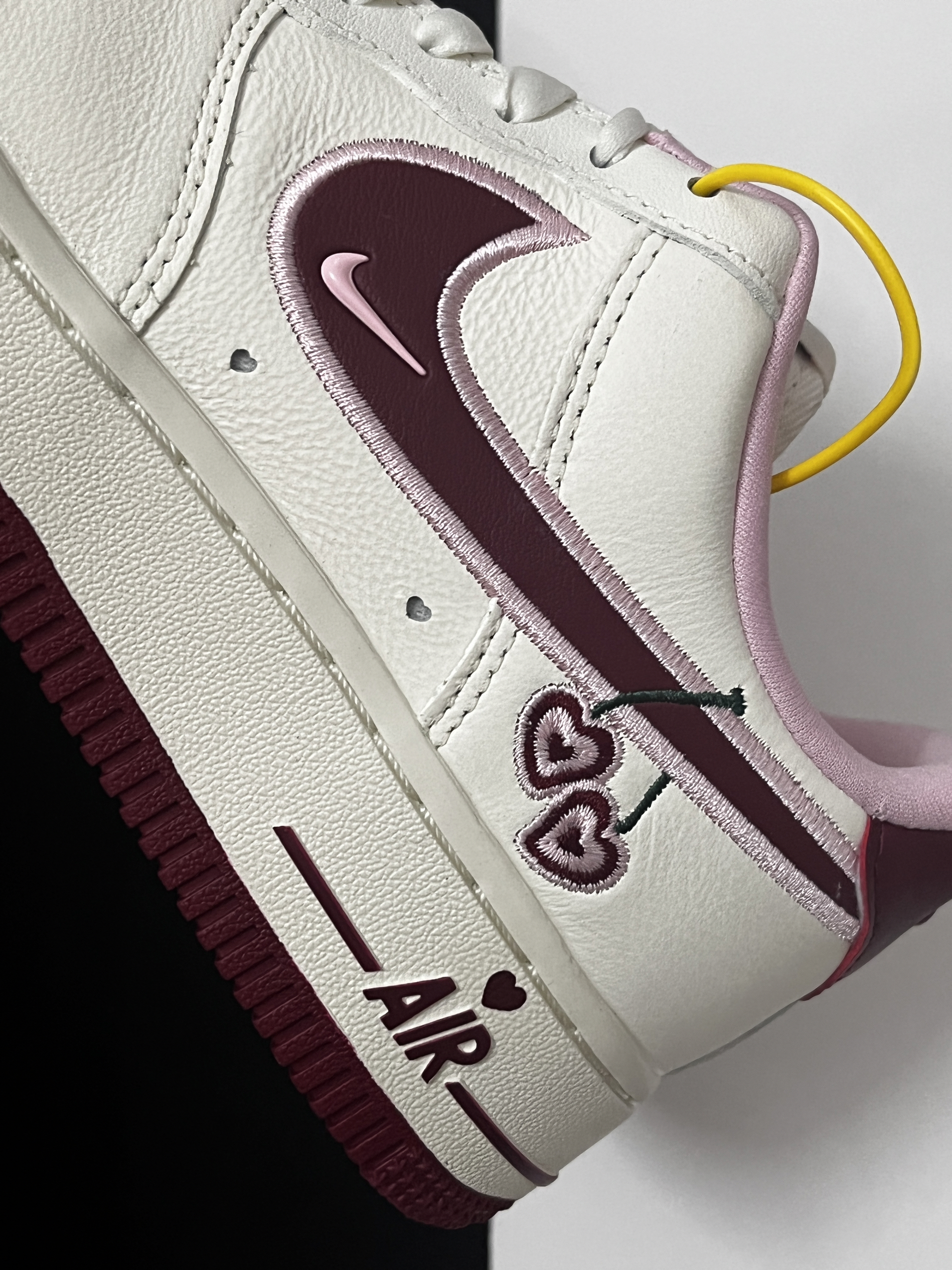 🔸这一双粉色的情人节空军一号,它鞋身有着挺多细节设计的,很有辨识度的酒红色LOGO以及甜蜜的樱桃图案,很有情人节的氛围感。 🔸鞋头处的皮革材质摸起来很软,按压下去有着明显的回弹效果,做工很到位。 🔸穿搭方面可以选择黑色以及粉色短裙穿,这样的穿搭百搭又甜蜜,很显个人气质。尺码正常选择就行,脚瘦可以考虑选小0.5码。