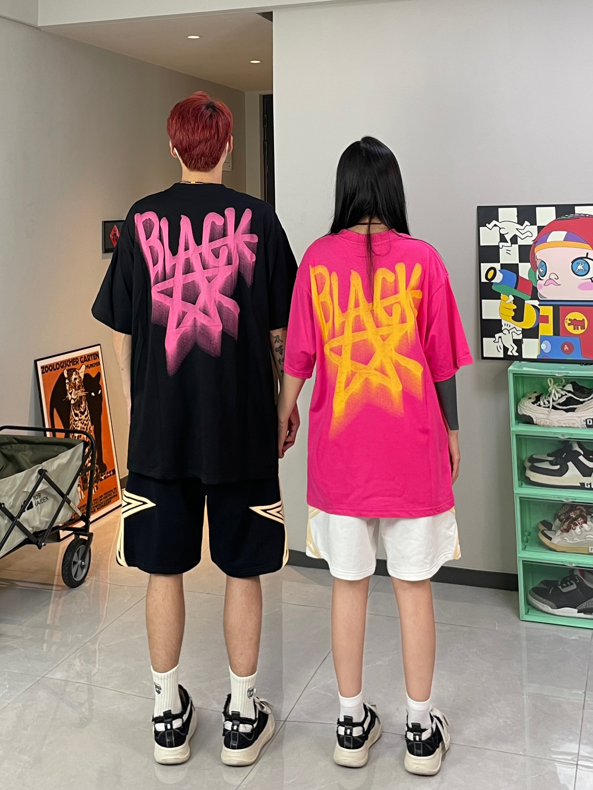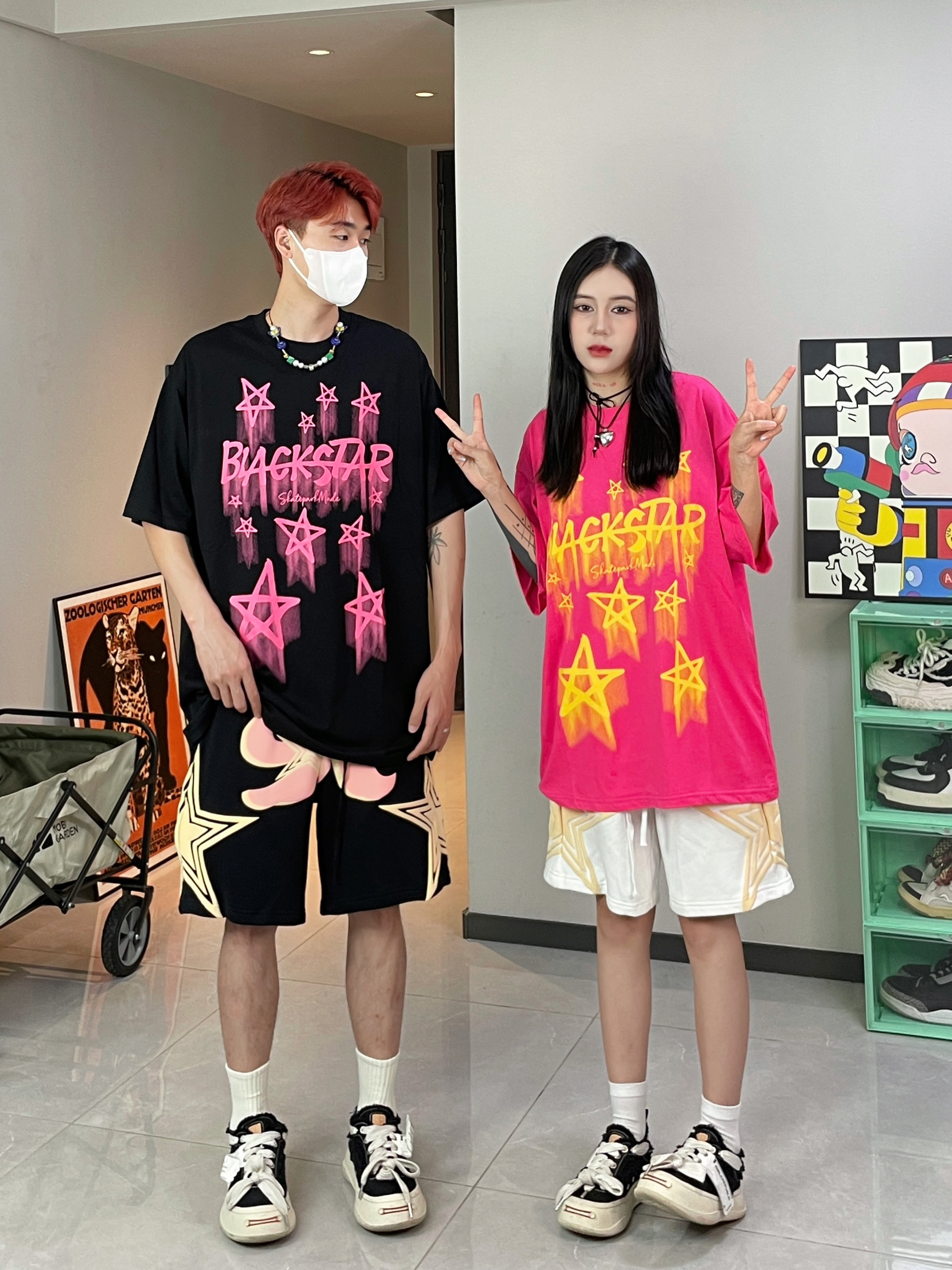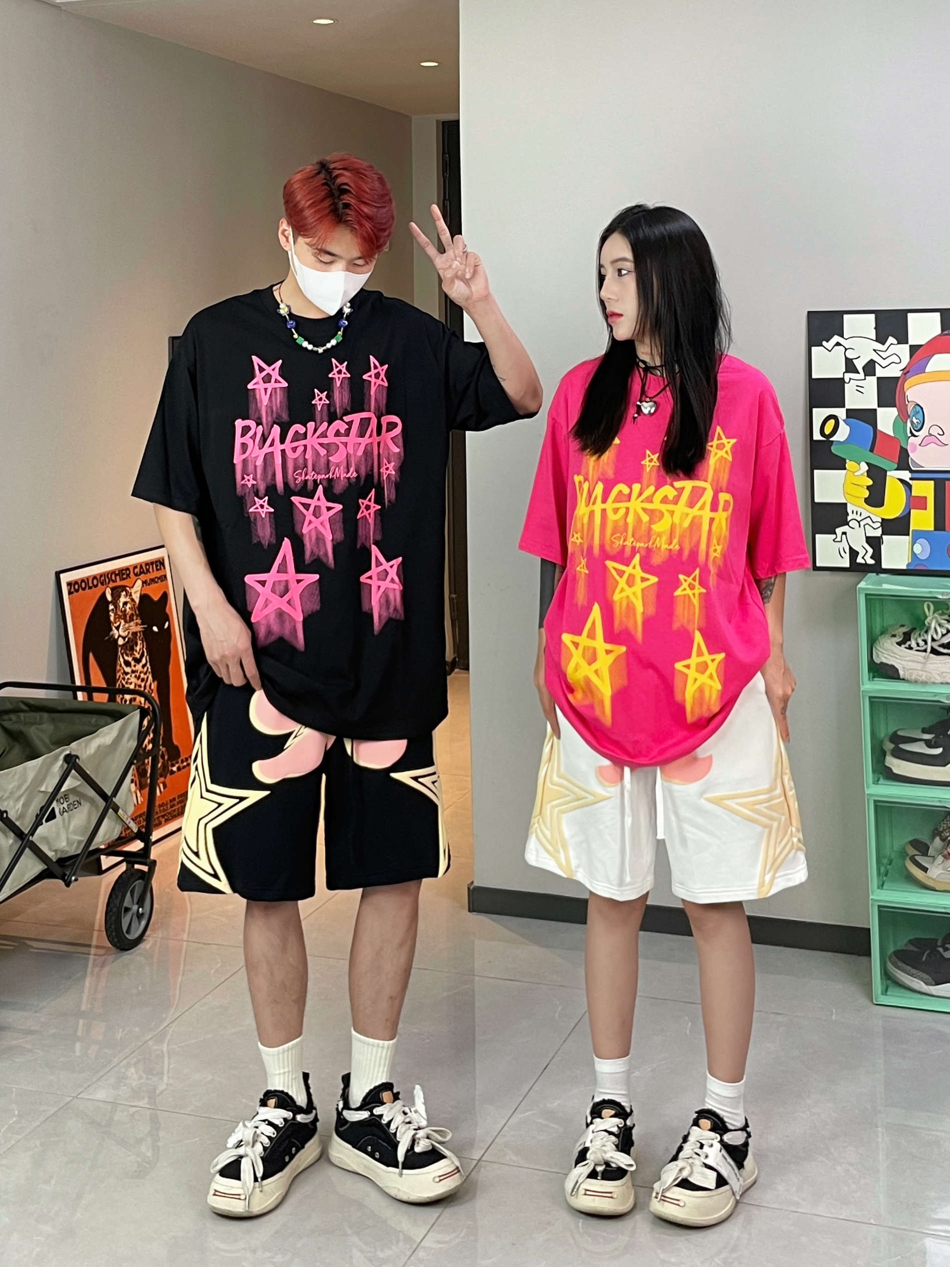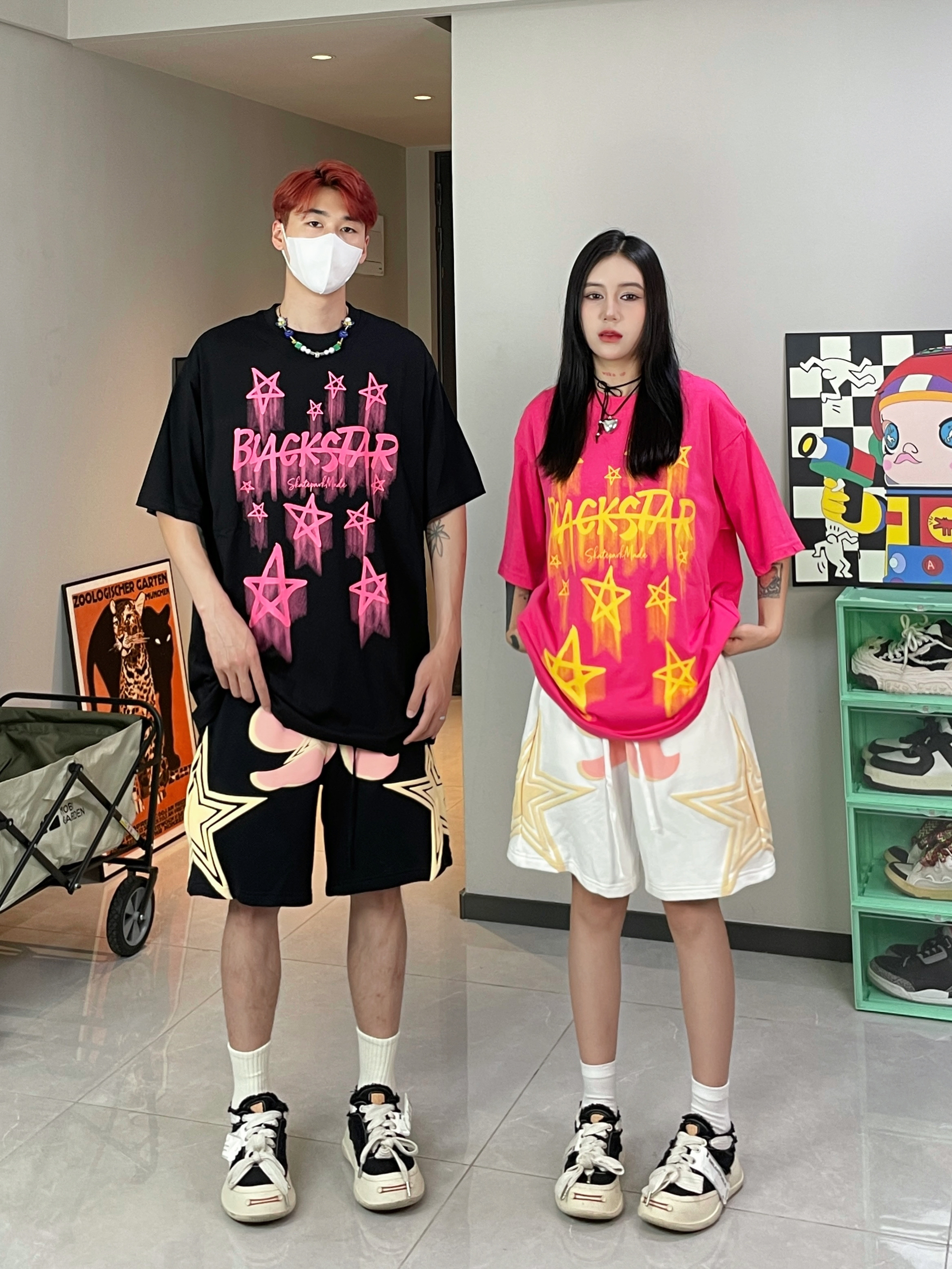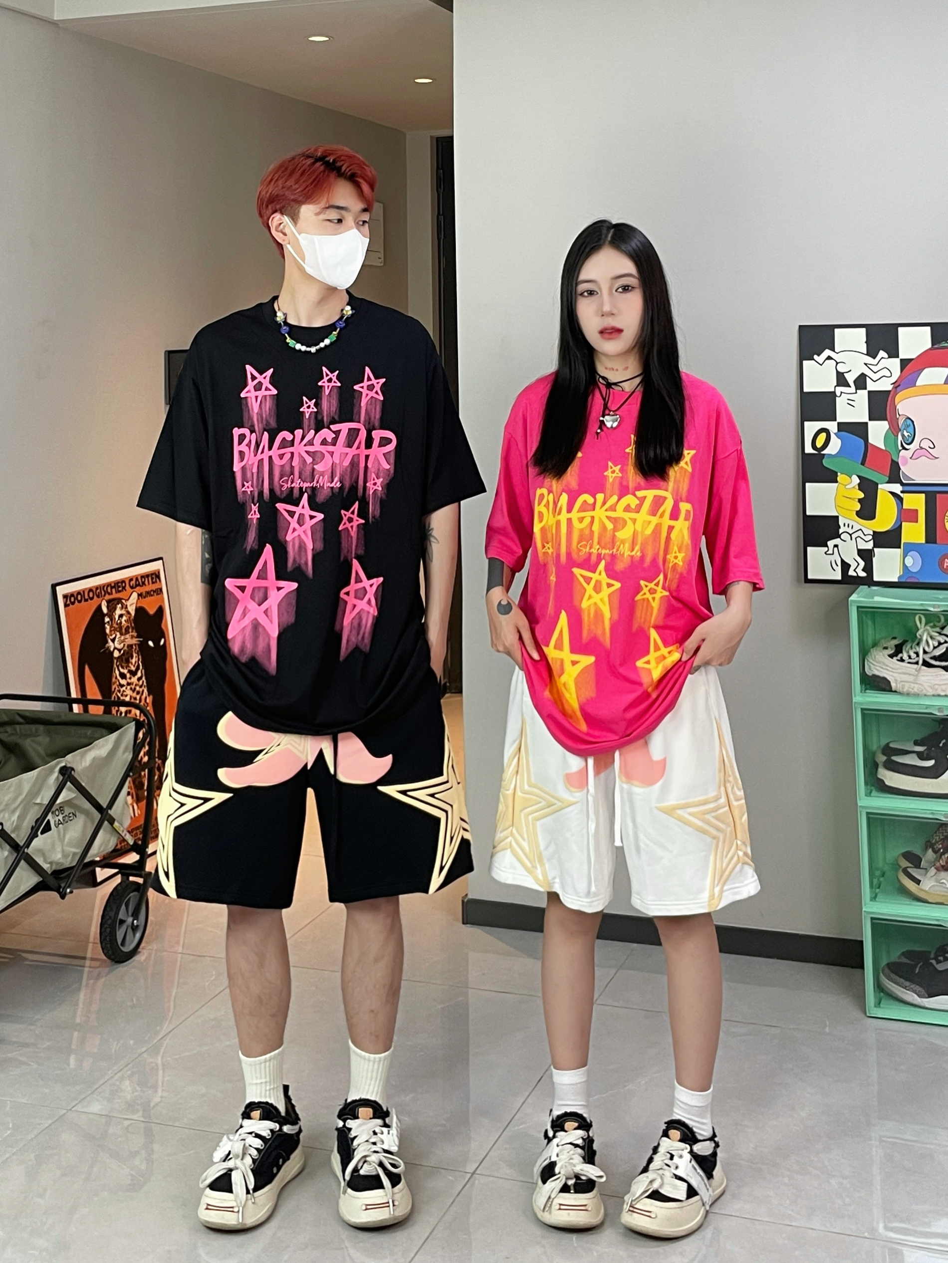 美式t恤太好穿啦 宽松版型不挑人男女都可驾驭 做旧水洗面料面料舒适透气 星星印花好好看! 搭配上色彩休闲短裤~ 一整个美式休闲风拿捏住了🥰 👔👖:XXXANBUUZU (🍑)