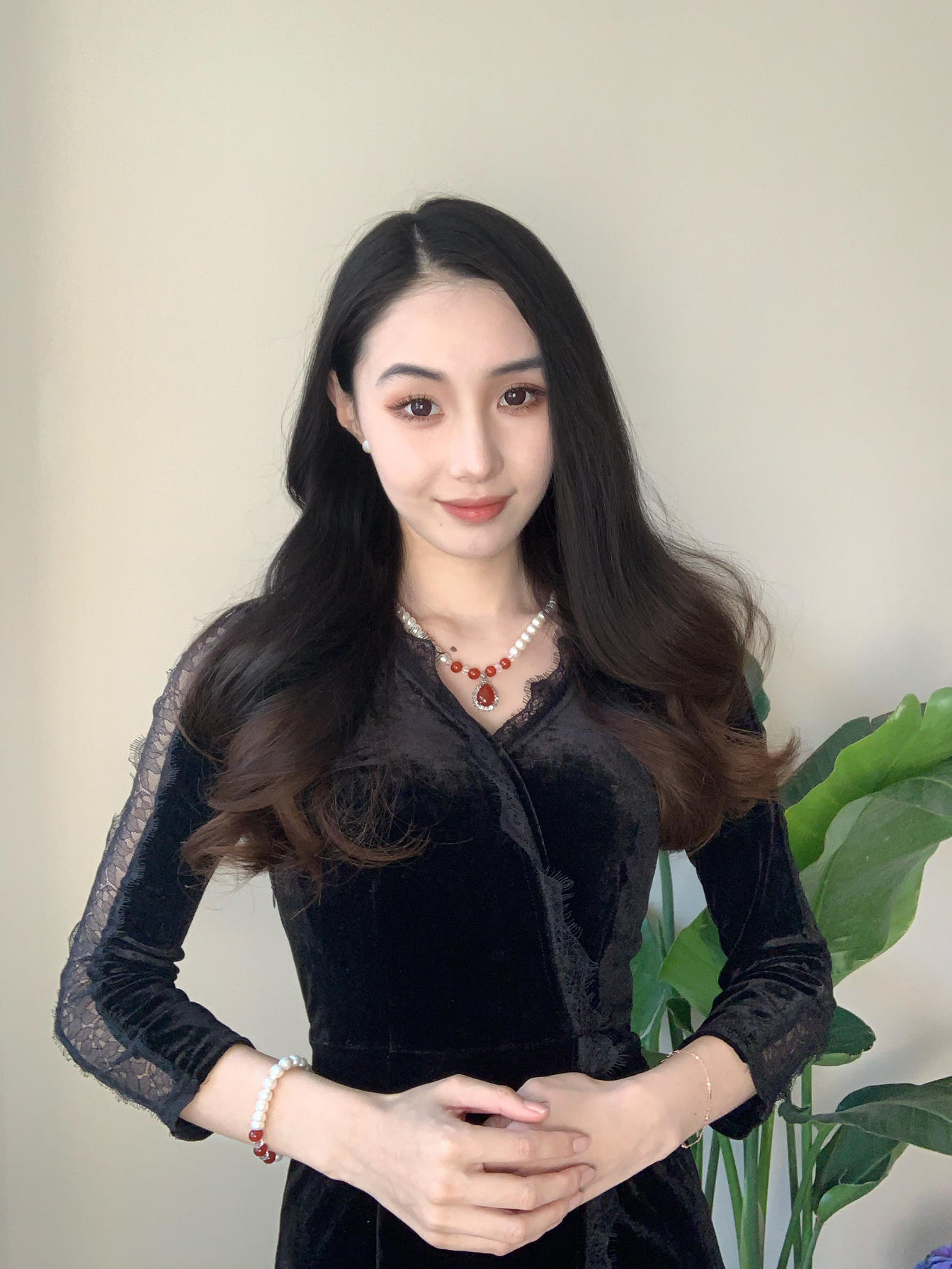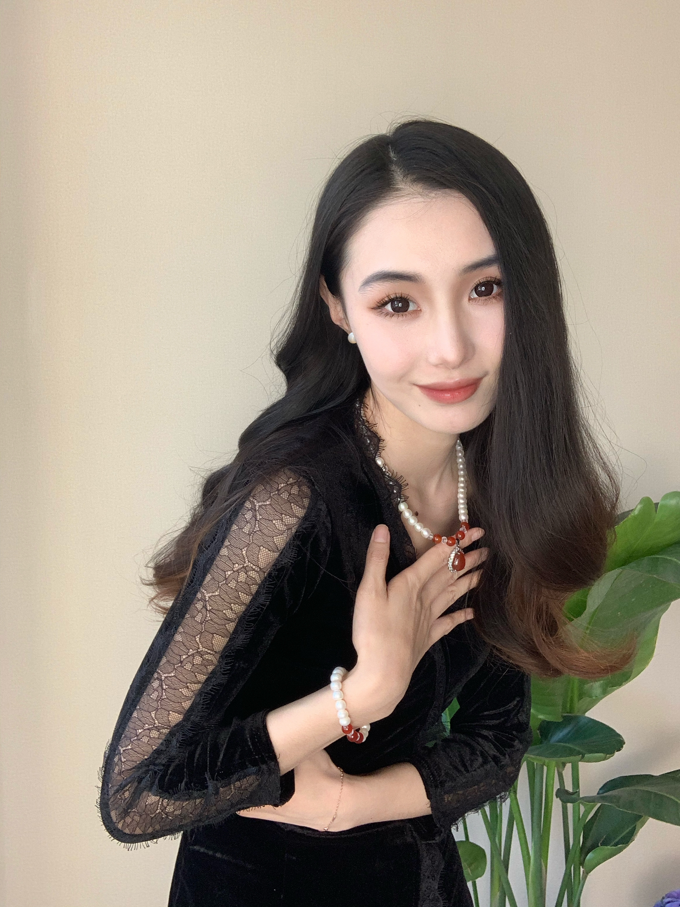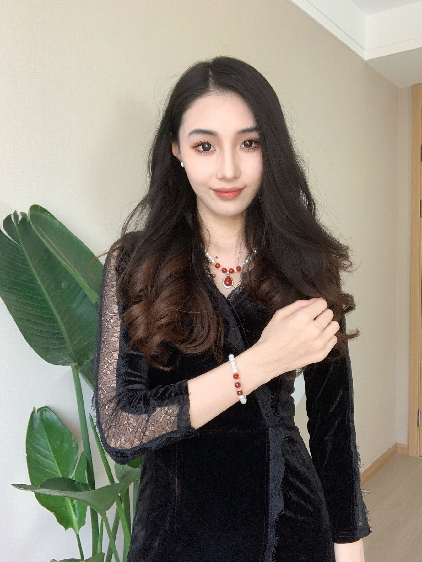 我发现我卷大波浪好显年龄大 一种姨味~ 再穿上丝绒蕾丝质感的连衣裙 简直了! 戴上珍珠项链 珍珠耳环 珍珠手链 显的皮肤好白 显得整个人温柔多了~