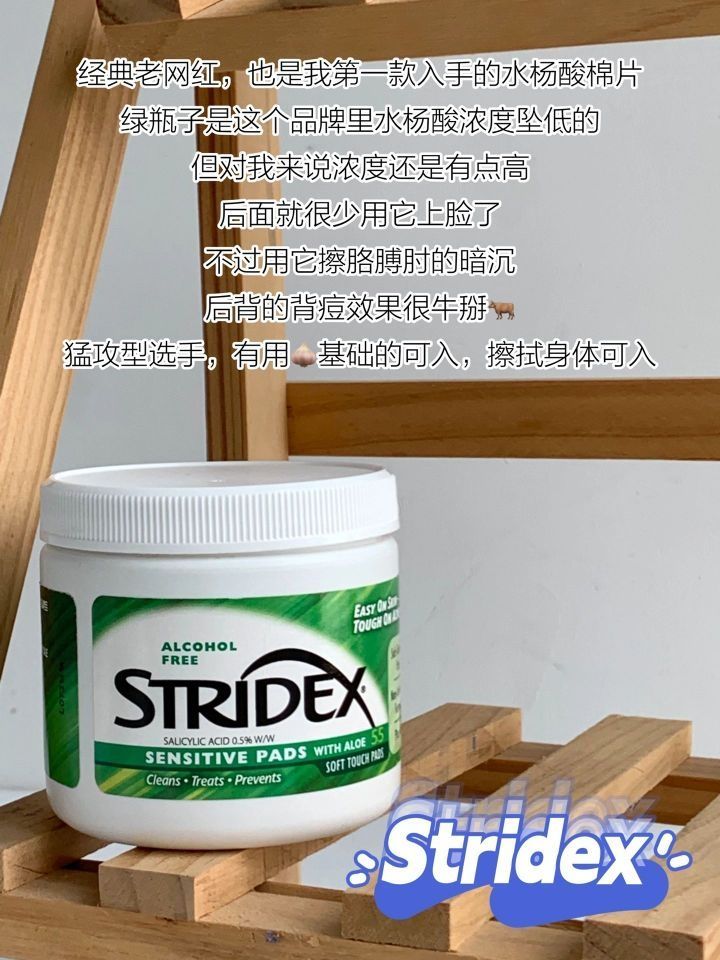 油痘肌护肤经验6年,前前后后用过不少护肤品 发现水杨酸真的是一大祛痘利器,不会选水杨酸棉片的家人们赶紧码!! 按功效需求分类,理性种草,希望各位油痘肌宝子们在战痘路上满分毕业~ - ✅Stridex水杨酸棉片 经典老网红,也是我第一款入手的水杨酸棉片,绿瓶子是这个品牌里水杨酸浓度坠低的,但对我来说浓度还是有点高,后面就很少用它上脸了,不过用它擦胳膊肘的暗沉,后背的背痘效果很牛掰,猛攻型选手,有用🧄...