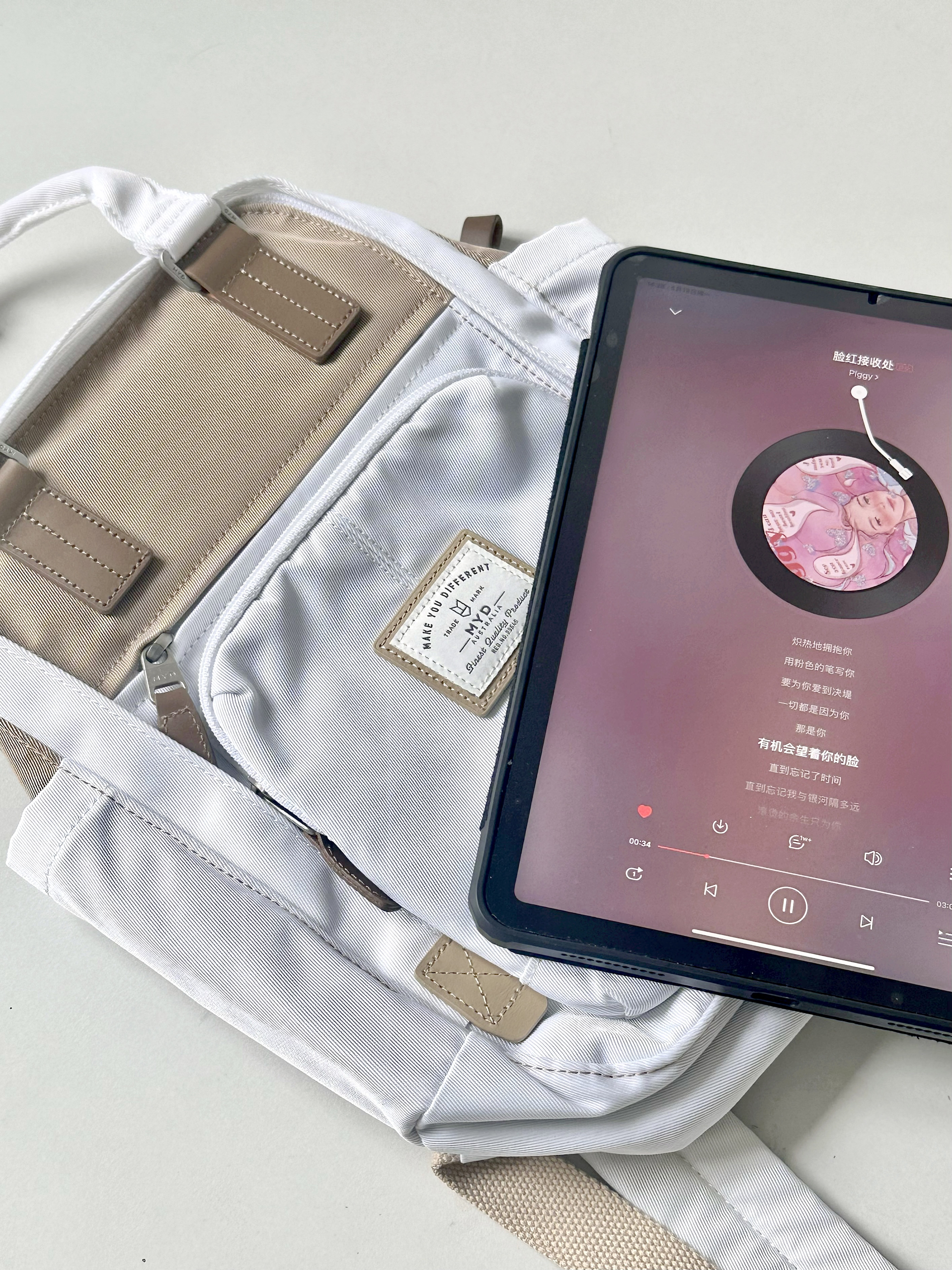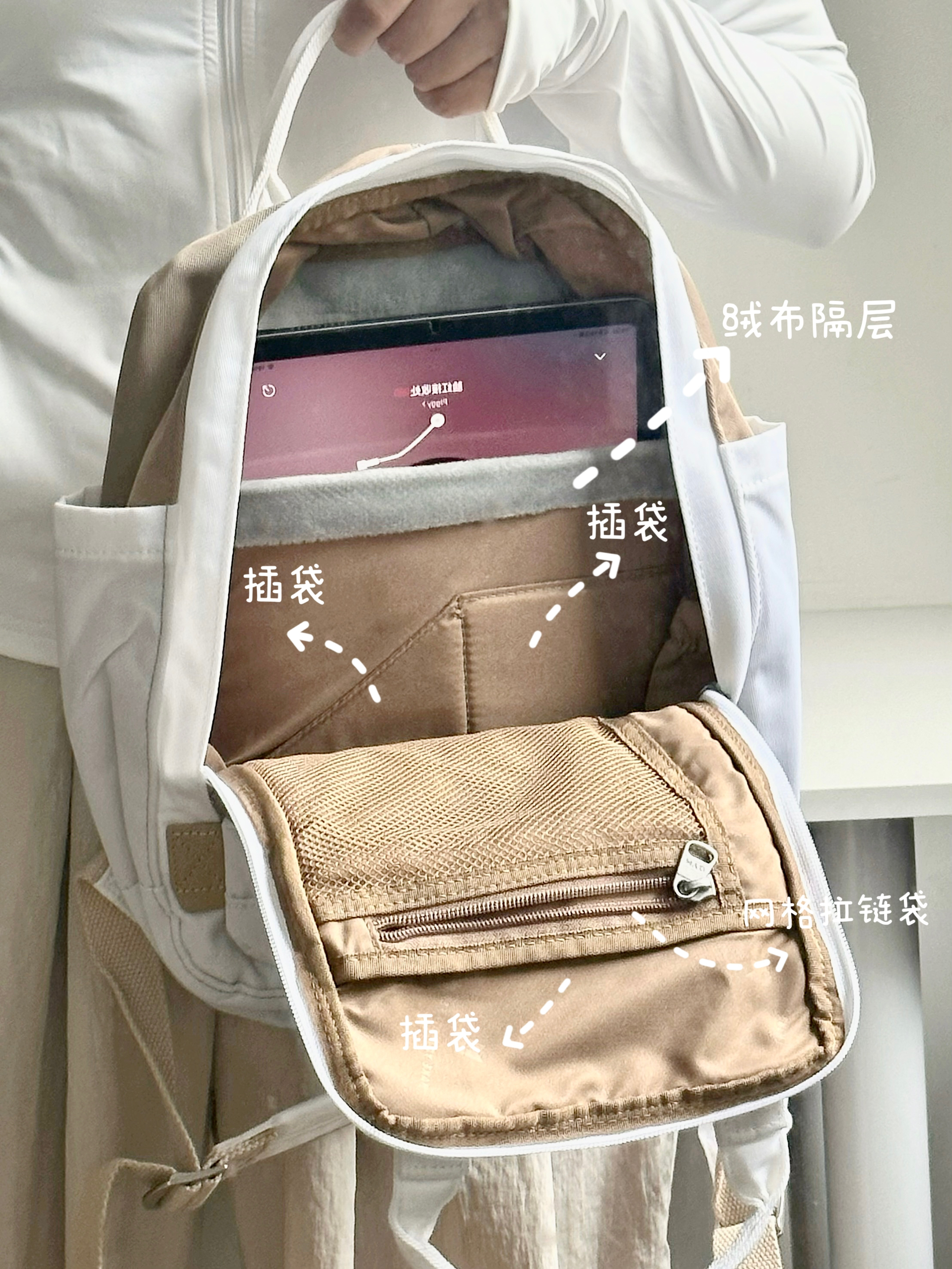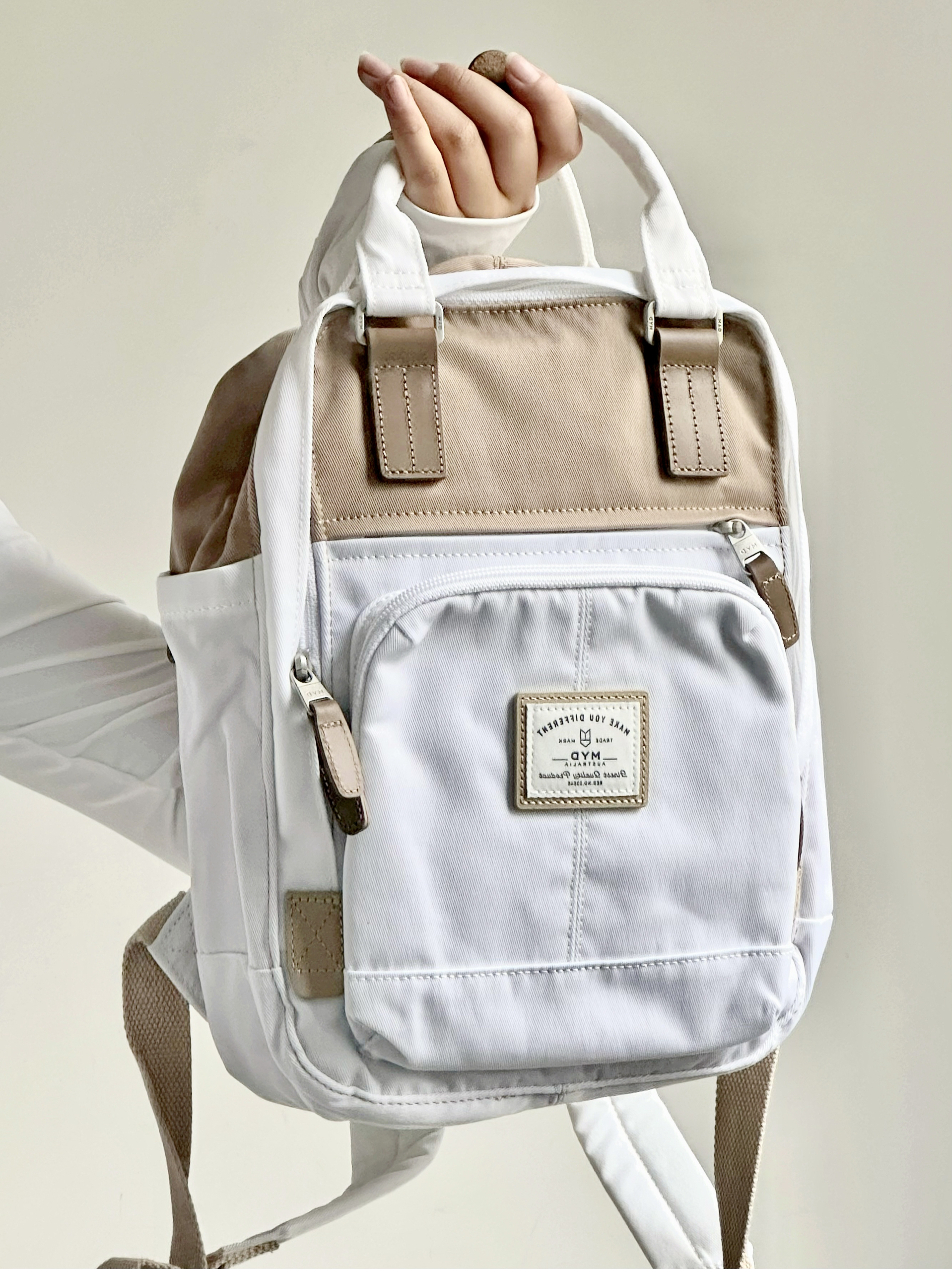 MYD双肩包的香草拿铁☕️配色太韩啦!!! 炒鸡适合矮个子女生背! 别看它小!容量还挺大!! 上课装个ipad➕几本书不在话下! 还有很多插袋和口袋!! 不用担心零碎小东西多弄乱包包噜~