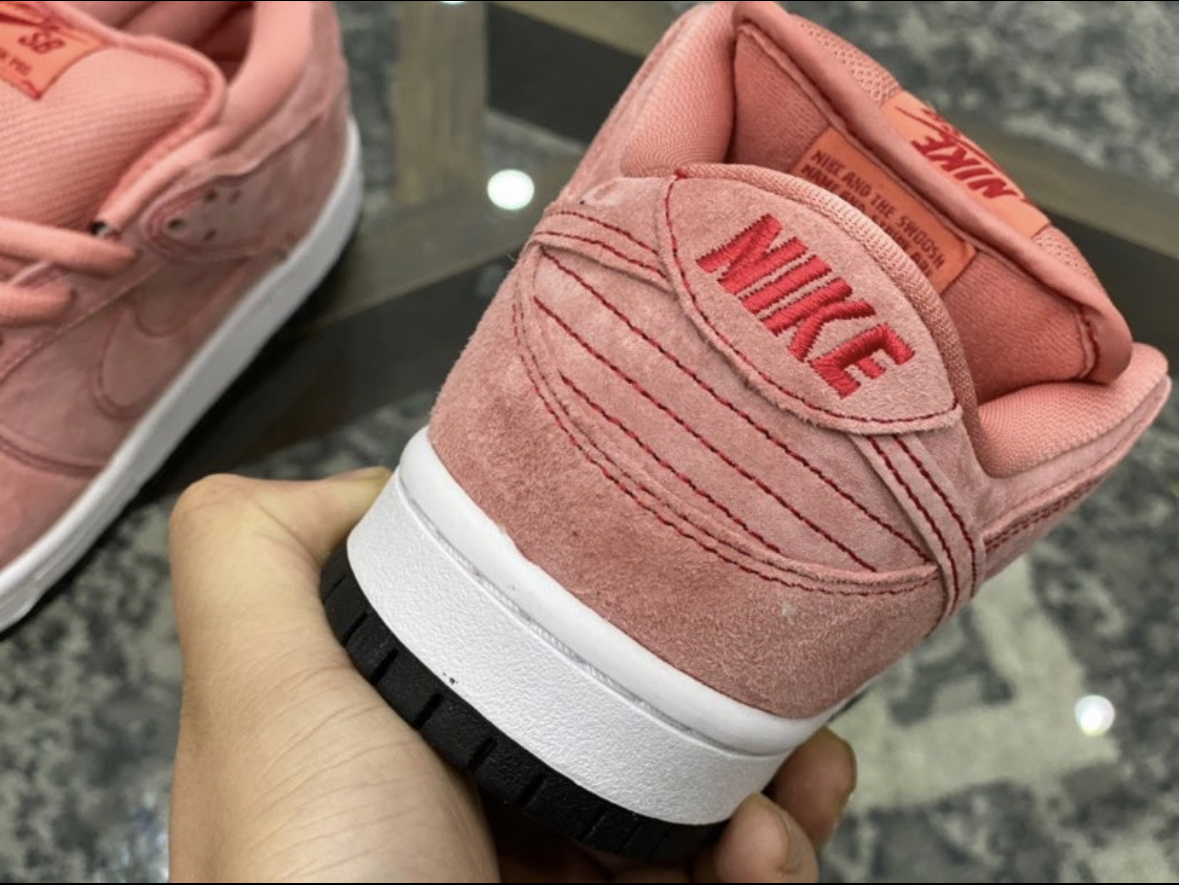 球鞋名称 Nike sB Dunk Low Pro PRM "Pink Pig" 粉 猪 这款Dunk 的配色来源于1971年勒芒赛车上首次 亮相的 Pink Pig”保时捷 917/20 赛车。以经典的 Nike SB Dunk Low 为基础设计蓝本,并且采用了保时捷的橡皮 粉配色覆盖鞋身整体。鞋身使用了翻毛革材质,鞋舌采 用了网面材质,并且用红色车线勾勒出了细节。 鞋跟 鞋垫/鞋舌的“Nik...