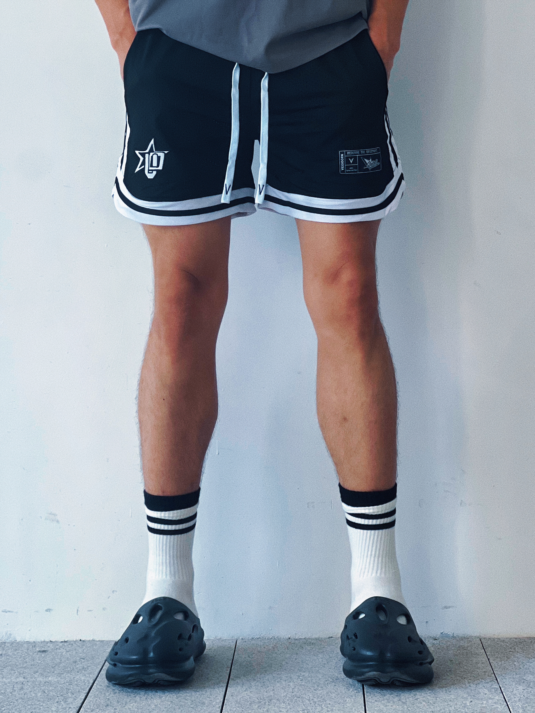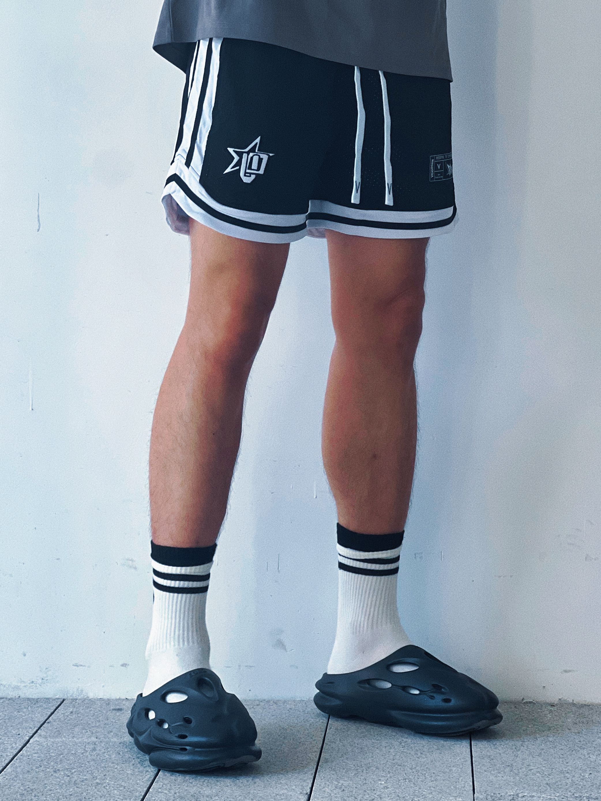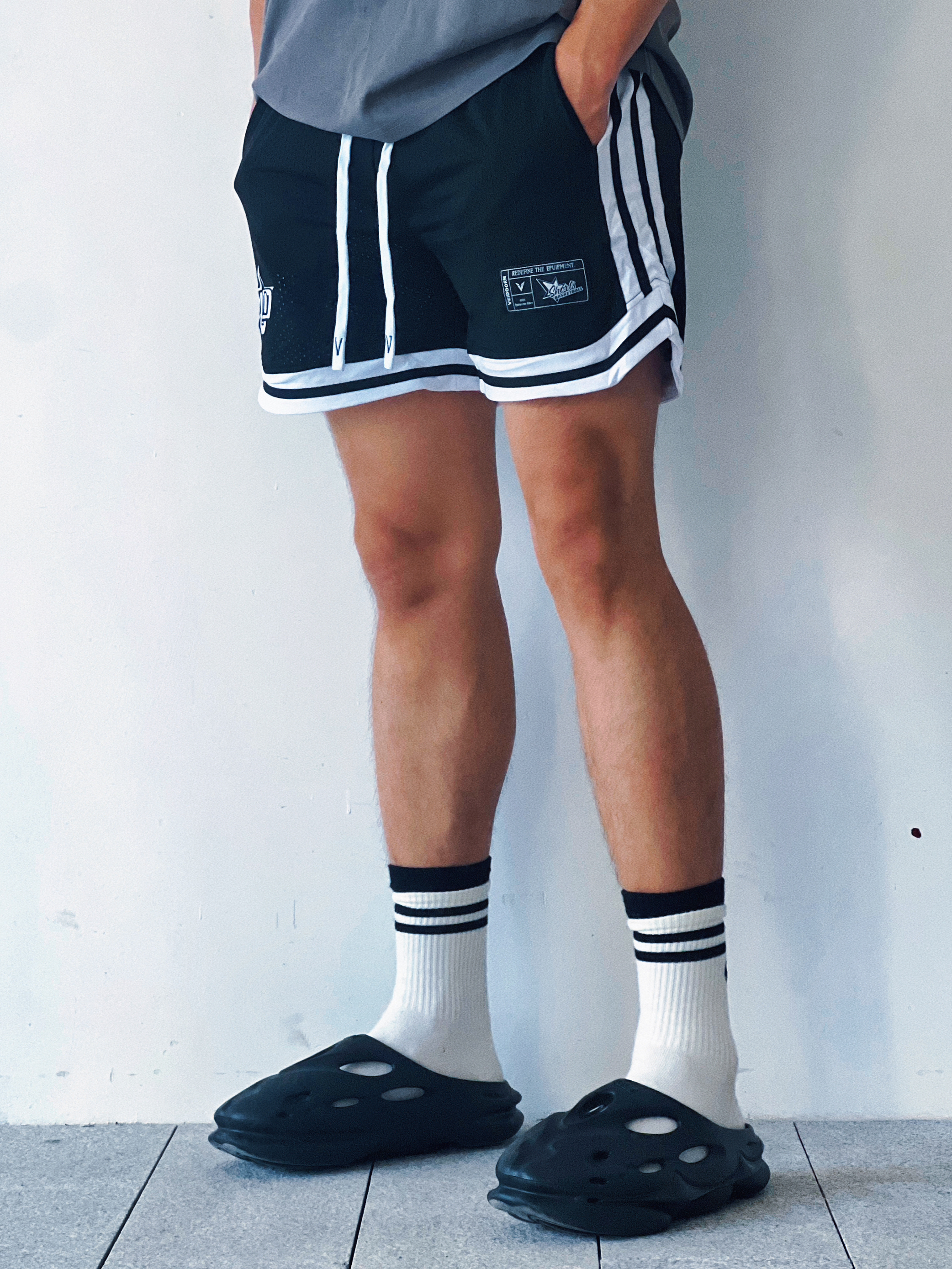 🩳:维动VEDOORN反转系列不过膝训练透气四分运动篮 👟:EQLZ EQUALIZER EQUALIZER 1100 黑豹 环保咖啡渣 香薰 休闲潮流运动 运动拖鞋 男女同款 黑色 短裤球鞋随心配!今天来到EQLZ❌维动! 整体黑武士的搭配再点缀一个黑白条纹袜,整体性十足,并且黑白搭配永远不会出错,出街打球都是不错的选择,喜欢的小伙伴快搭起来吧!