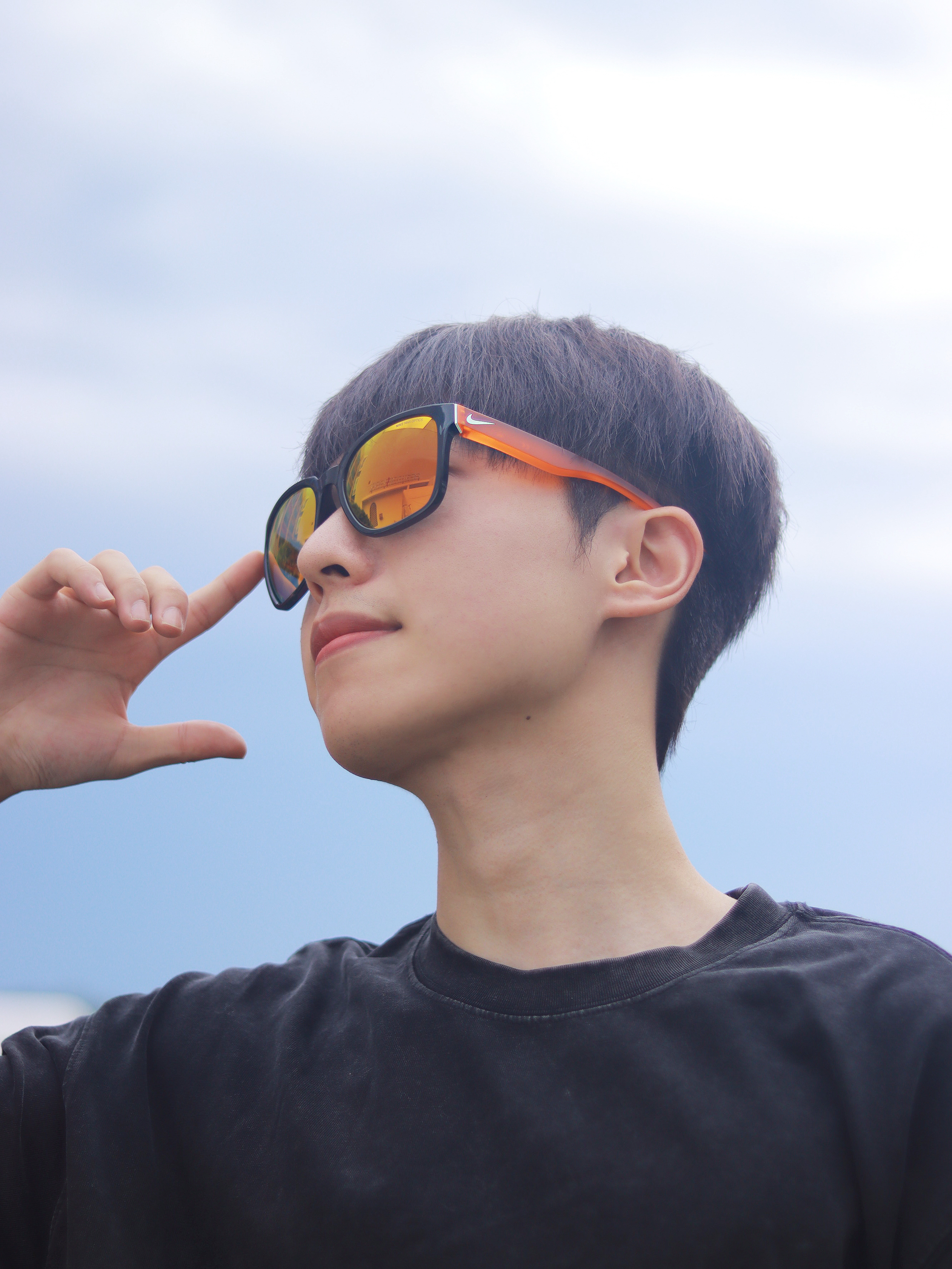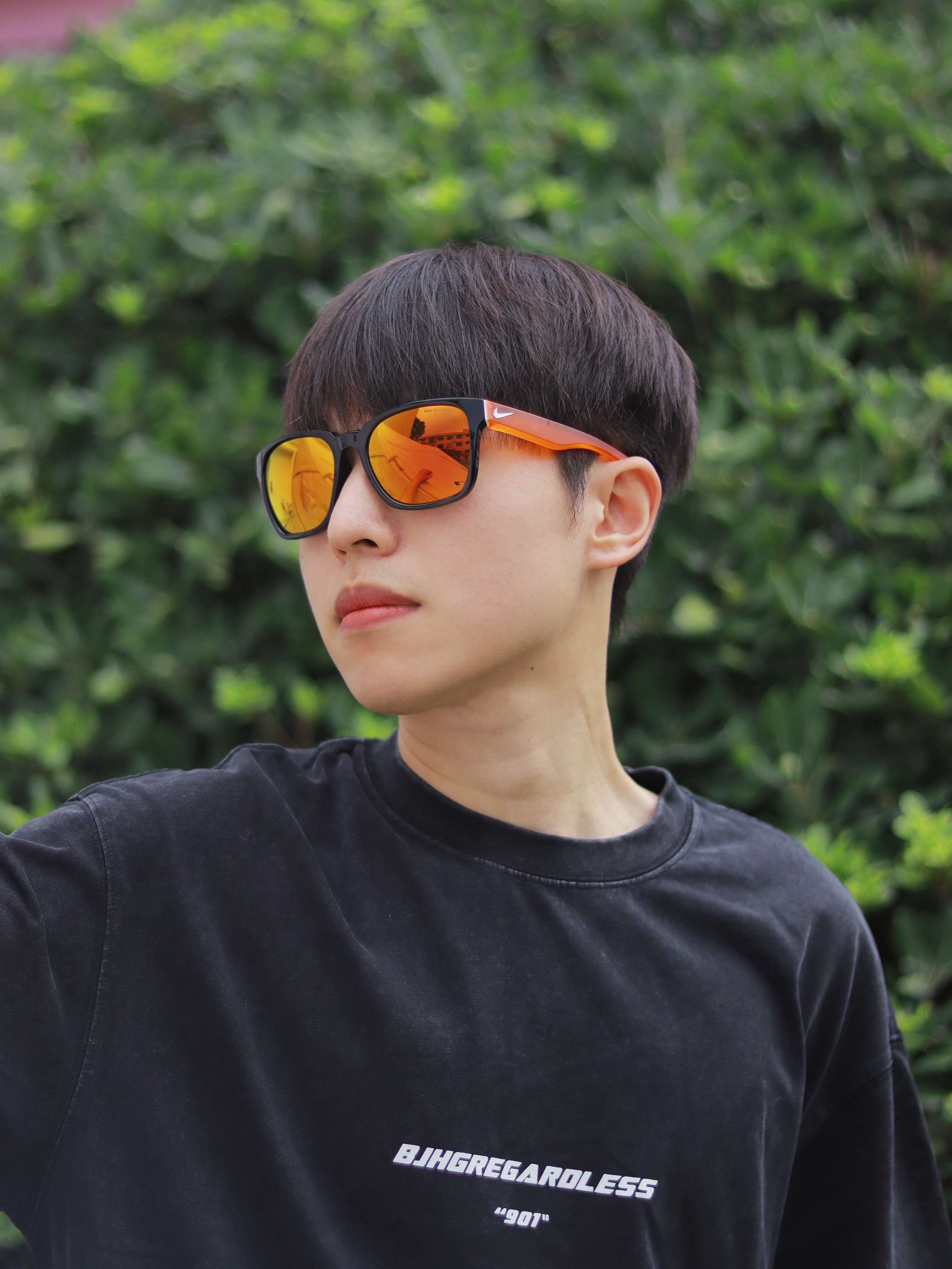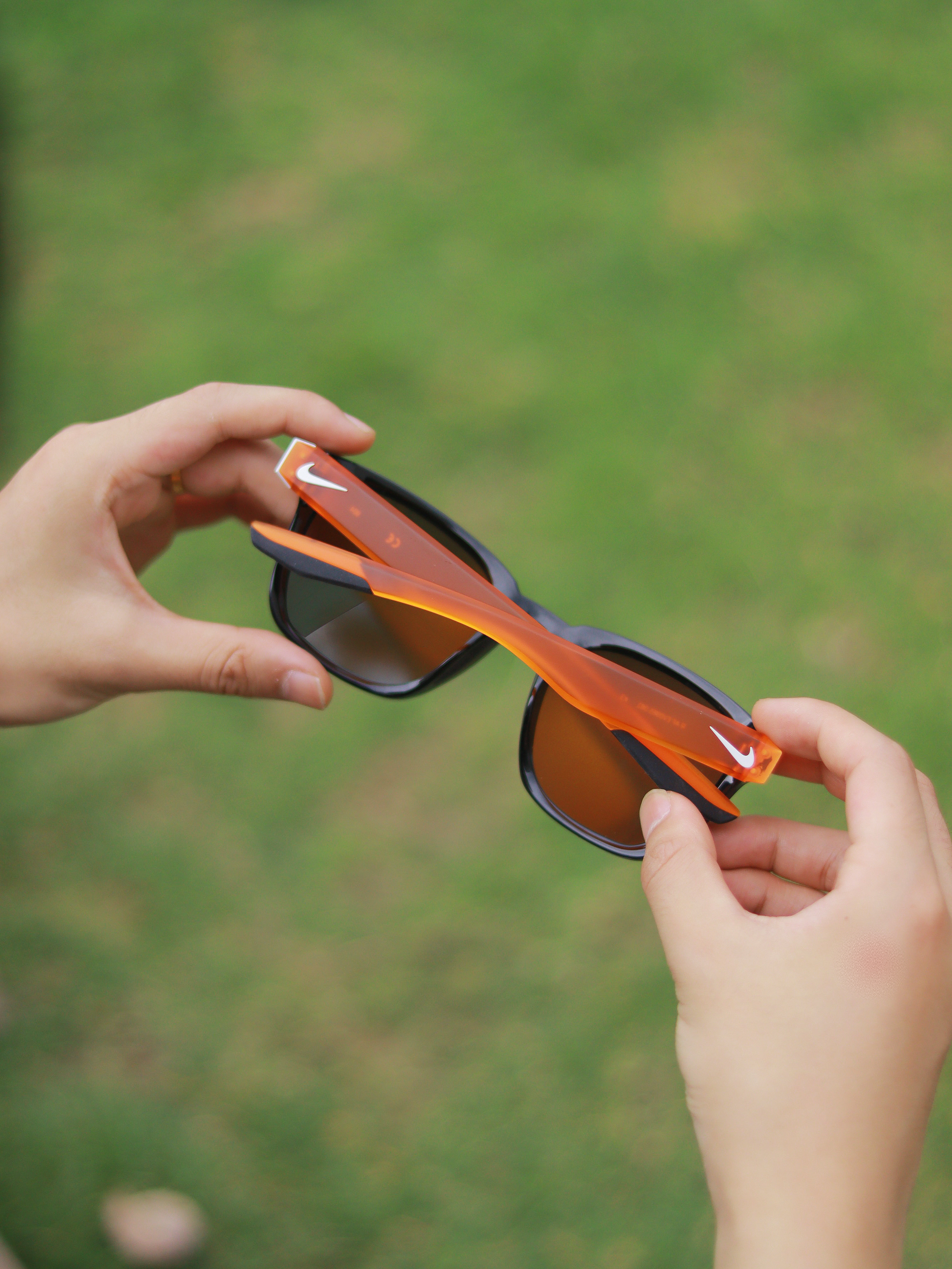 夏天天气好的时候,我喜欢约上朋友一起户外徒步或者露营,好好享受一下夏日的阳光。 - 一般户外活动,配饰我都会首选墨镜! 像今天的穿搭就比较学院休闲风格点,搭配的是nike的新款墨镜哦。 - 整个小方框的镜框设计挺有潮流感的,而且它的橙黄撞黑的配色比较创意个性,日常搭配的话基本不用担心会撞色,高级感超足的。 - 镜片采用的是蔡司镜片,品质很高,日常户外出行or骑行防晒都能搭配起来哦。