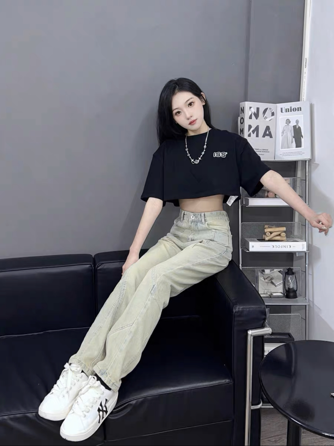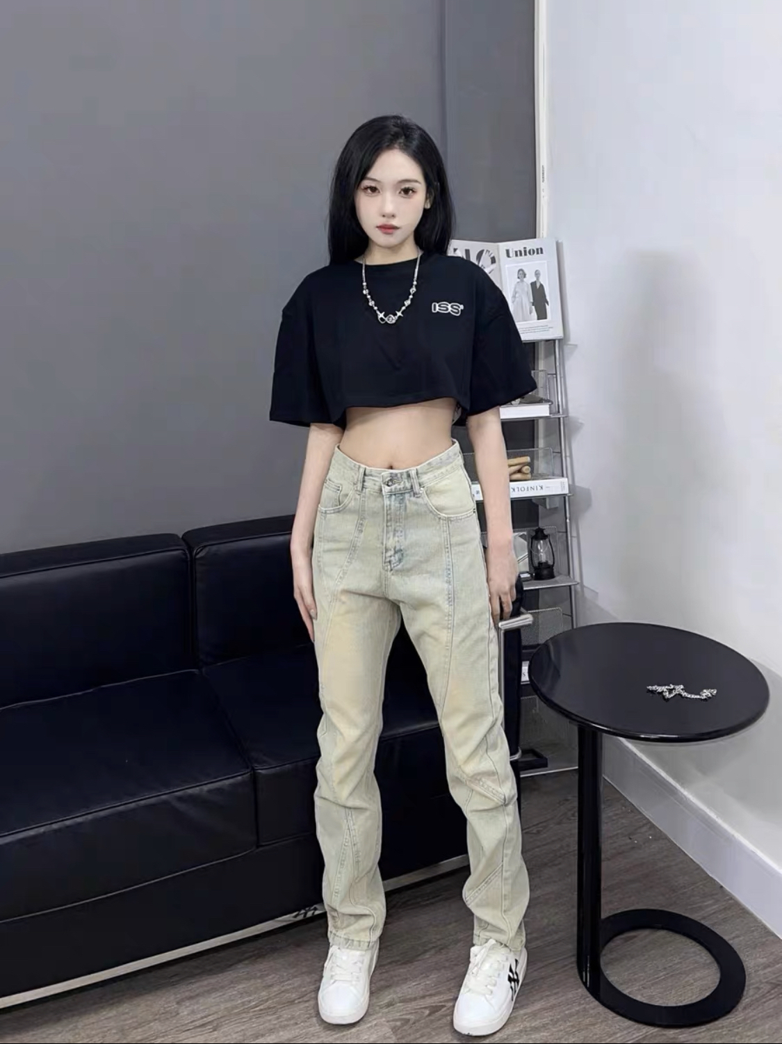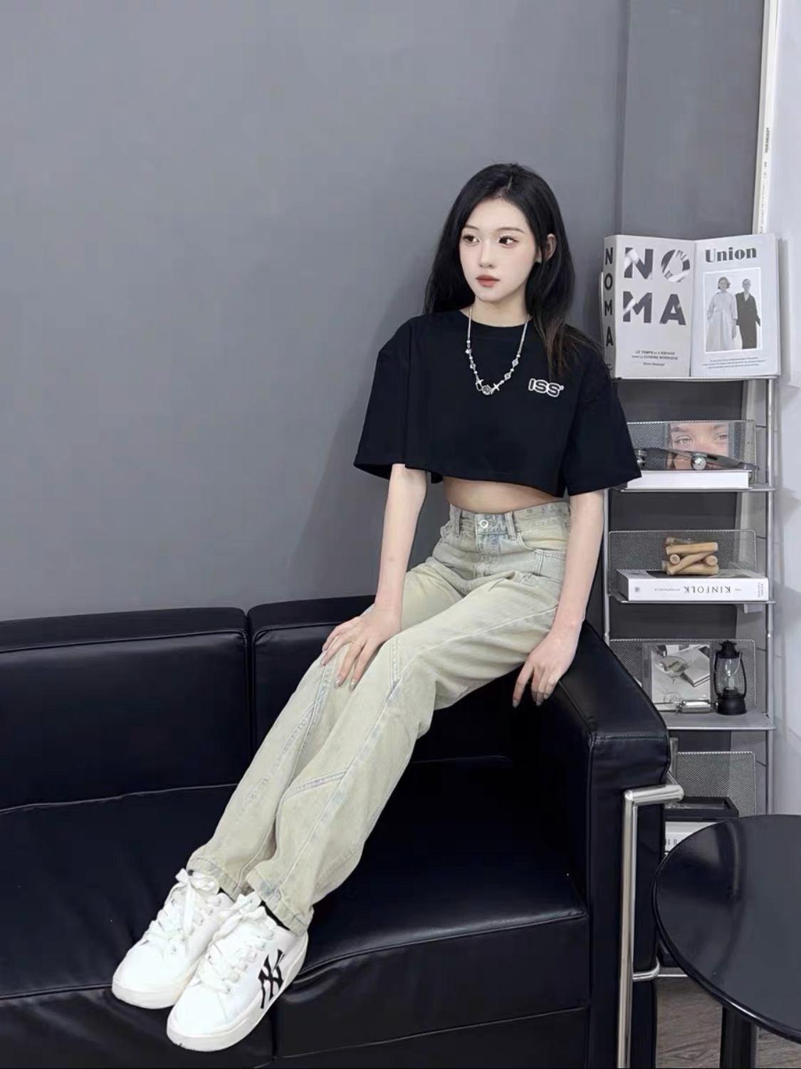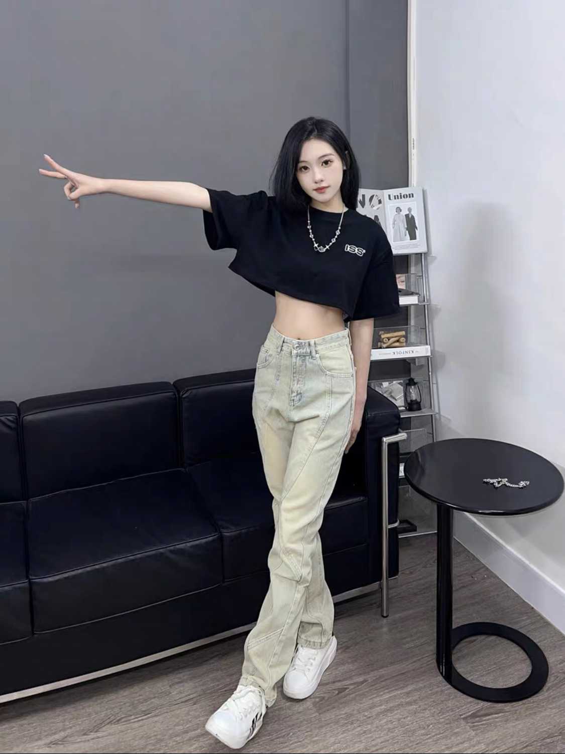 美式黄泥染修身牛仔裤,宽松直筒的版型上身显高显瘦,修饰腿型,现在的天气穿也不会热,棉含量足够高,透气性也有保障,这种版型的裤子真的可以说是谁穿谁好看,百搭不挑人~ 搭配一件黑色T恤,扎起来露出小蛮腰,一整个帅住啦~ (图片来自网络,侵删)