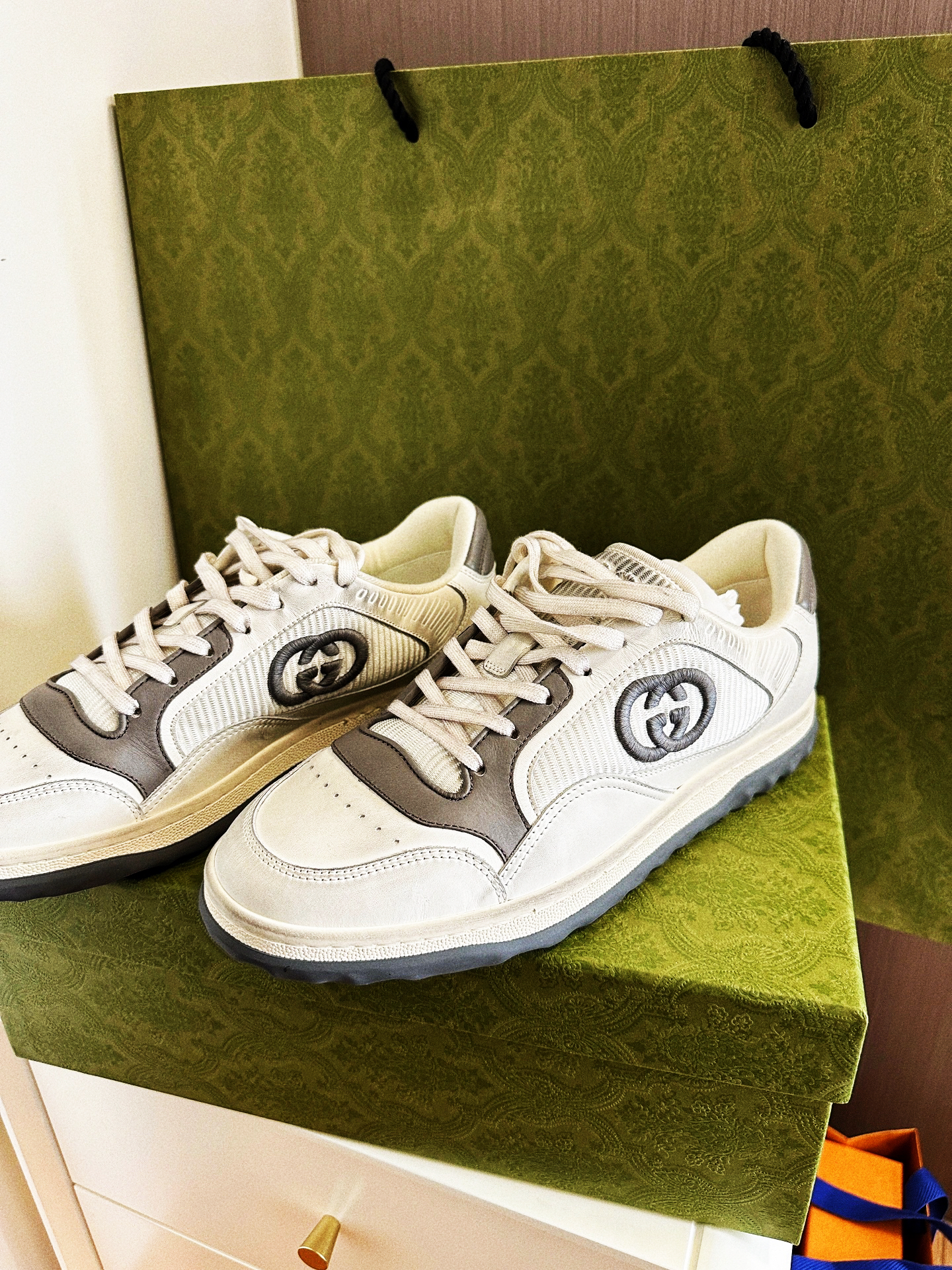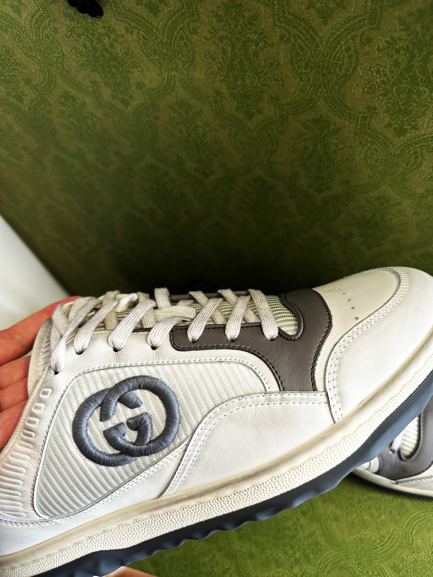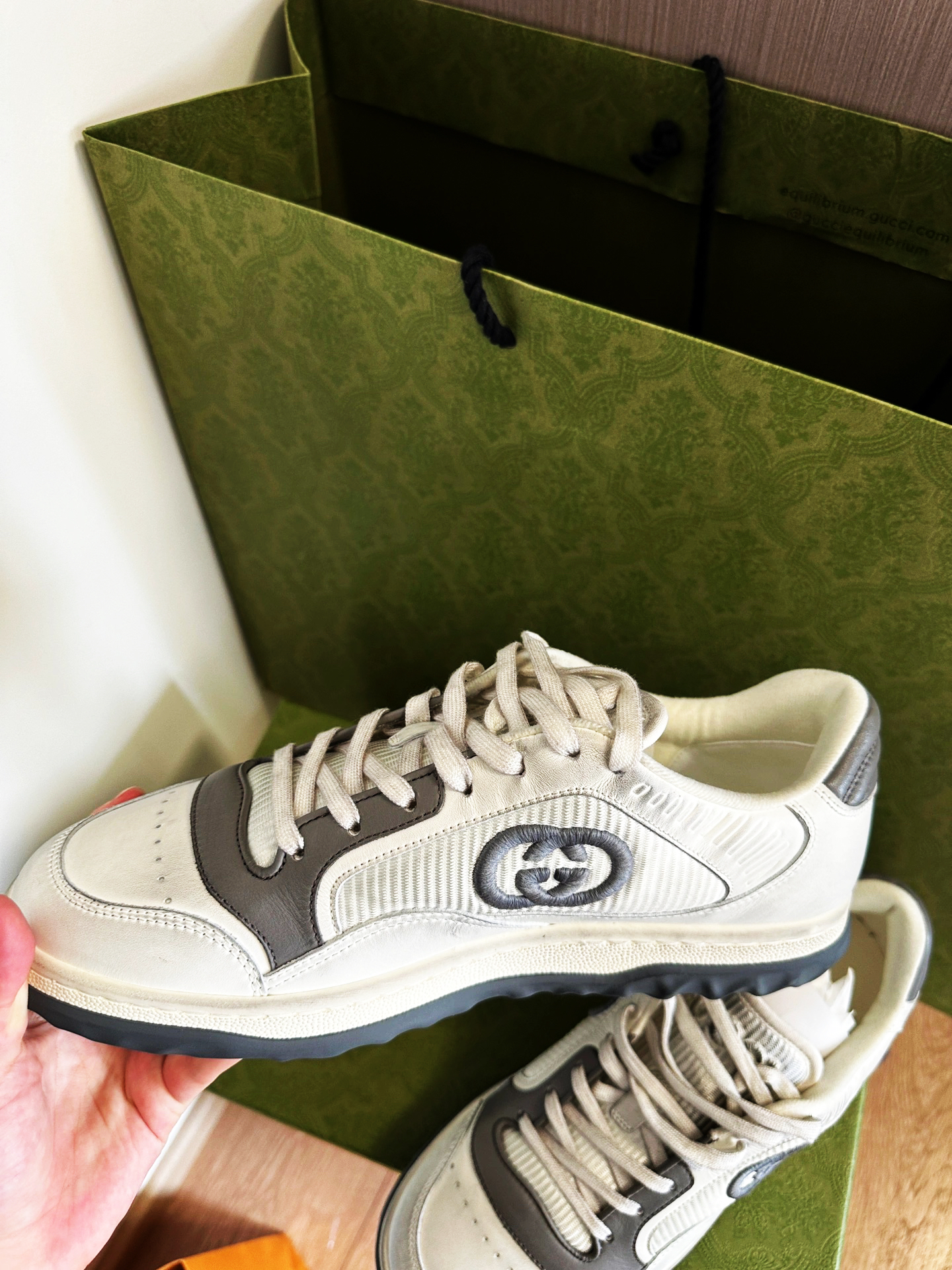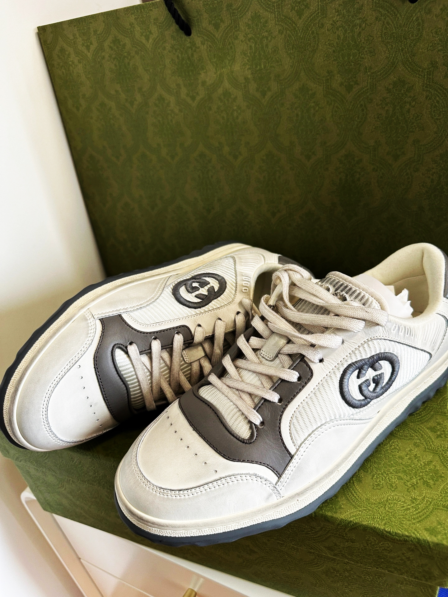 2023最新款,鞋型很好看!老公喜欢黑白配色,但我觉得灰色更洋气,刚好灰色有他的码数,黑色没有,一切都是最好的安排~hhh — 这款颜色有很多,做旧款,很百搭。上脚的包裹感没有经典款脏脏鞋那么紧。脚感很柔软,柜哥都说是全Gucci最舒服的鞋子 — 还没想好送男友什么礼物的小仙女快冲吧!