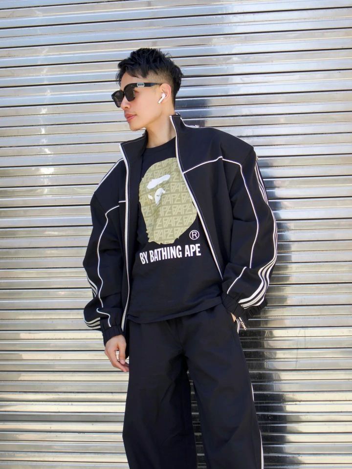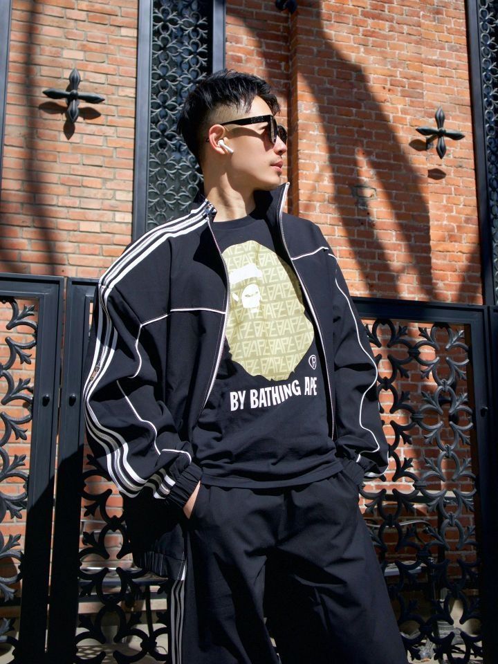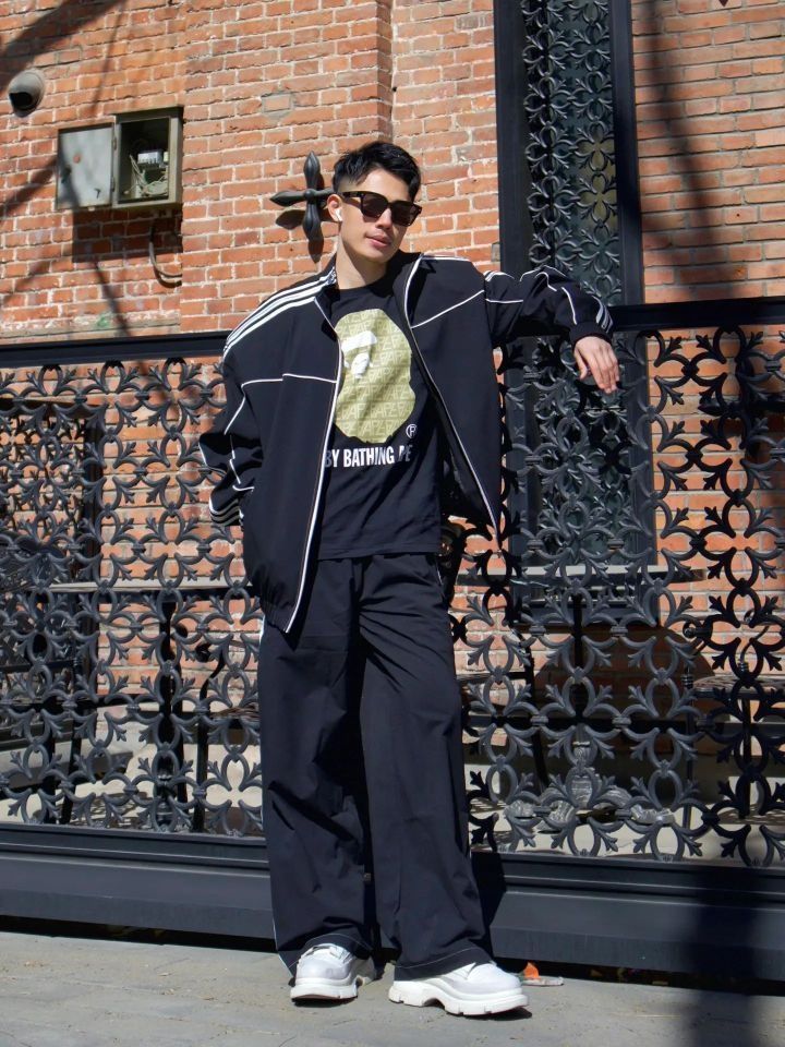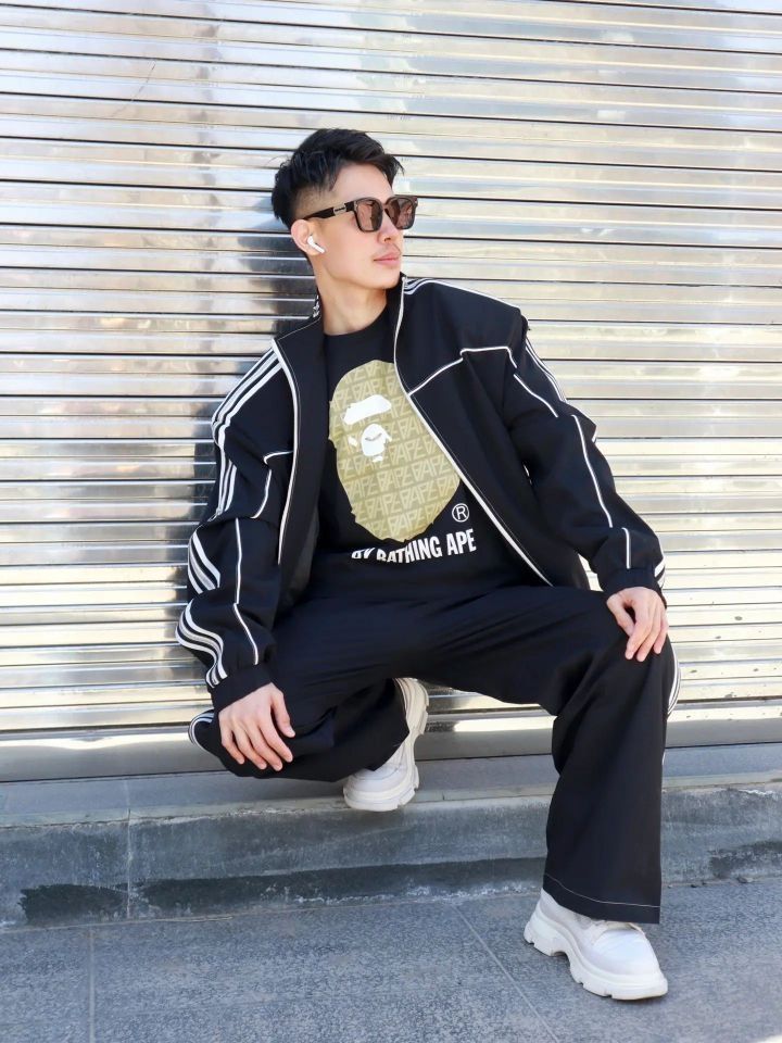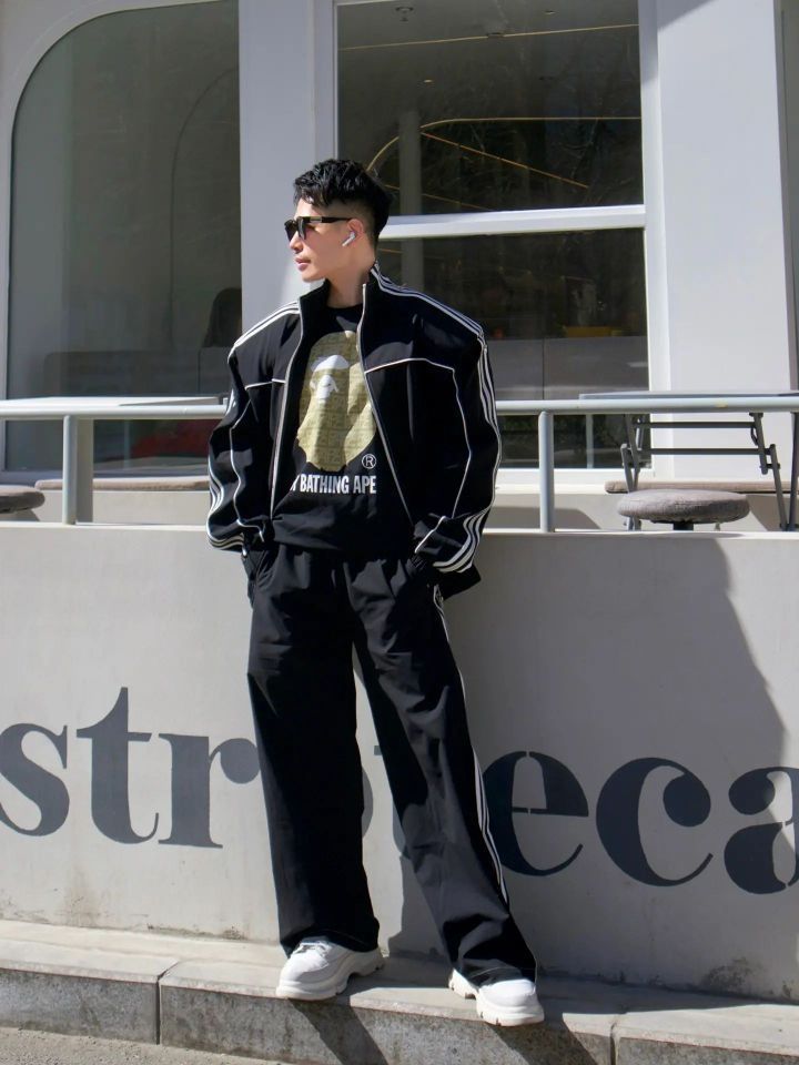都市时髦复古运动风穿搭新风格 就是要配色简约 版型宽松 再加点潮流元素 以黑色为主色调 在此基础上进行添砖加瓦 内搭一件黑色印花元素T恤 上身一套条纹点缀宽松运动服 上脚一双白色靴子 墨镜一戴,潮酷有型 男生复古运动感➕青春时髦少年感直接拉满