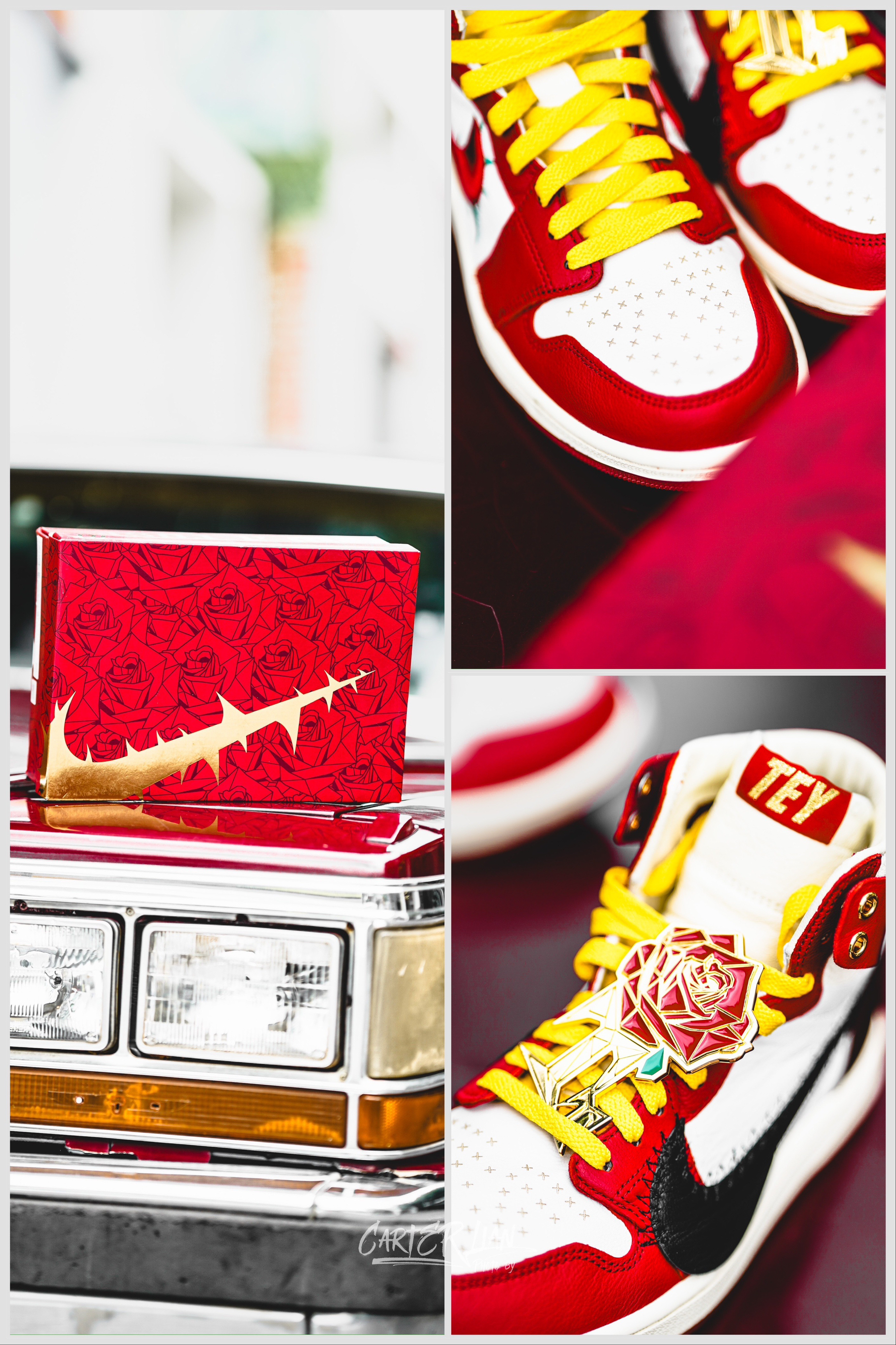 球鞋灵感📖 鞋款以Teyana2018年的热门单曲“Rosein Harlem”为灵感进行设计,拿到实物后从内到外可以说是细节满满。 整体细节👀 鞋盒上满印的玫瑰花🌹图案再加上上金色的带刺Swoosh真的非常有个性的鞋盒,鞋身则是黑白红配色,让人很容易联想到经典的芝加哥配色,材质上全皮革面料包裹,鞋头的透气孔也用金色十字图案代替,质感上也很出色。 Swoosh的部分则是鸳鸯设计,左脚采用缝线的解...