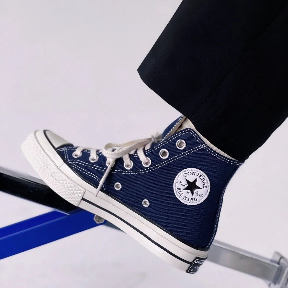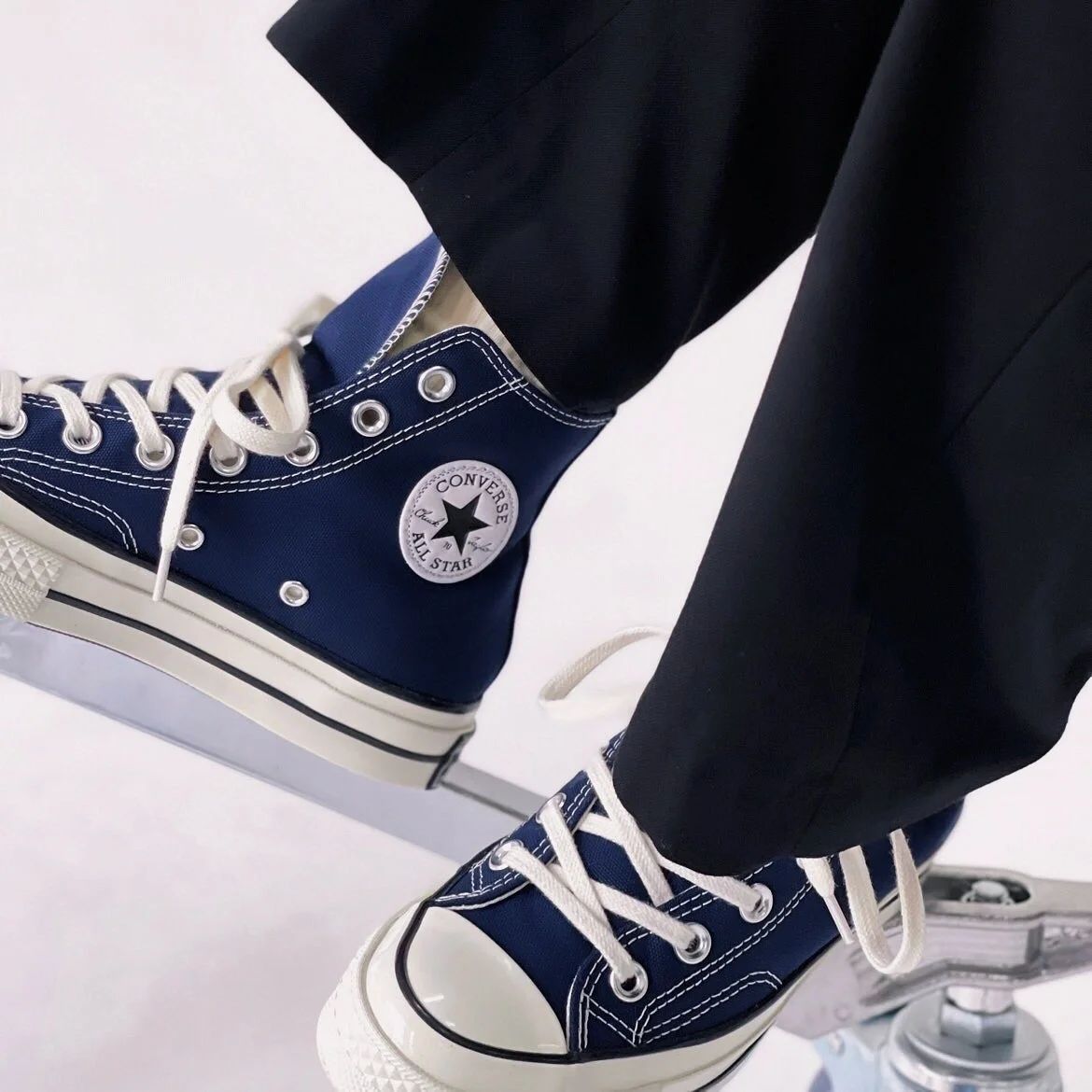 “蓝”以自拔的匡威💙💙 匡威帆布鞋可以说在各个年龄段都是经典✨,在我高中的时候匡威基本人手一双,无论是搭配校服还是日常穿都很合适👍,1970 S的鞋底会比较厚一点,穿上不脚,也比较有型🌸。海军蓝比较显白,而且也很百搭衣服,让平平无奇的搭配多一些亮点🍃。高帮设计能够完美的衬托出腿部线条💕,,非常的显腿长🦵
