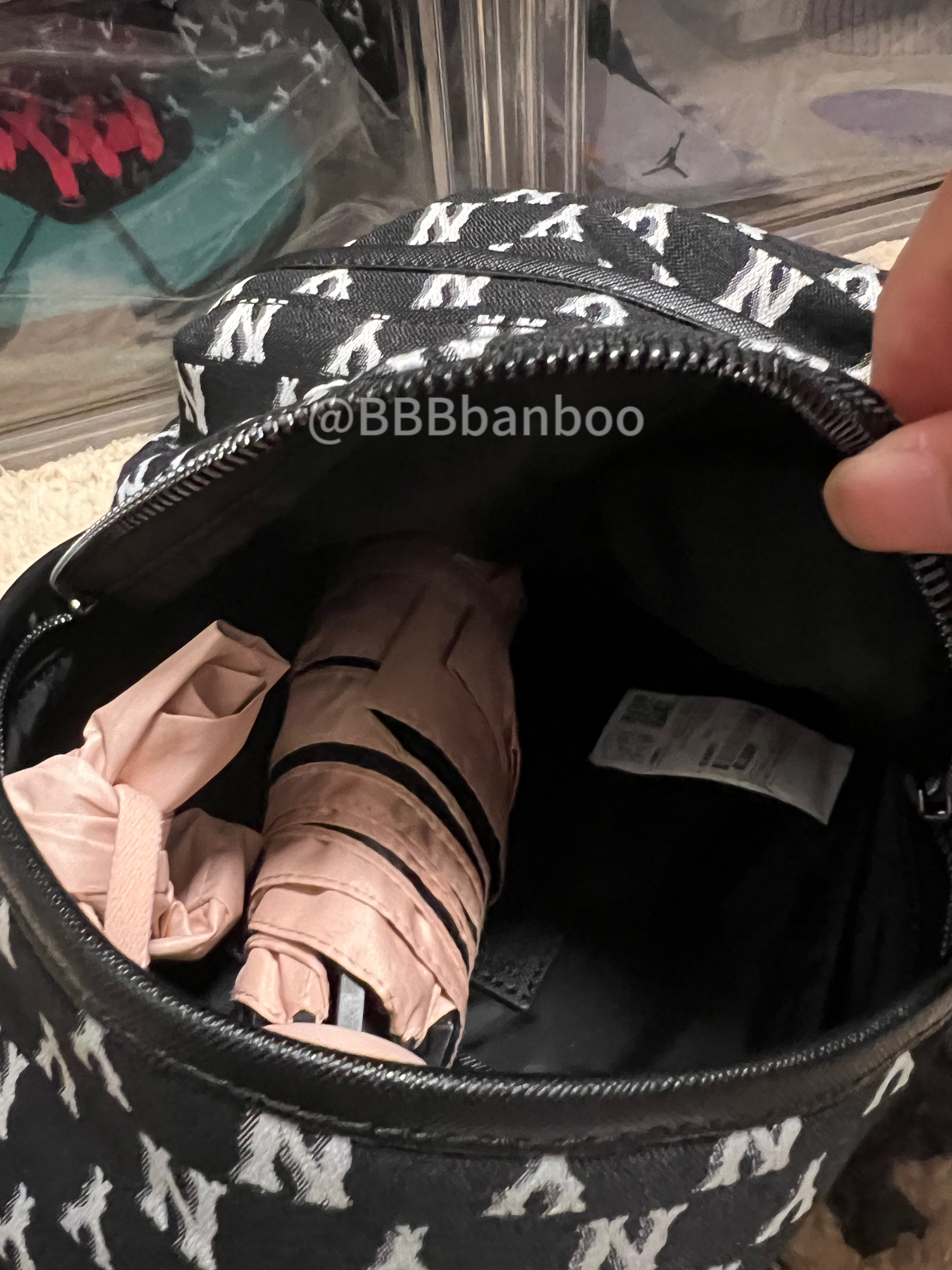 MLB小双肩包🎒真挺迷你的,一开始还以为是正常书包大小! 外观上: 满印logo颜值挺高的,也具备辨识度,我买的黑色配色也挺耐脏的!通勤用很nice! 正面的刺绣很细腻,细节做得不错。外层还有一个小隔层,可以拿来放钥匙小充电宝等。 背面背带都是挂扣式的,切换也比较方便。 实用性: 首先说说容量上,可以看到整个包的大小跟小说差不多大,预计高数是能放下的。 另外饱饱可以无压力放下小型折叠伞一个1000...