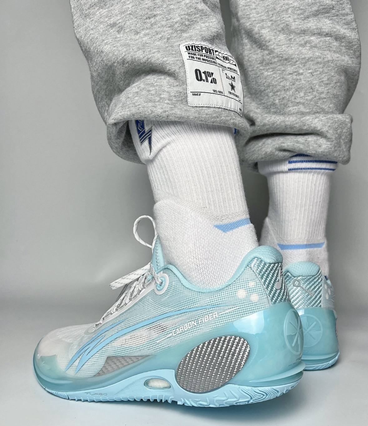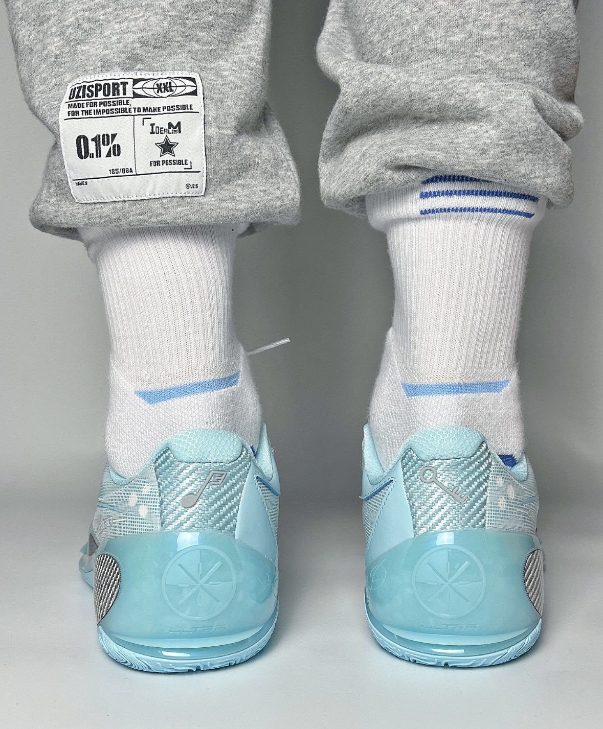 这双韦德之道808三代UItra版本颜值真的绝了,鞋身使用了大面积的碳纤维纹路,不论是哪个角度看上去都超帅! 中底依旧是可拆卸的全掌疆鞋垫,下面有一层 tpu片来提升抗扭,鞋底也可以看到一块类似碳 纤维纹路的抗扭片,不过个人触摸下来应该是普 通的tpu片。