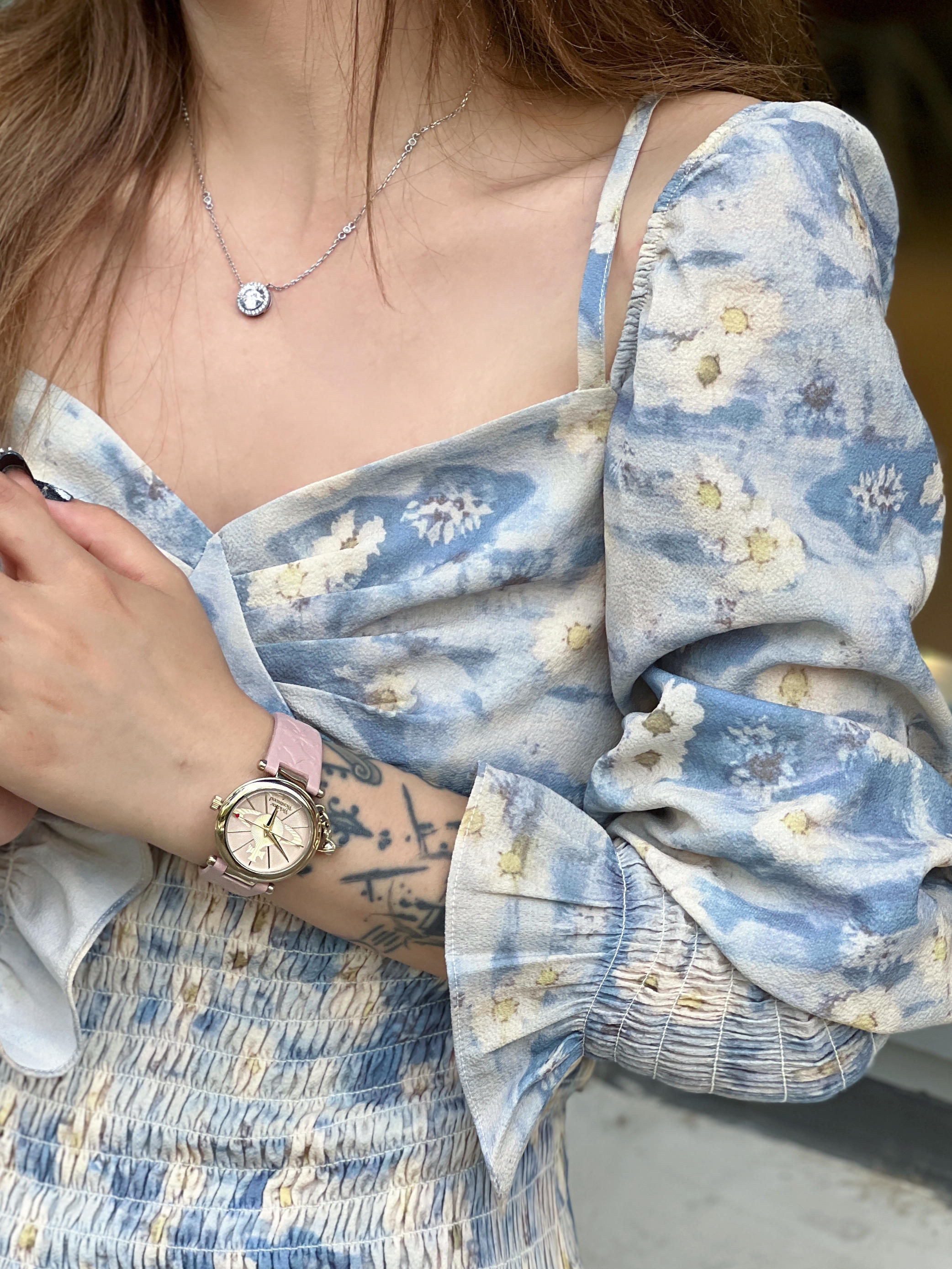 嗨嗨 bb们~ 快乐的暑假开始啦! 入夏必备单品 连衣裙➕精致的配饰 今天的look 很适合暑假约会呢~ 碎花连身裙 搭配低帮球鞋👟 超显腿长 优雅又甜美,配饰真的很重要,选对了就加分满满🈵️ 今天的手表⌚️超级精致 粉色皮带➕粉色土星🪐压纹表盘,搭配土星镂空小吊坠,优雅气质中流露了一丝朋克叛逆,是我喜欢的 甜酷调调~ 整个夏天 做精致的女孩 配饰一定要精心挑选哦~