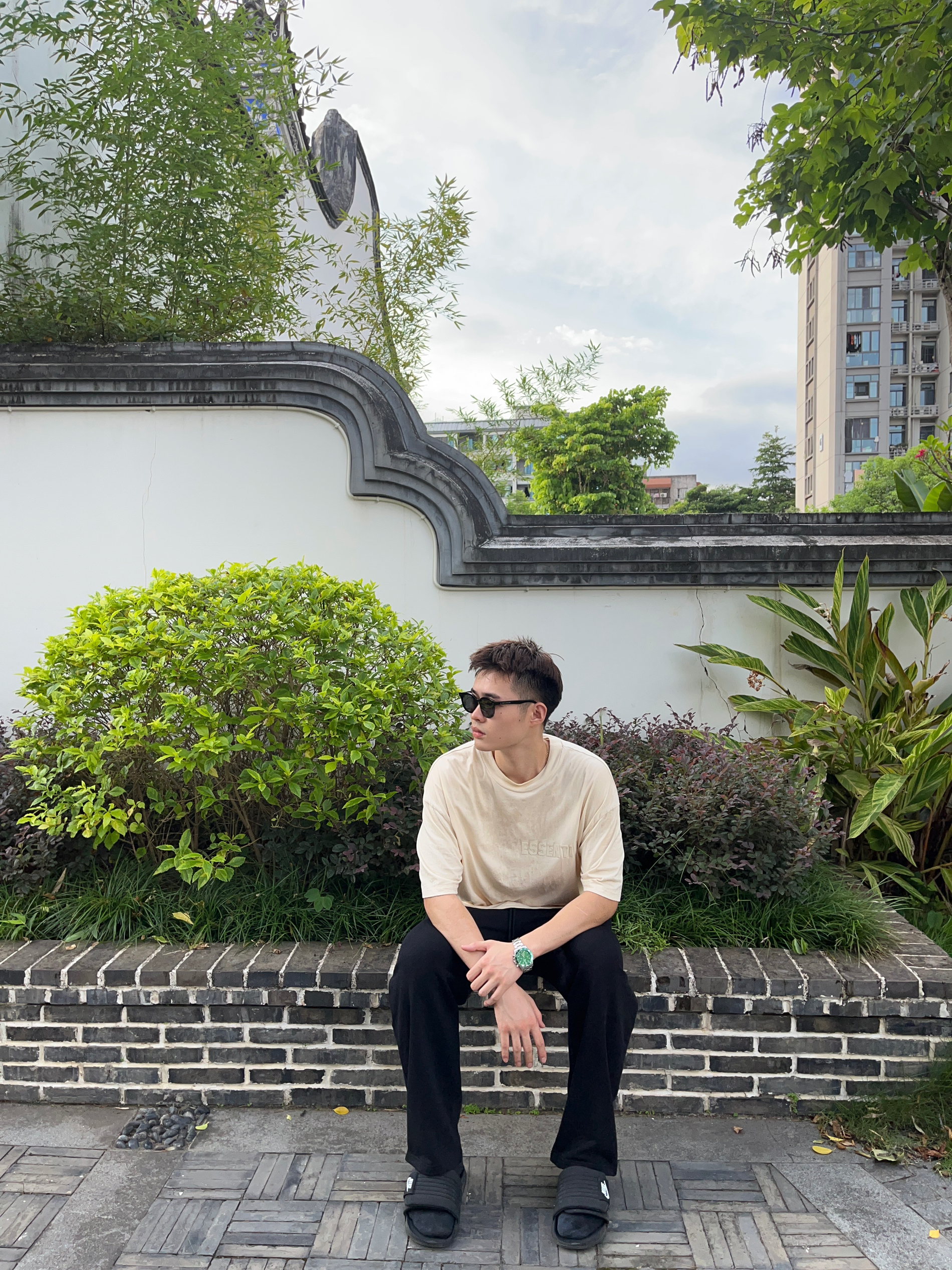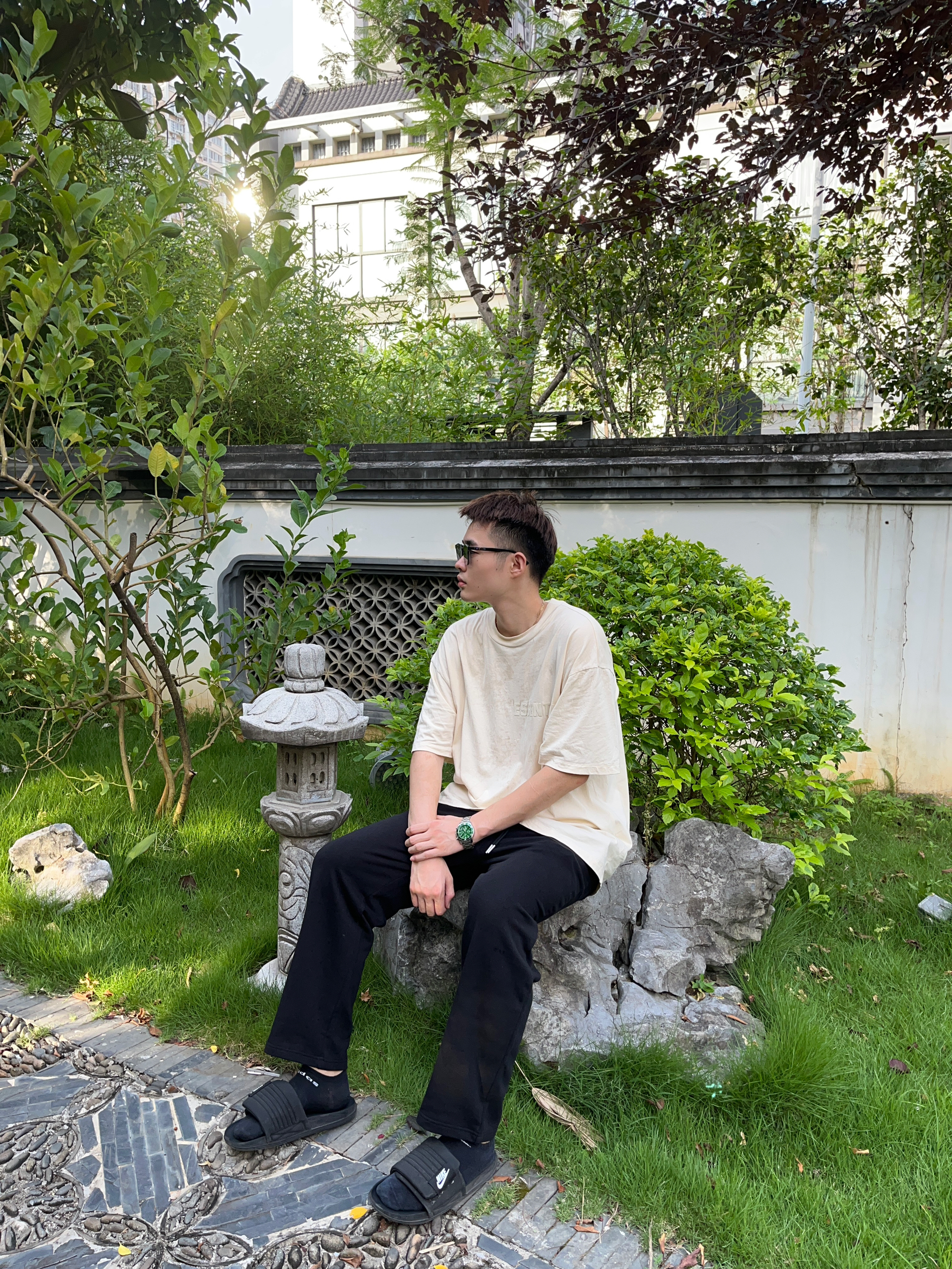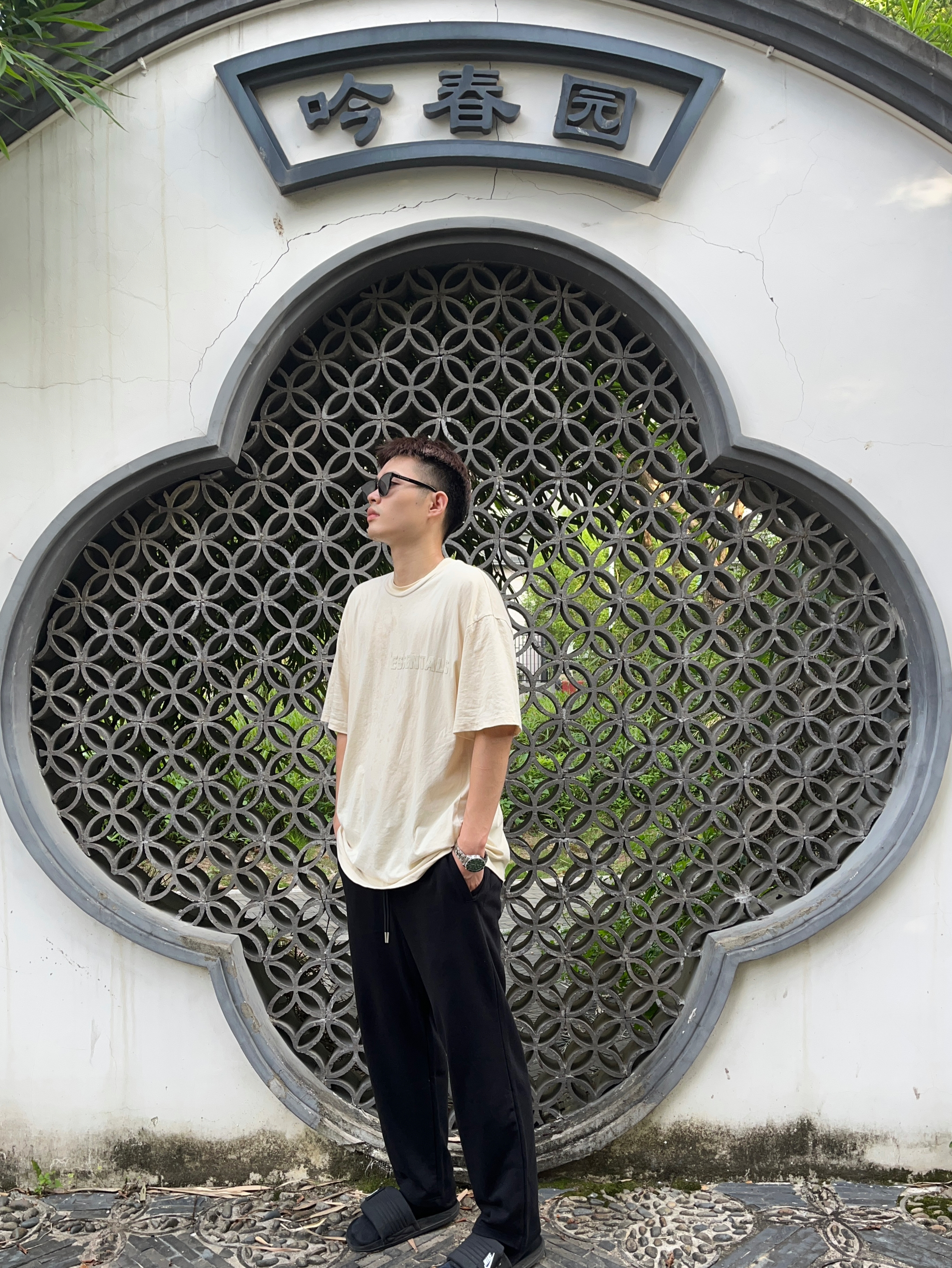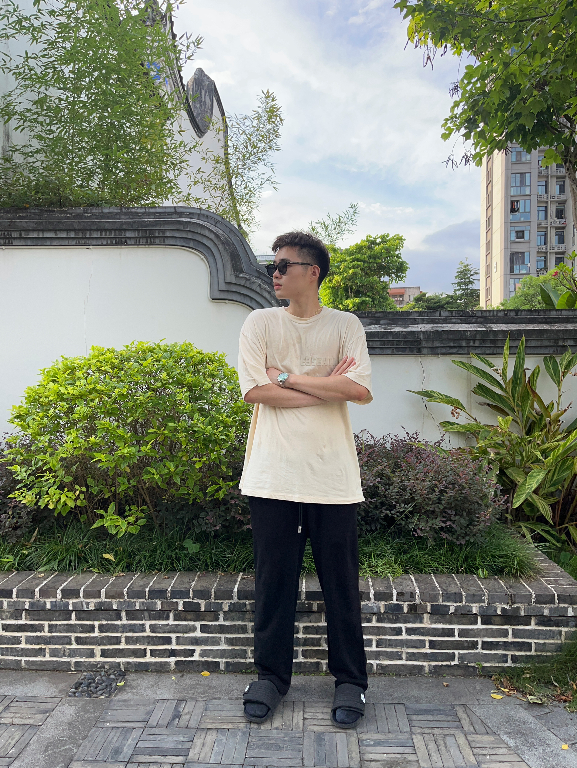 🍃趁着还没有开学速速出门旅游🍃 👔Essentials 2023S夏季的米色胸口植绒Logo短袖,OverSize的版型,简易尺码的选择上可以偏小一码哦~ 👖Dangerouspeople DSP 薛之谦主理的直筒抽绳长裤,宽松的版型➕透气的材质,当然黑色也是比较显瘦的配色啦!我是185CM82kg选择的XL的尺码~ 👟Nike sport Slide 平底魔术贴拖鞋,黑武士的配色也是简约百...