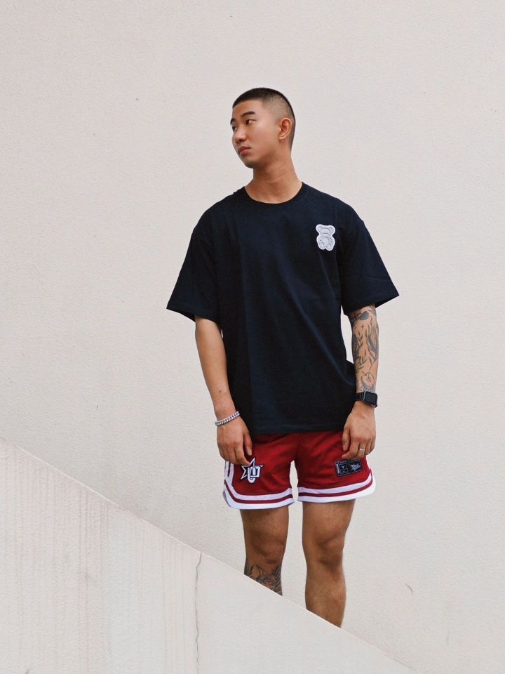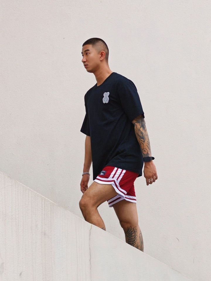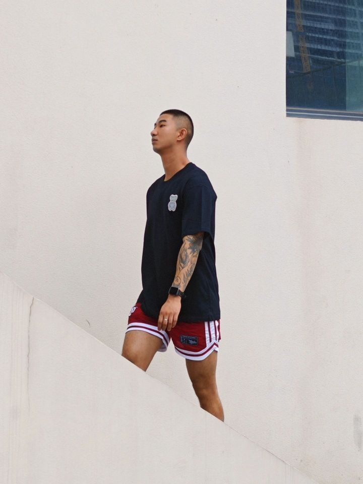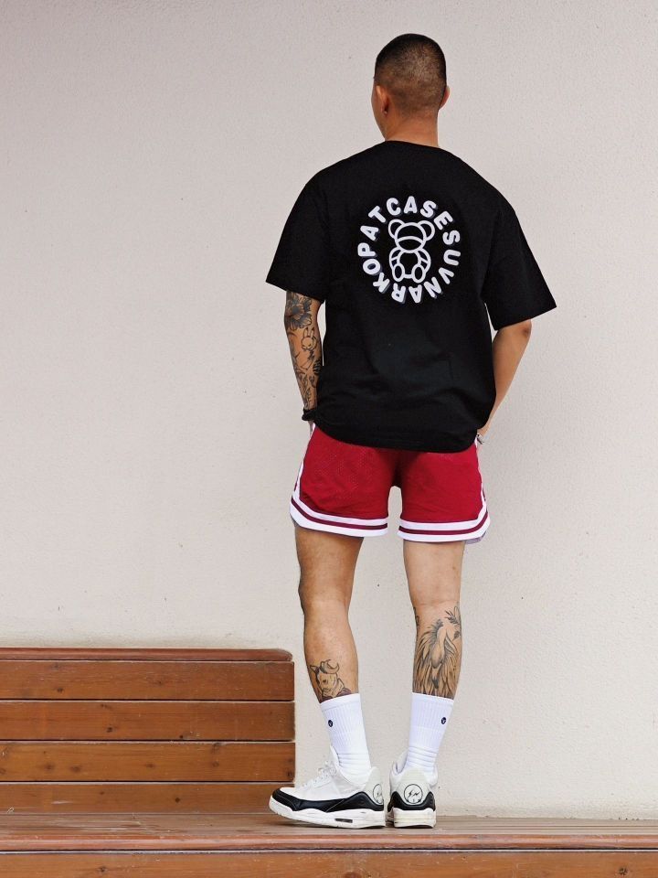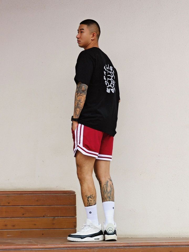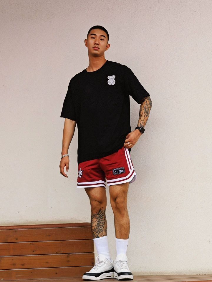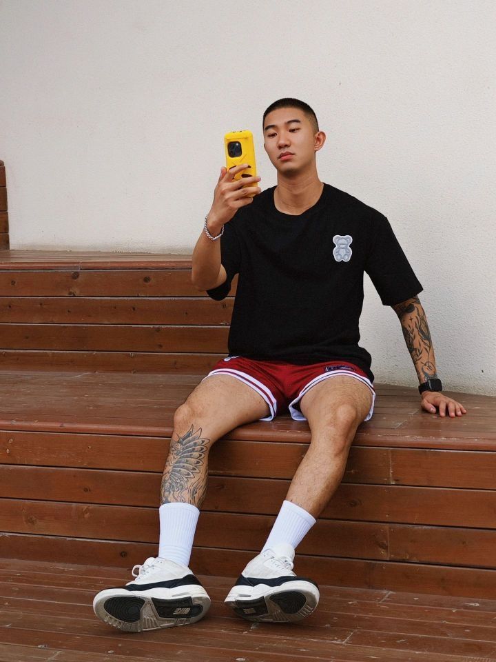 夏天美式复古穿搭应该是 像我这种个子稍微高点有点肉的男生 最爱的穿搭风格 印花做旧日的高克重黑色t搭配复古四分球裤 上身是真的帅 特别适合黄黑皮 纯纯的斩男穿搭 我180cm75kg穿xl 👔:suecx 🩳:维动