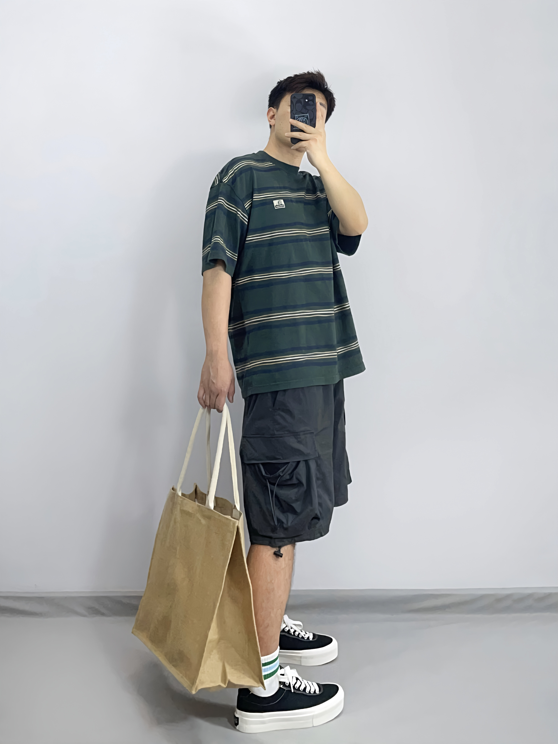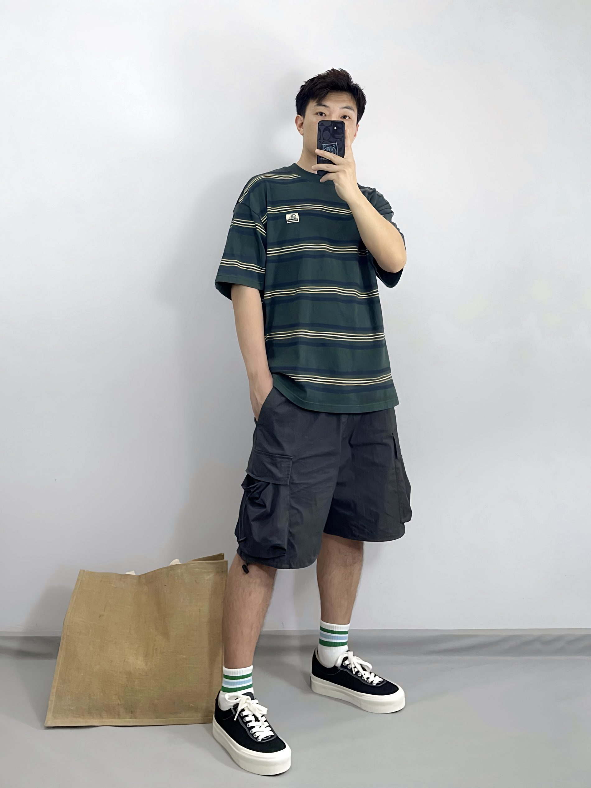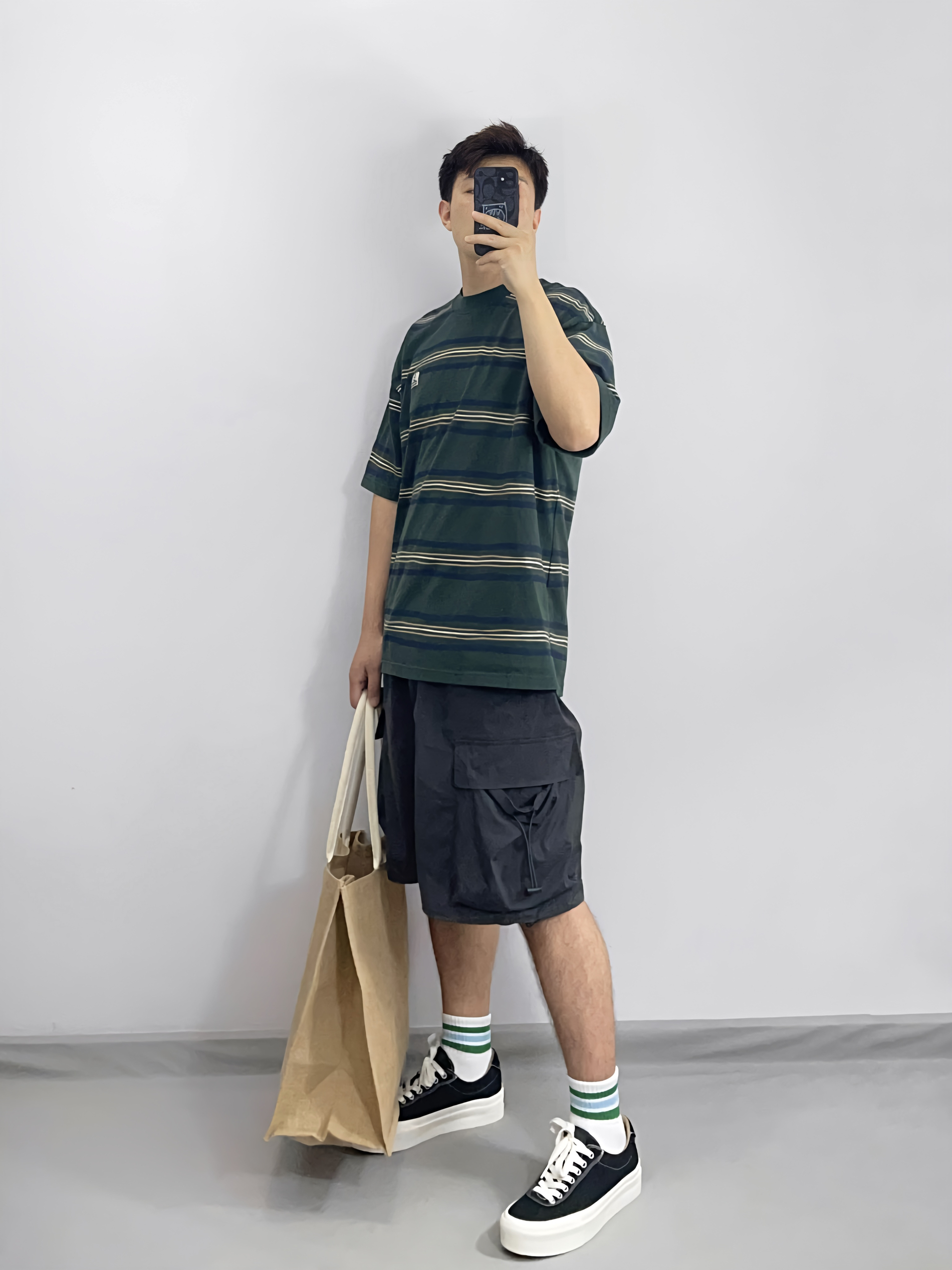 日系条纹短袖搭配工装短裤 给人一种休闲轻松自在感觉 同为宽松版型穿着体验更佳 - 170cm/67kg 分享男生的日常穿搭OOTD -
