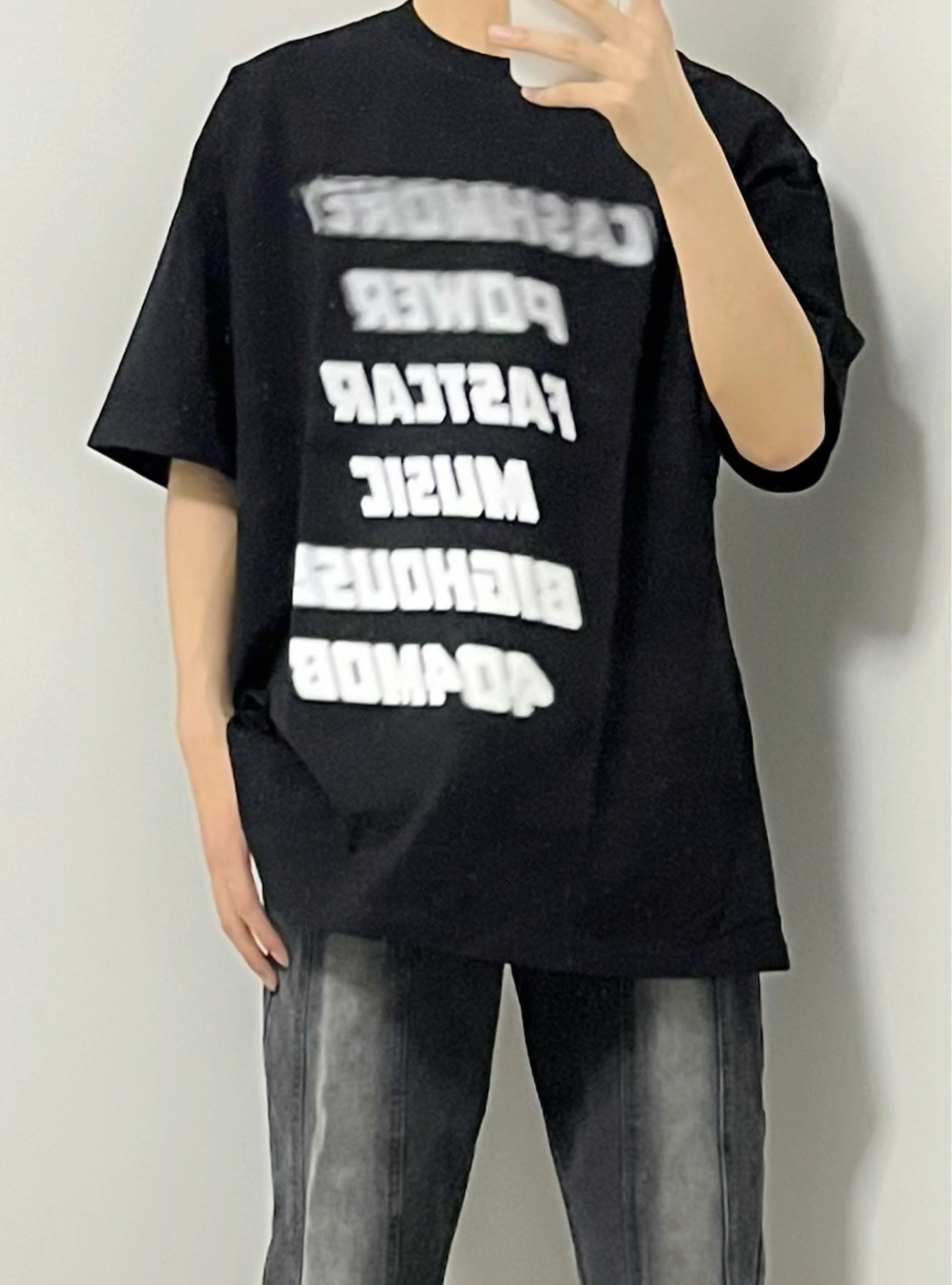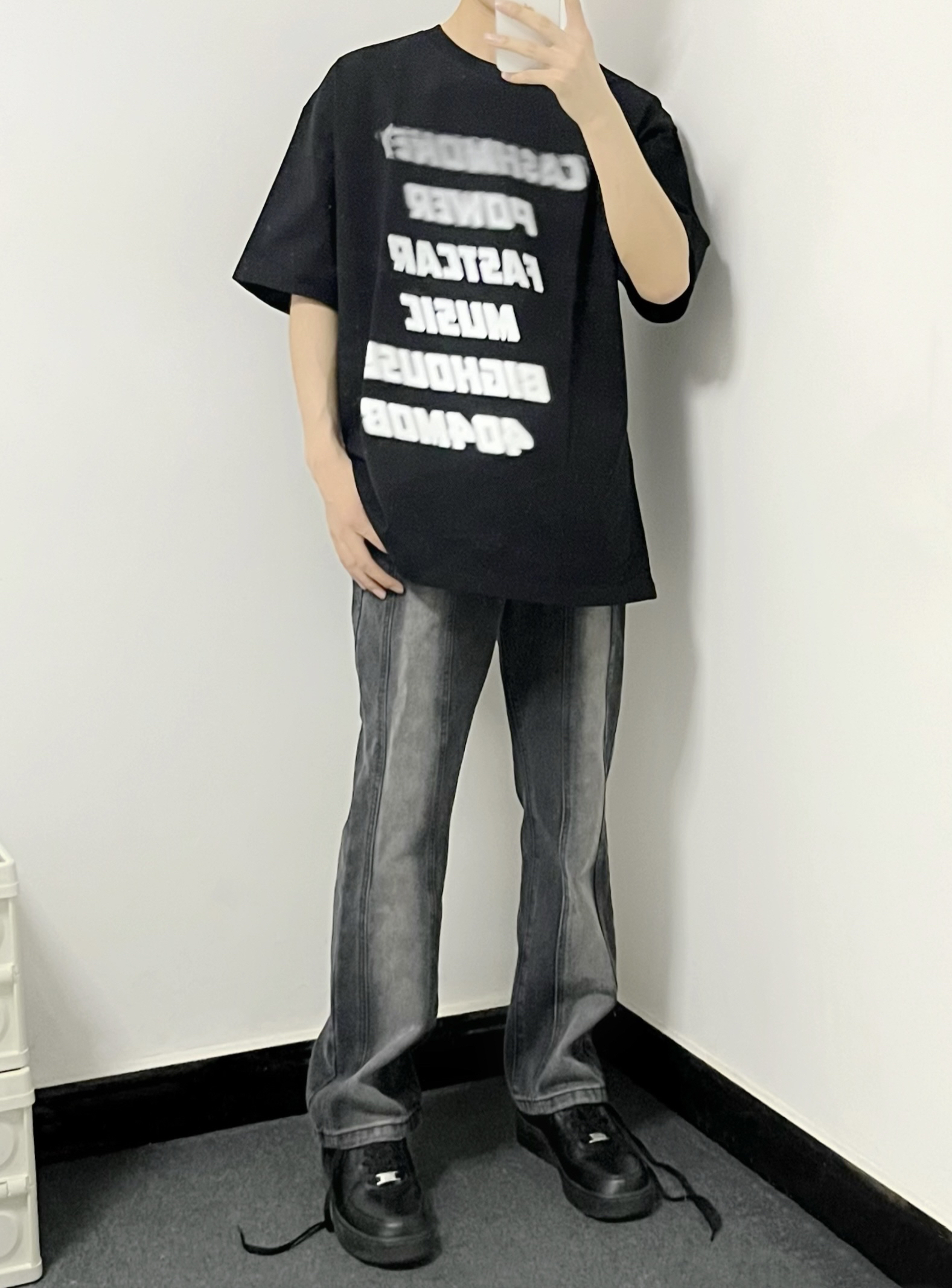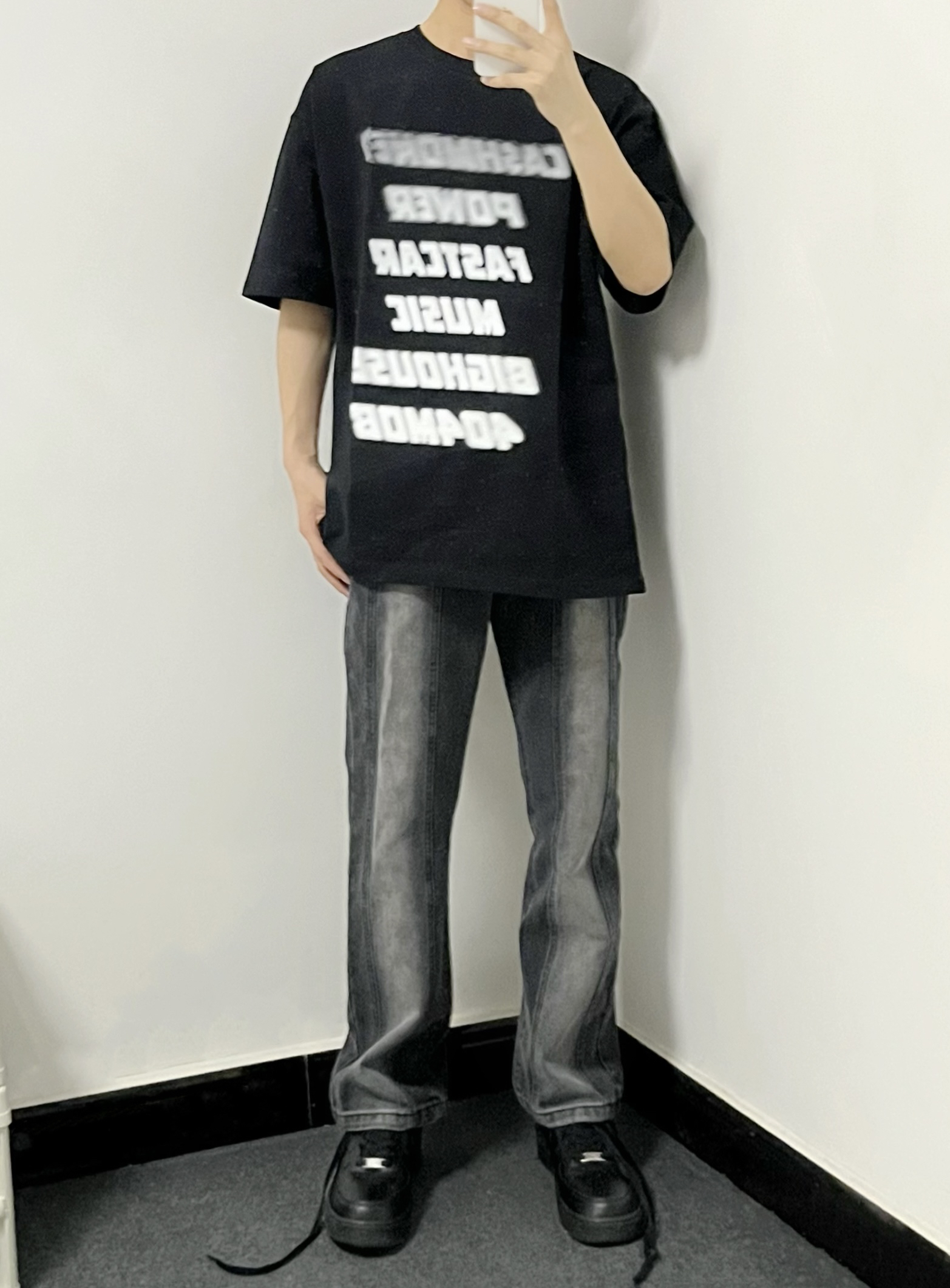 叮叮叮🔔今日穿搭分享来咯~ 📸 这个短袖长得实在是不要太好看❕ 黑色加上渐变白色确实很酷~ 重磅的面料也不容易变形🫠 📸 黑色的渐变短袖搭配烟灰色牛仔裤🎱 牛仔裤的版型很棒👍 这一身妥妥的谁穿谁帅👓 👔:黑色渐变短袖 👖:烟灰色牛仔裤 👟:纯黑色空军