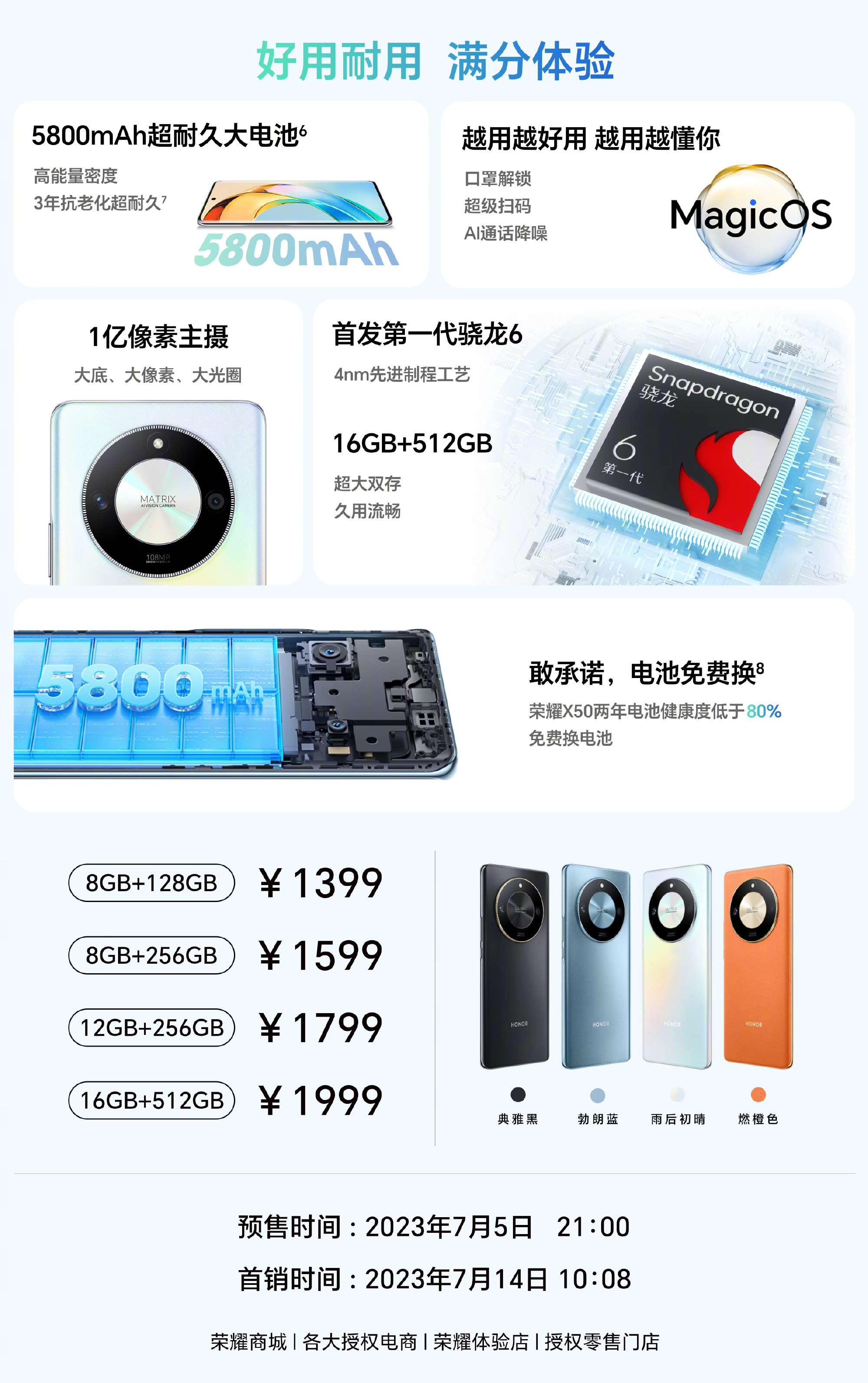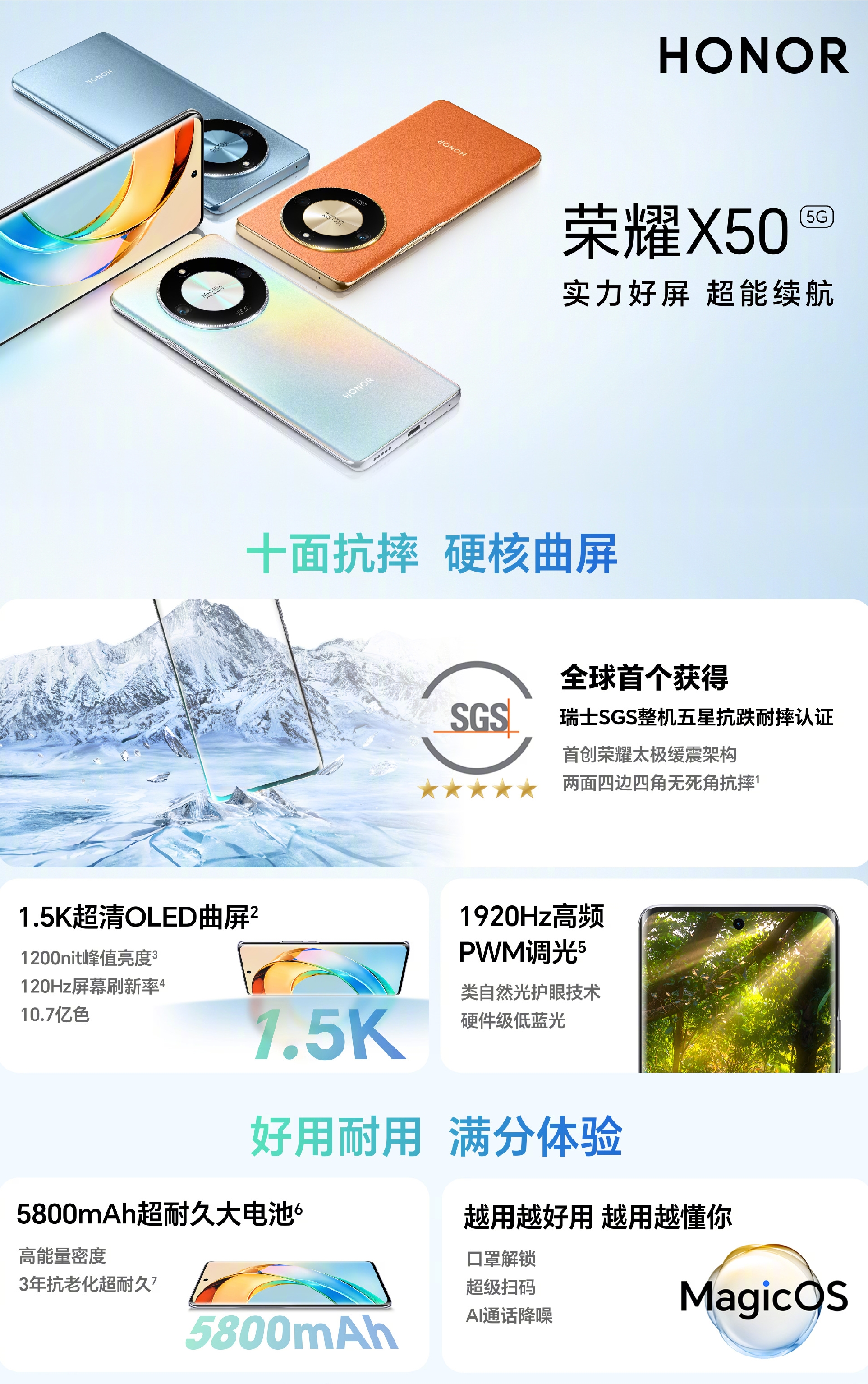 荣耀X50 价格: 8GB+128GB 1399 元 8GB+256GB 1599 元 12GB+256GB 1799 元 16GB+512GB 1999 元 荣耀X50 成为全球首个获得瑞士SGS整机五星抗跌耐摔认证机型,通过工艺与材料的双重创新,实现两面四边四角,十面无死角的抗摔新高度。荣耀X50 带来档位首款1.5K曲屏,搭配高频 PWM 调光技术,且具备1200nit峰值亮度,10.7亿...