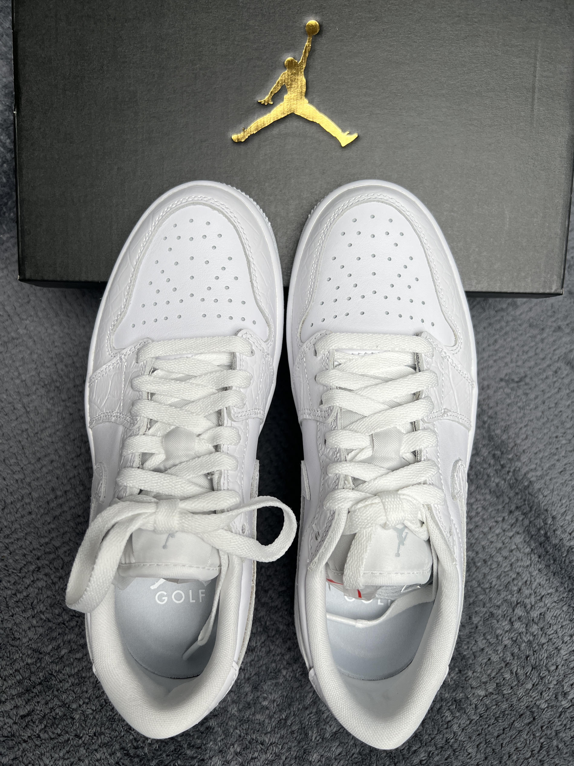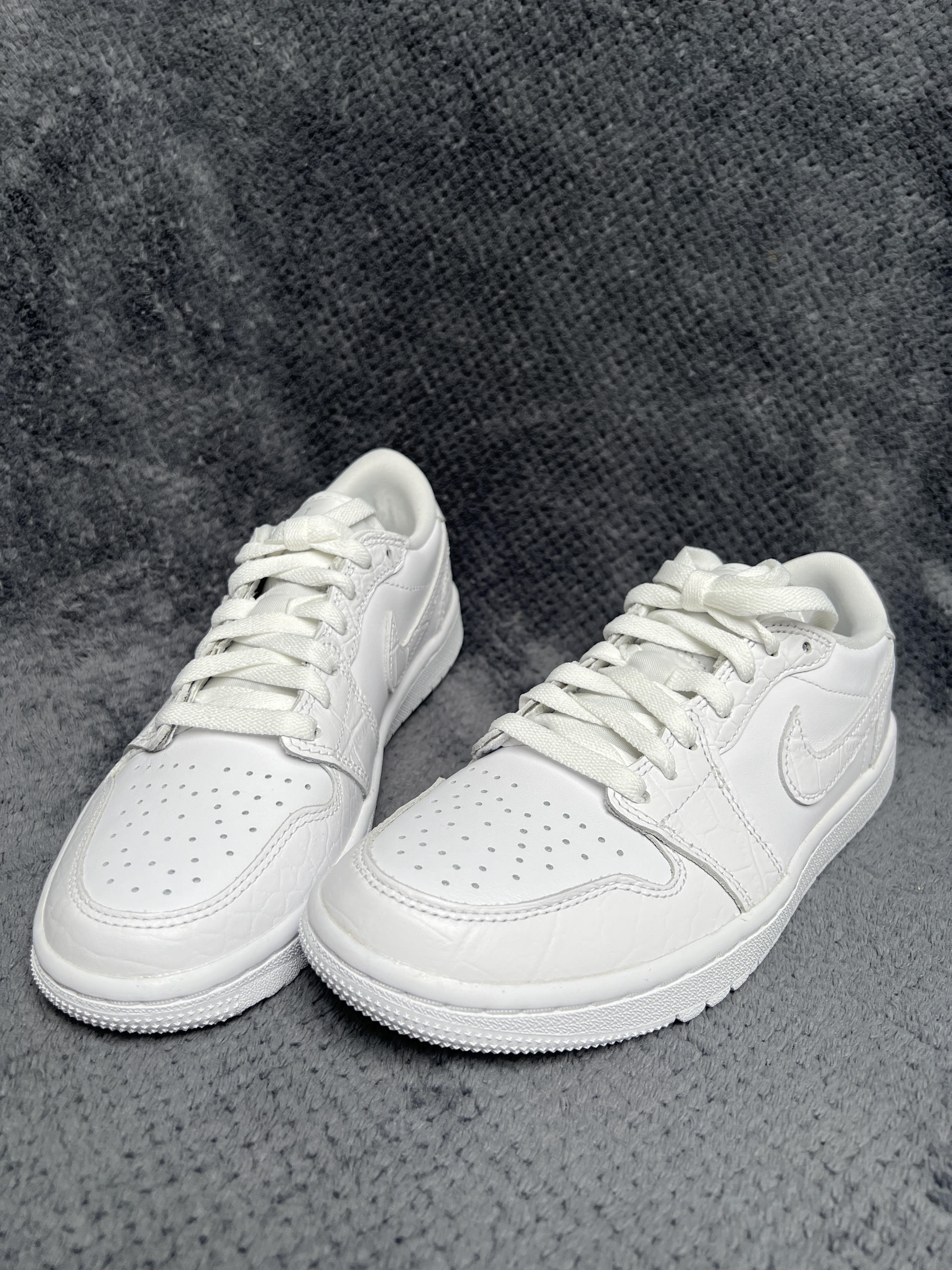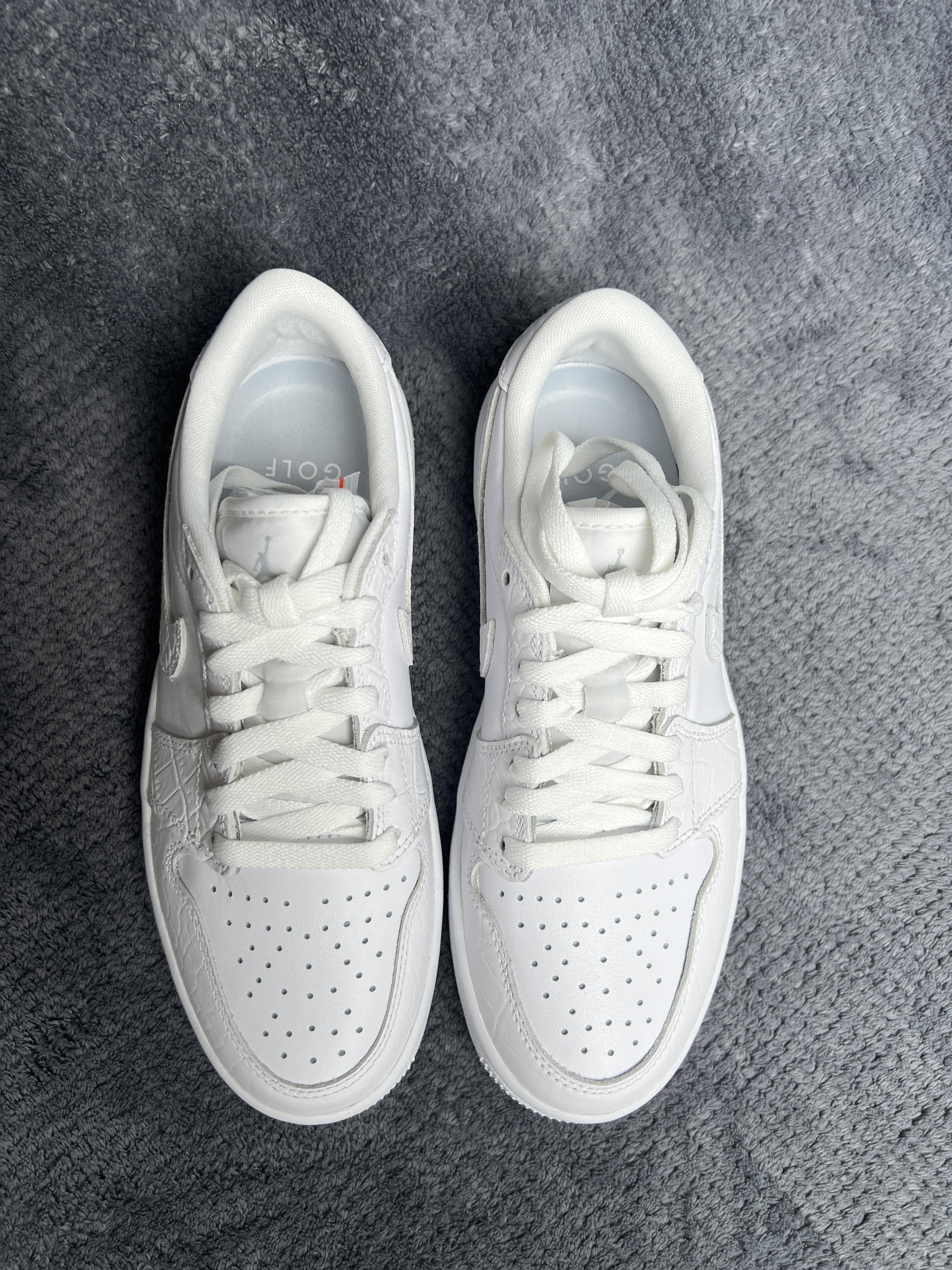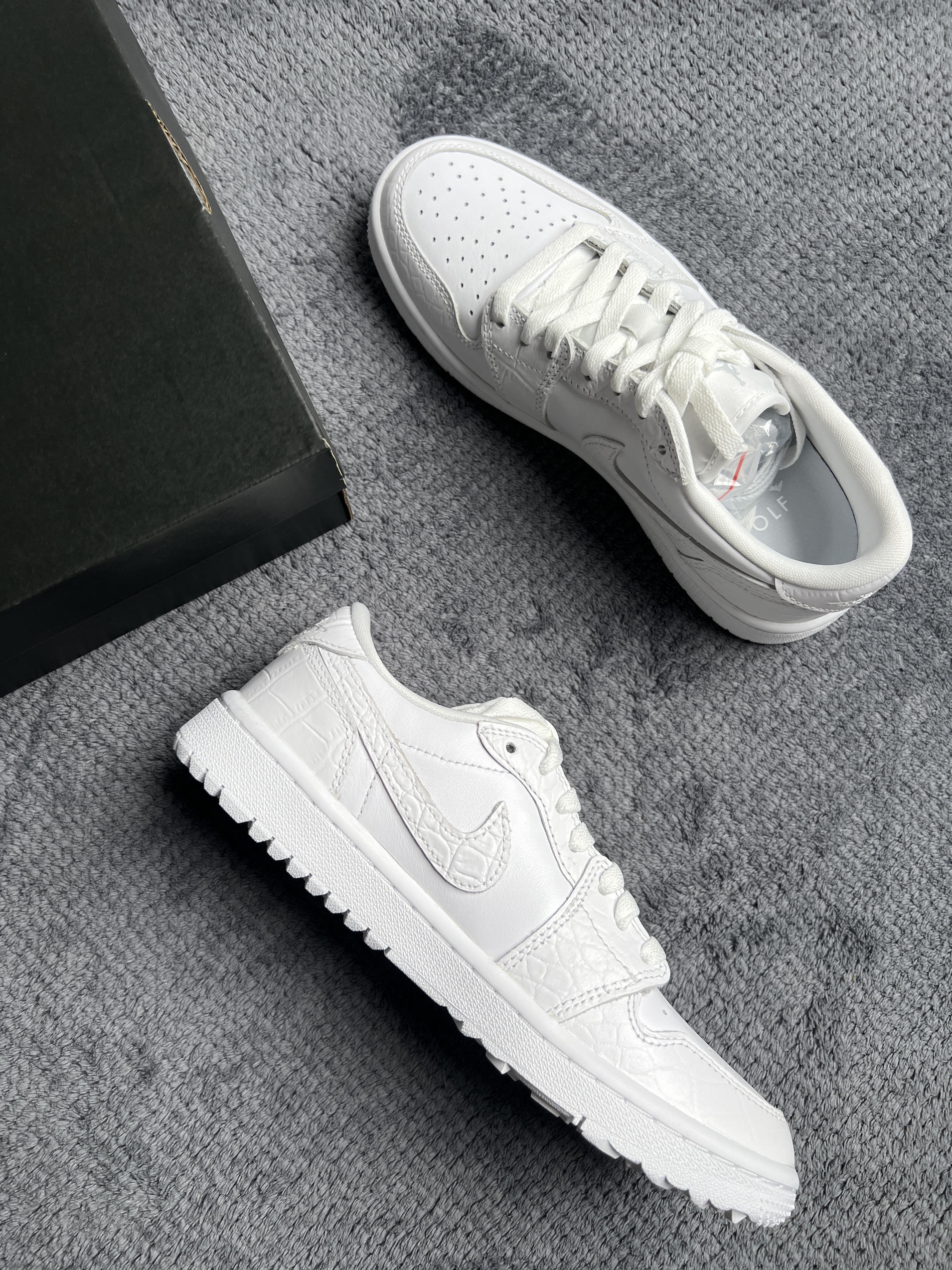 🤔🤔🤔钩子这两年好像是在推golf鞋型,最近爆出最新倒钩联名是golf鞋型 🍀🍀🍀这双aj1 low golf配色方面 全鞋身为白色,中底和大底也均为白色。这个白色是那种纯白色。配色方面干净百搭,小白鞋=随便搭 🍀🍀🍀材质方面 全鞋身牛皮革材质,框架也为牛皮革做成了鳄鱼皮纹,很有质感。上脚舒适易打理。做工上虽然是国内代工的,不过溢胶也是有的。脚感上aj1 low鞋型有小的气垫会比普通dunk和板鞋...