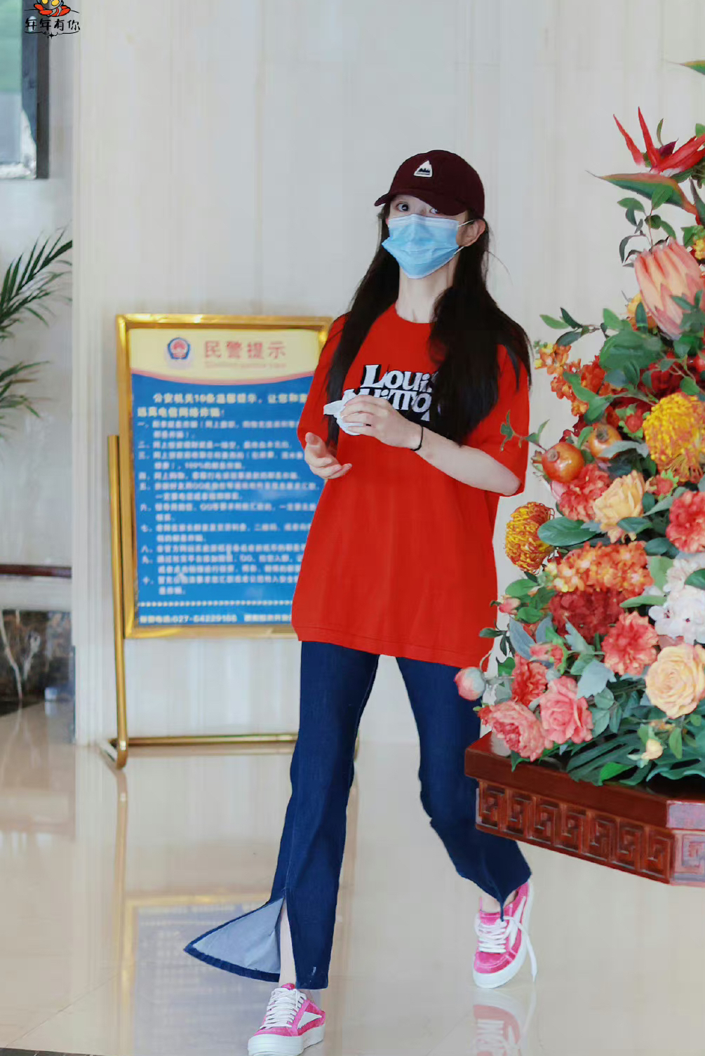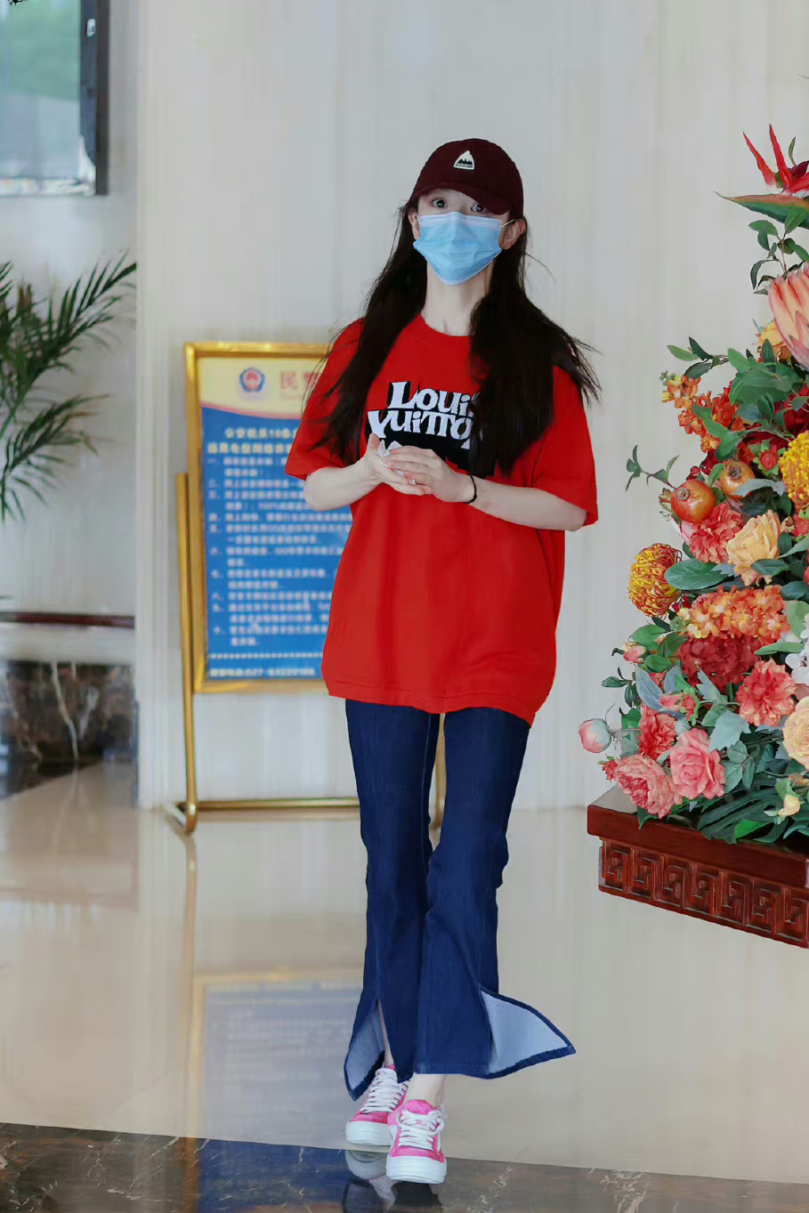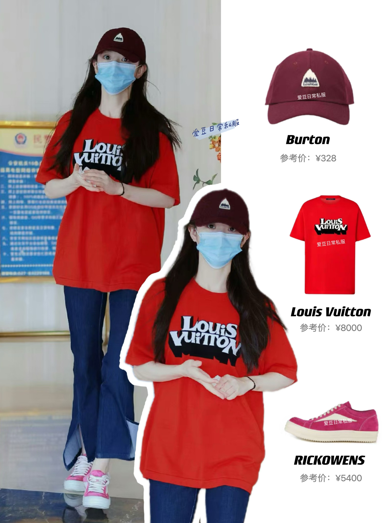 田曦薇更新了7月7日上班私服,酒红色棒球帽搭配大红色T恤,下搭凯叉牛仔裤,显瘦又休闲的一套look,元气满满的小田,上班快乐! 棒球帽:BURTON 上衣:Louis Vuitton 鞋子:RICKOWENS