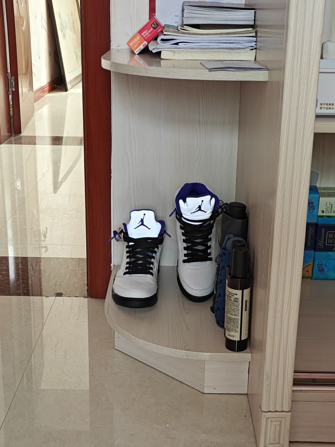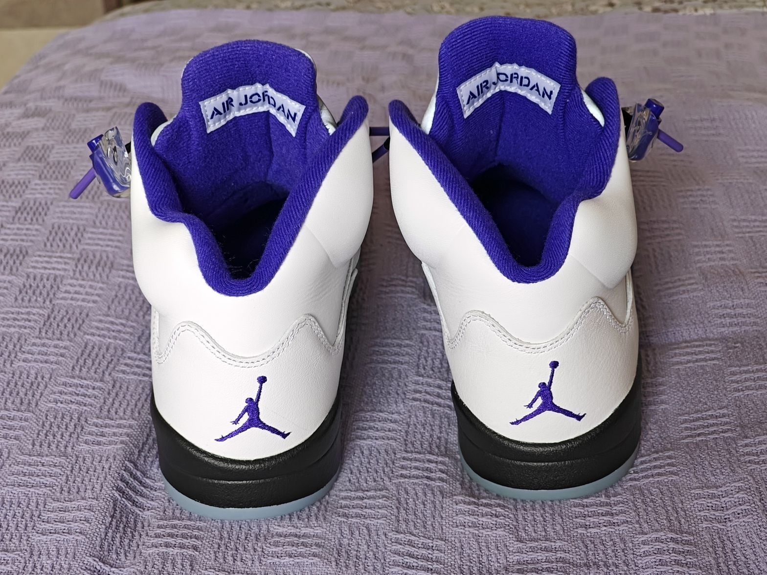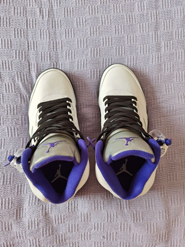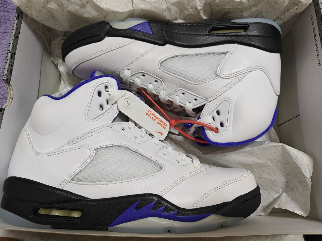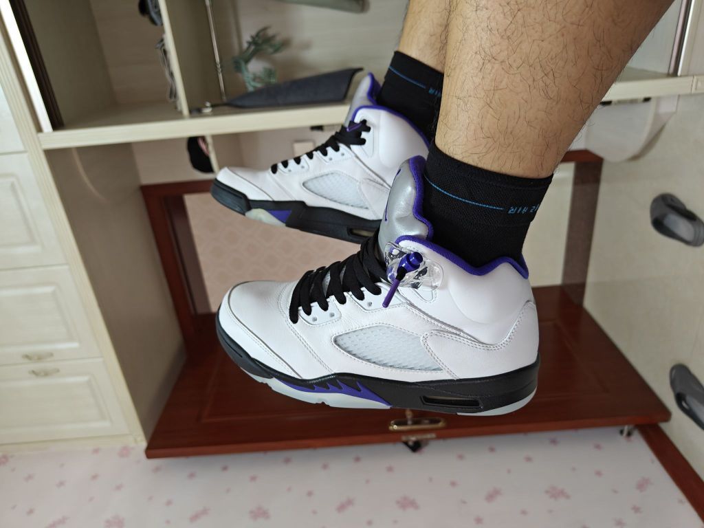 aj5康扣换上黑色紫头鞋带也是非常的炸裂,码数很正,但是刚买回来会有点夹脚踝,穿几天穿开就好了。5代正代还是非常耐造的!
