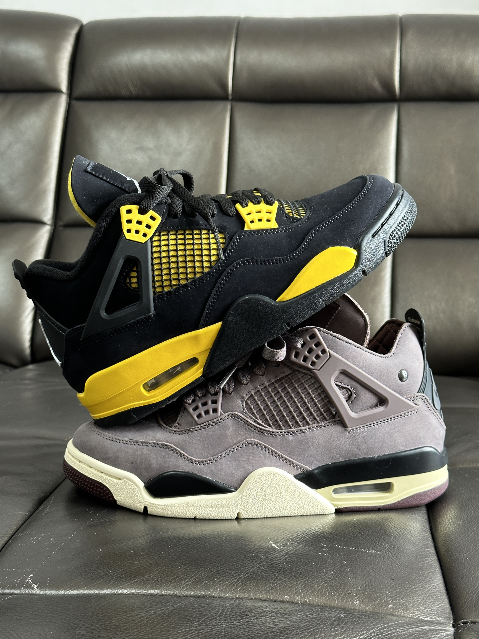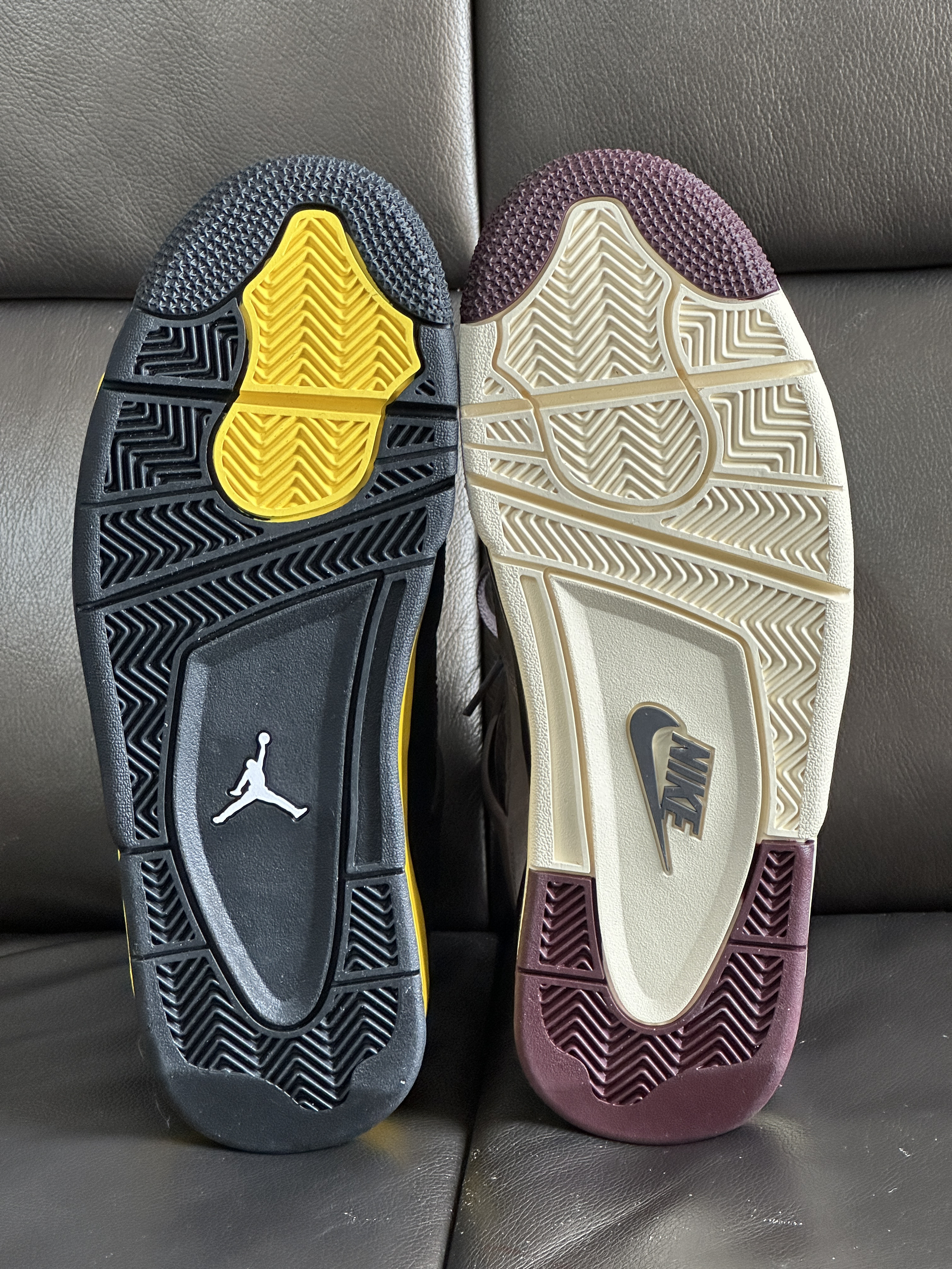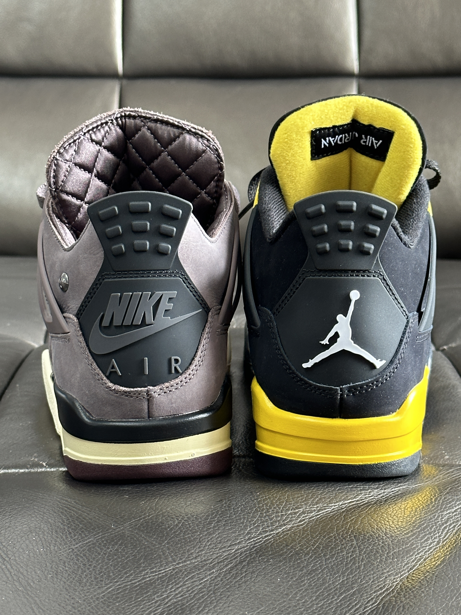 ▶两双都是麂皮的AJ4质感真的很出众!你更喜欢哪双? ▶AJ4雷公除了黑色麂皮容易粘灰以外好像没什么缺点!上脚太好看啦!加入的黄色点缀没有给人很突兀的感觉很赞! AJ4深酒红这双鞋值得细细品味,AMM联名款 细节堪称完美!菱形格的内衬和鞋垫让它可以伴你四季! ▶尺码方面:雷公标准,AMM偏小需要买大半码;